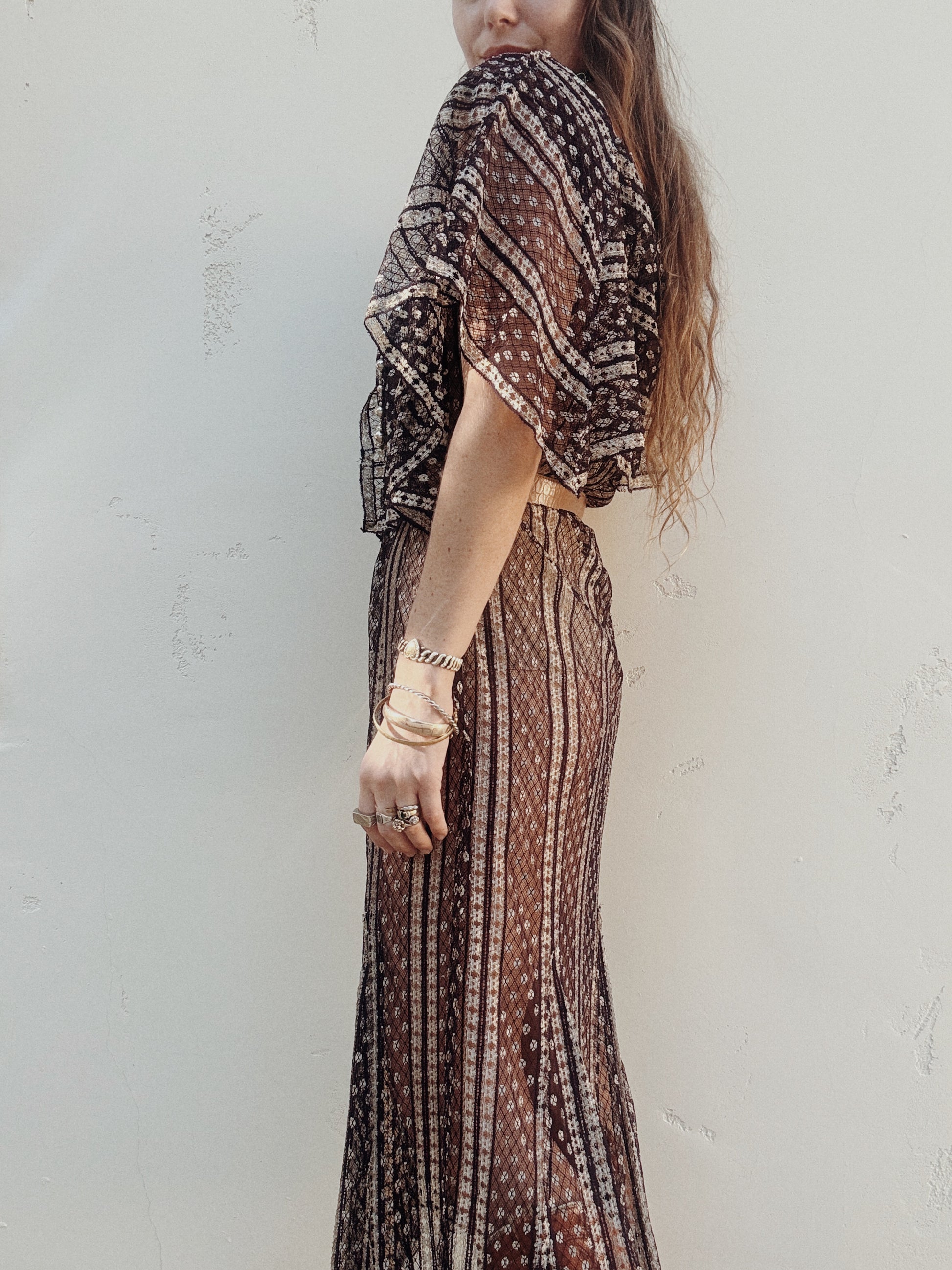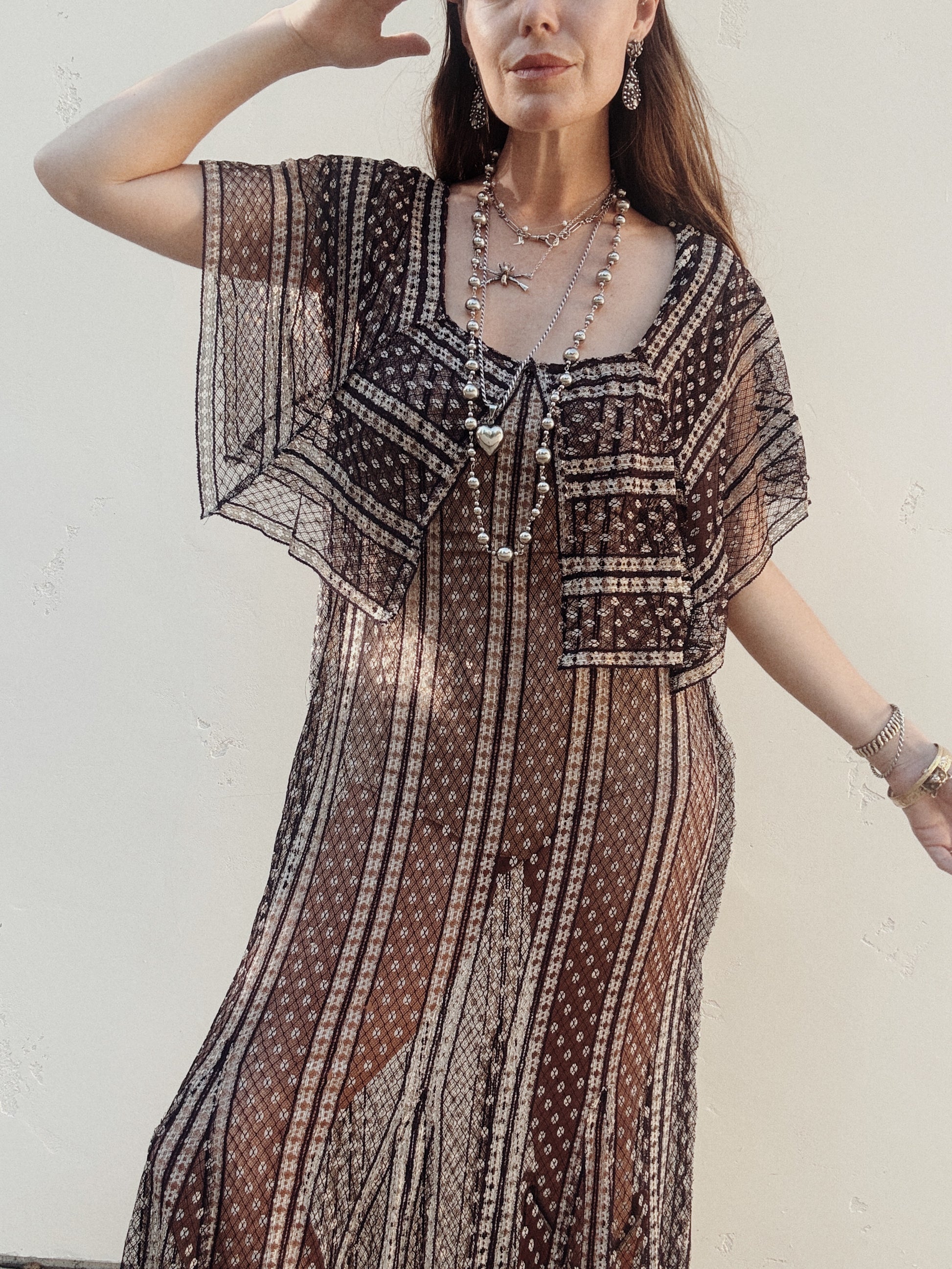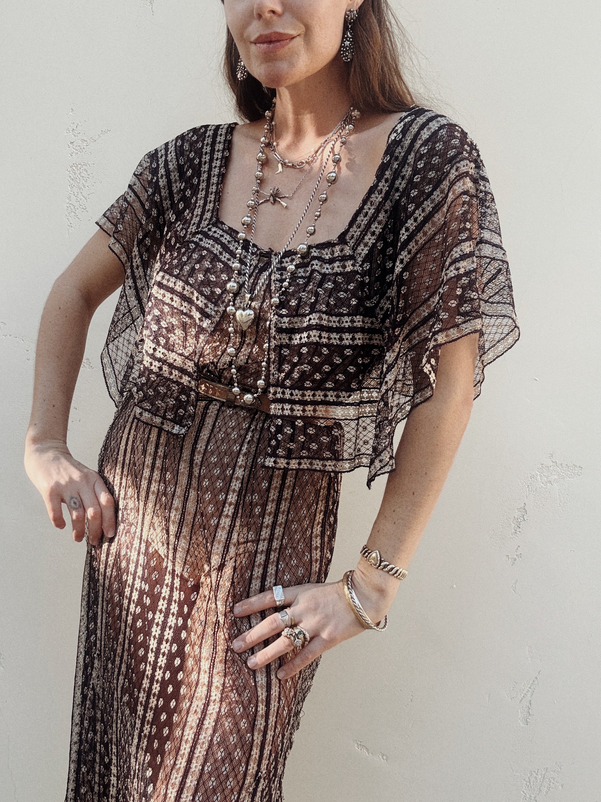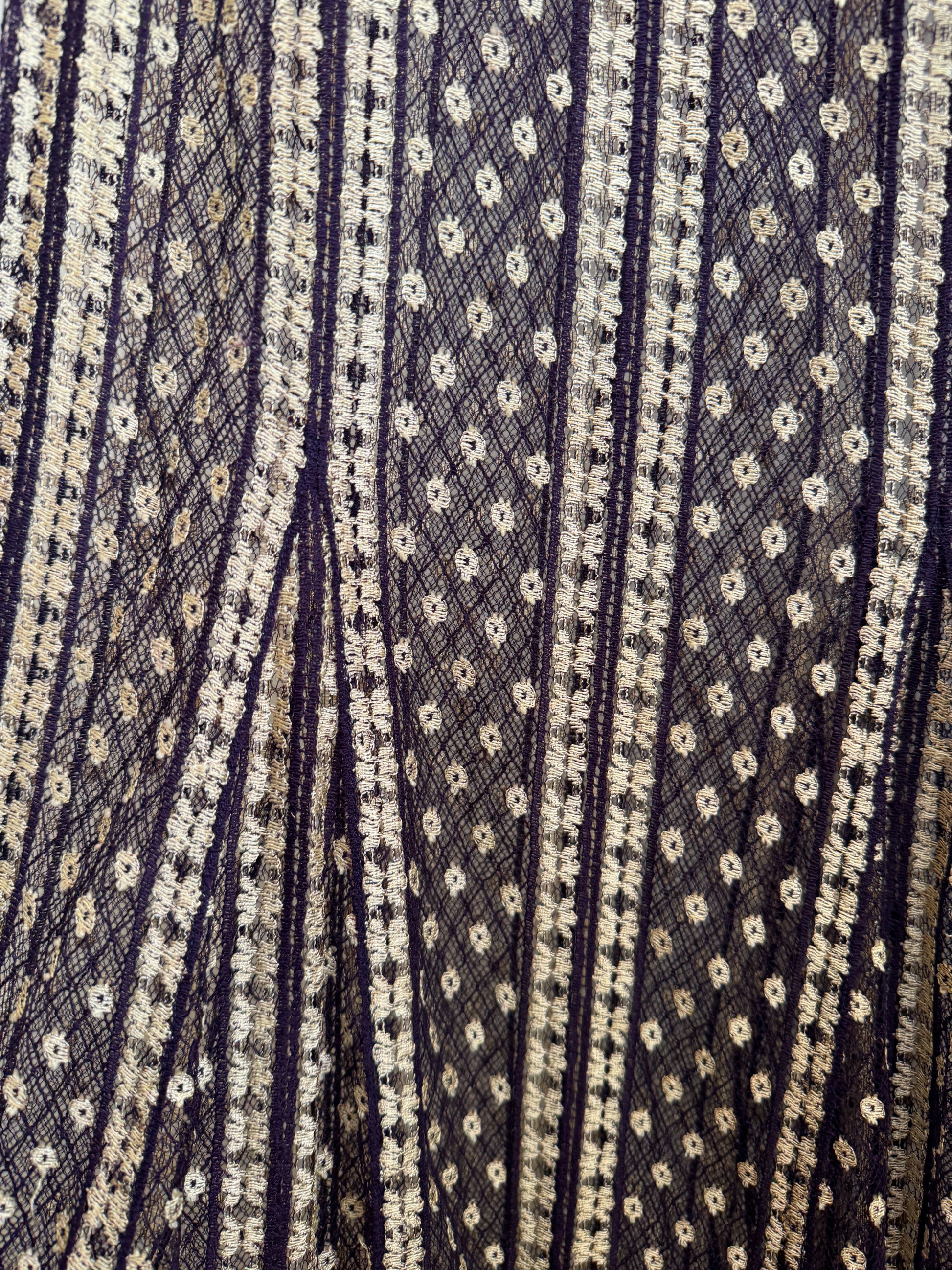 Absolutely lovely, 1920s/30s cusp dress of purple net and cream detail. Features the most fabulous, dramatic, large collar or caplet. When the arms are extended, they almost look like webs! In a more open size. Can fit up to a large, but can also be cinched down with a belt to fit smaller. There is give in the fabric, which will make it more durable when worn. Here, I am wearing over a nude bodysuit with tall cowboy boots and a belt. Could also be worn over a slip, or a long slip skirt and bralette.