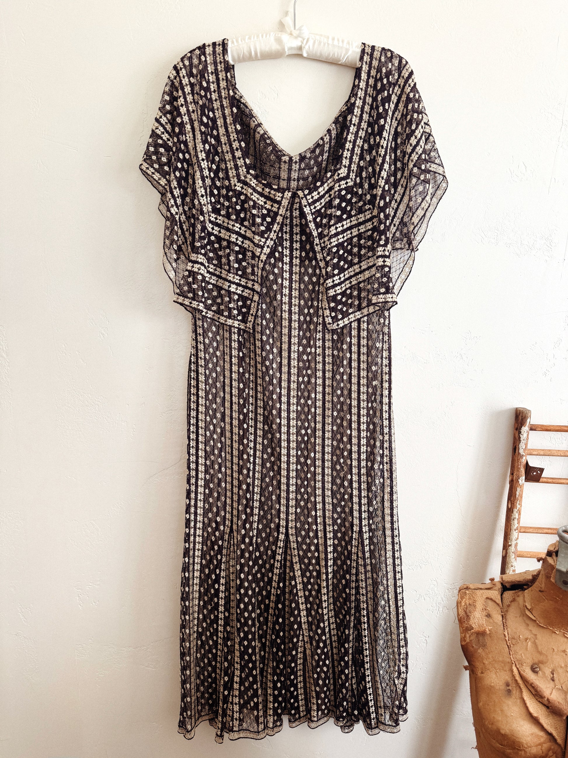 1920s/30s Purple + Cream Net Dress w/ Large Caplet Collar- M-L
