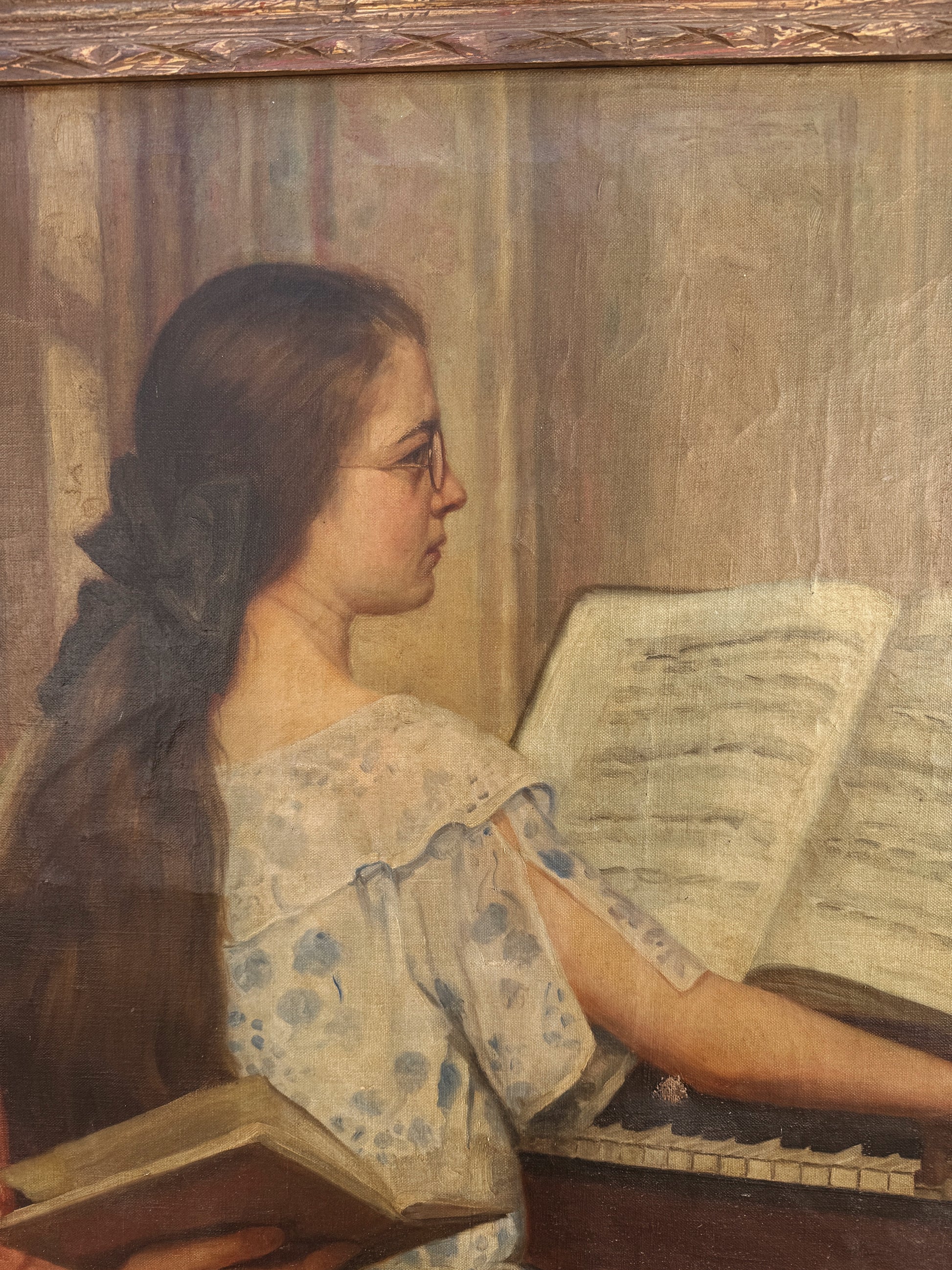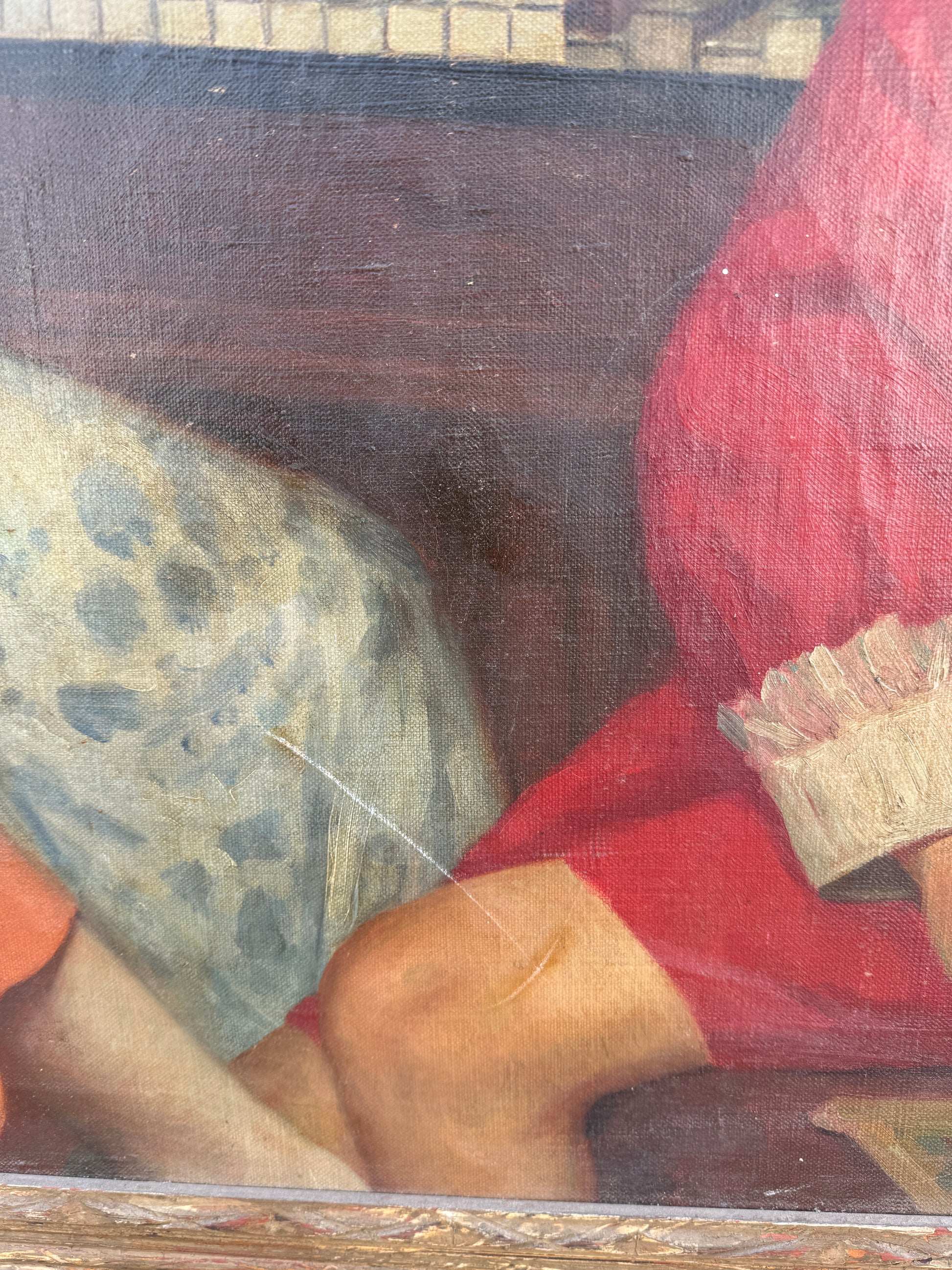 Absolutely magnificent, (and gigantic), 1920s large framed oil painting of a young family. There is so much to say about this piece. From the sheer size, to the delightful way that the light and shadows play off of the fabrics. From the delightful pastime each family member is partaking in, to the wonderful muted patina which shows its age and life it’s lived- this piece truly one of a kind and special.