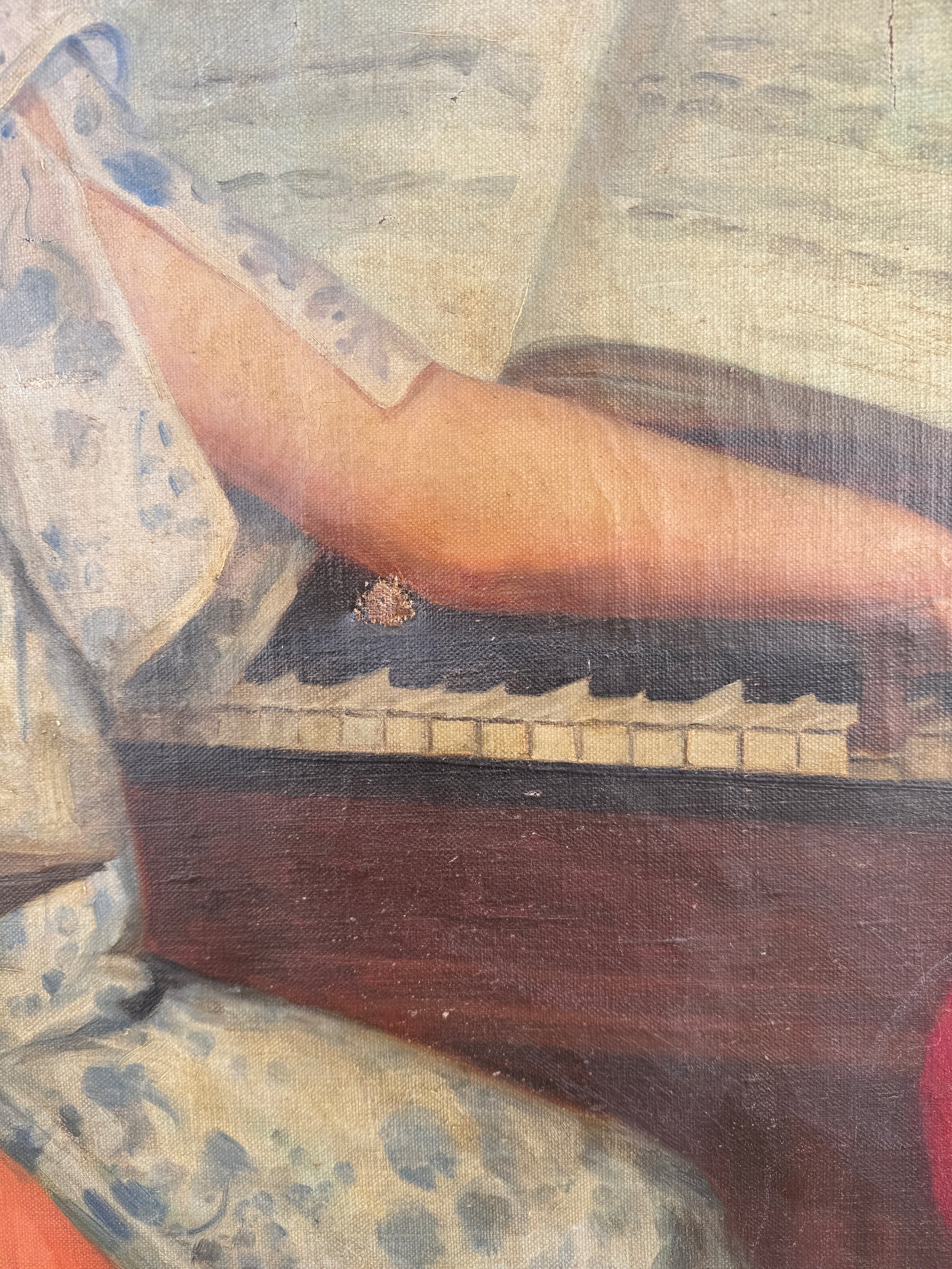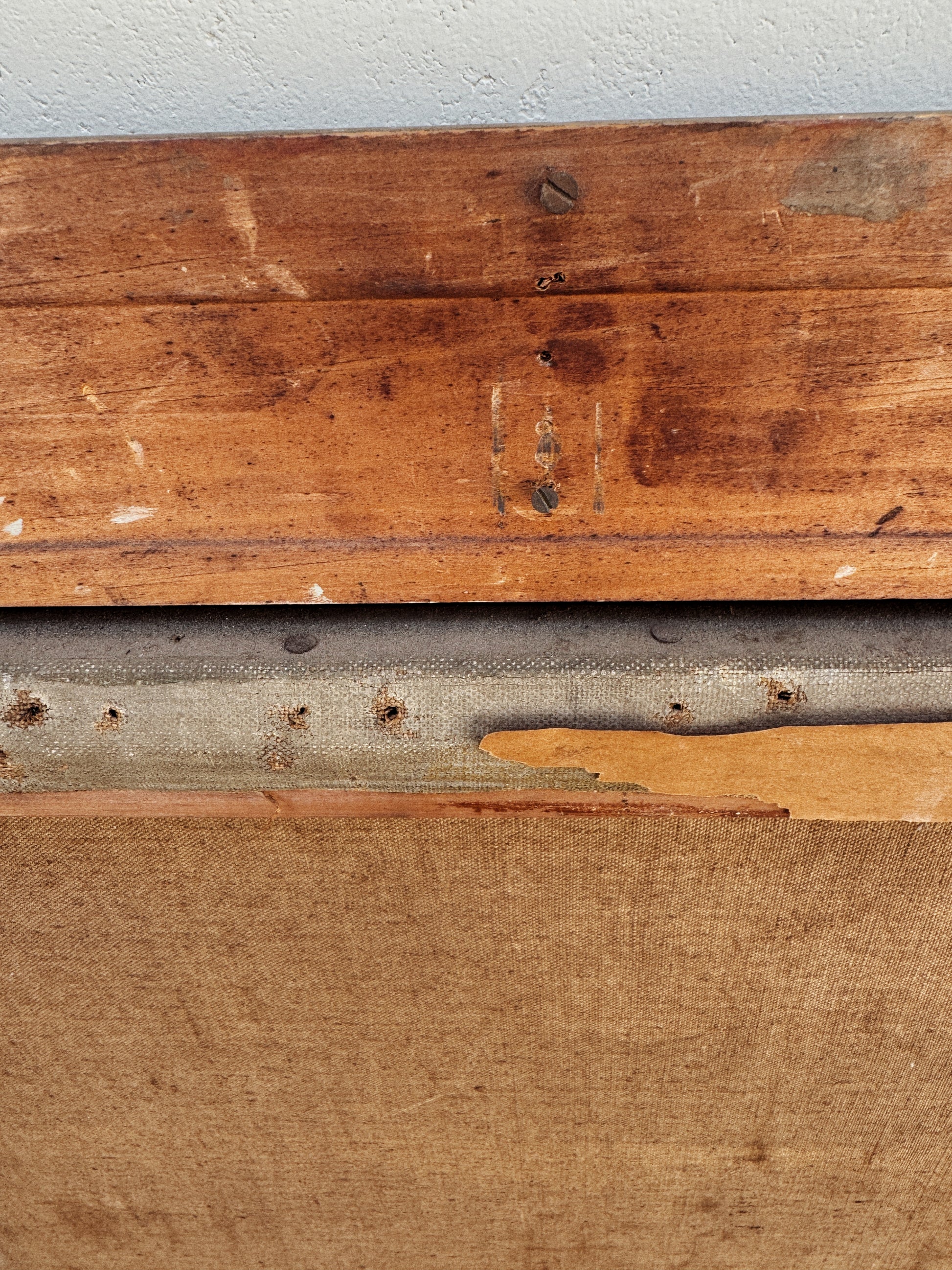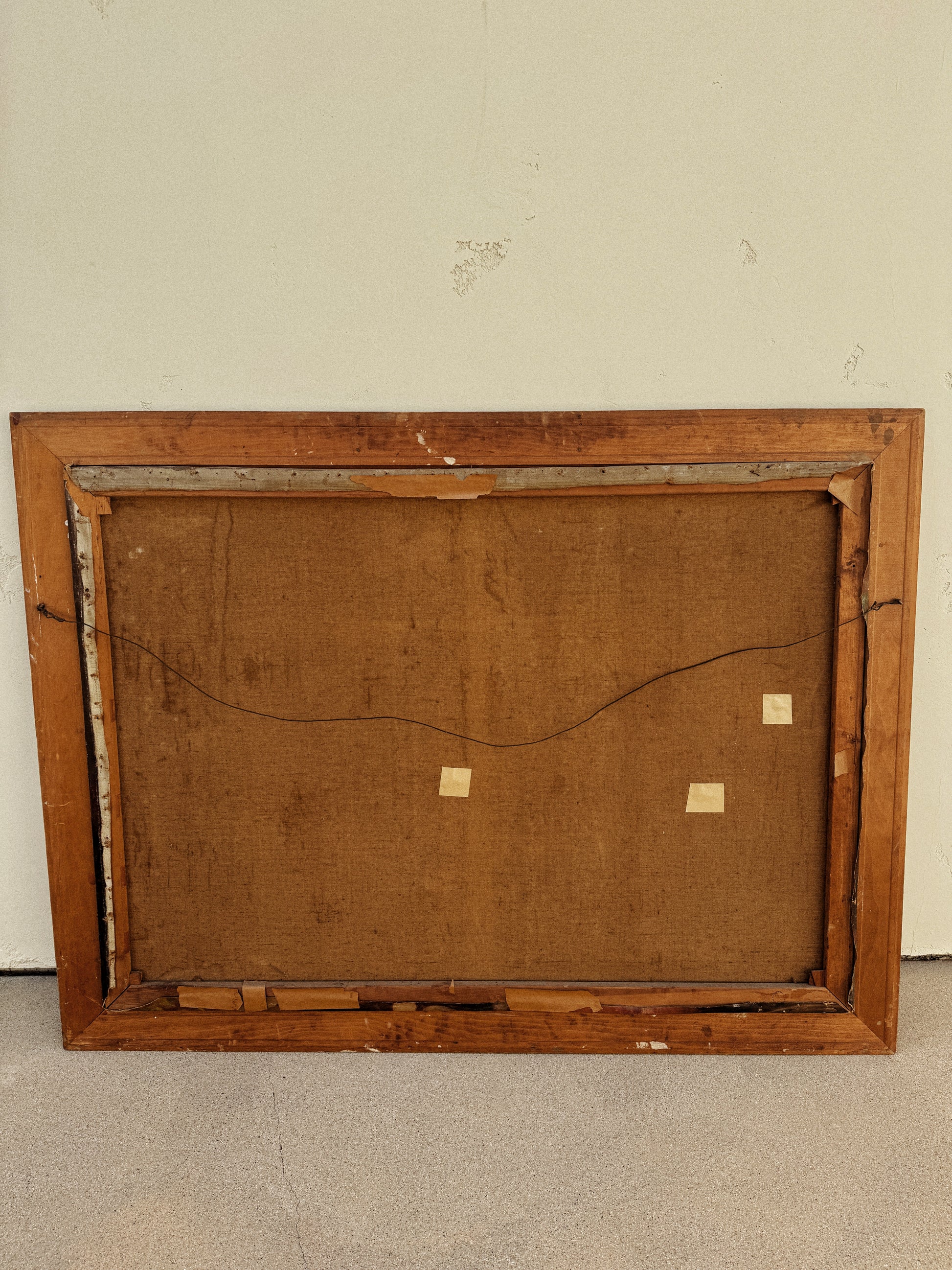 Medium is oil on stretched canvas. Presents beautifully though does have some holes that have been backed, and a few faint scratches. As well as some light paint loss. Could be cleaned further if desired, though I enjoy the muted tones. Or slightly restored. Would also look beautiful ‘as is’ once hung.