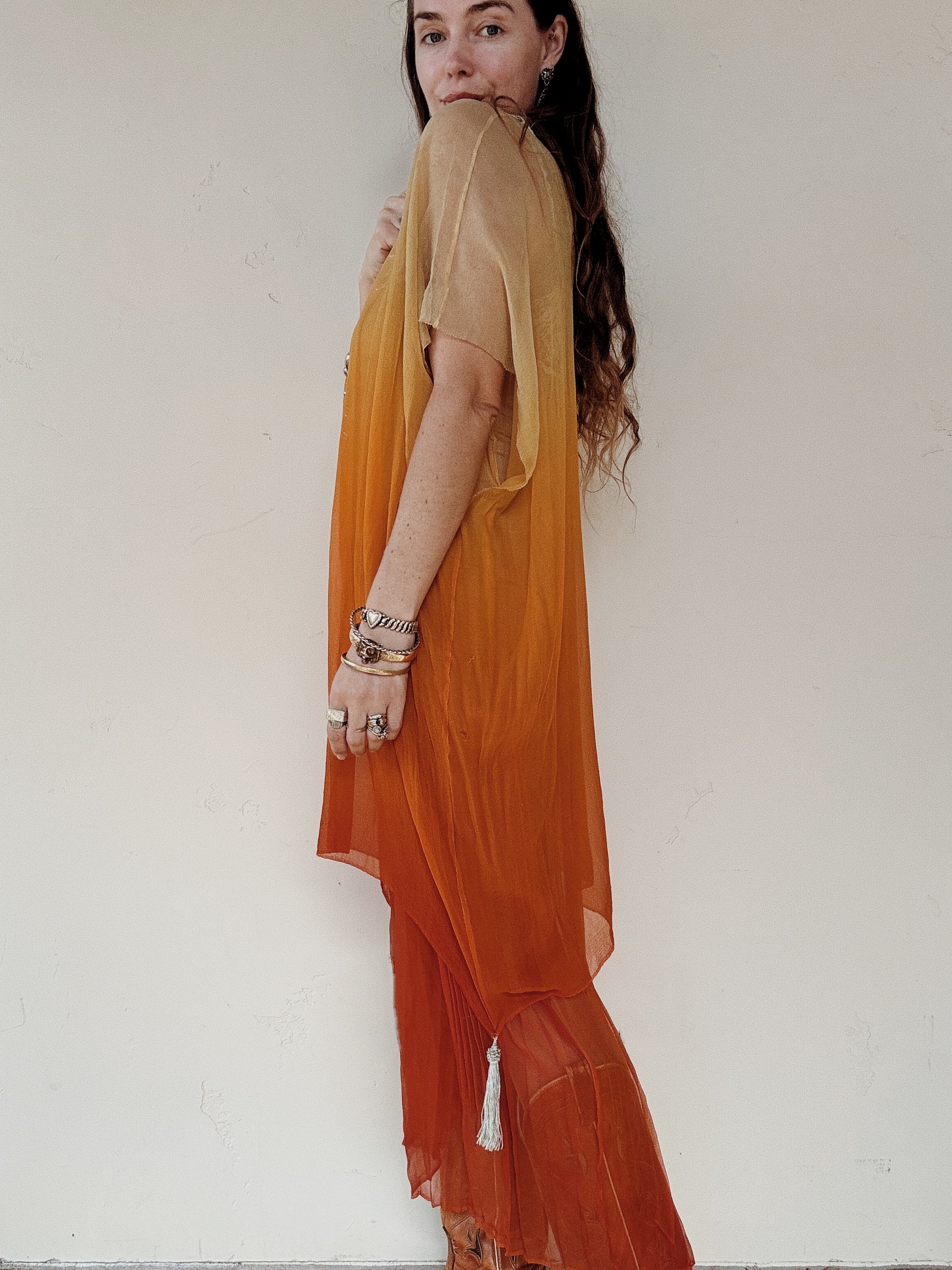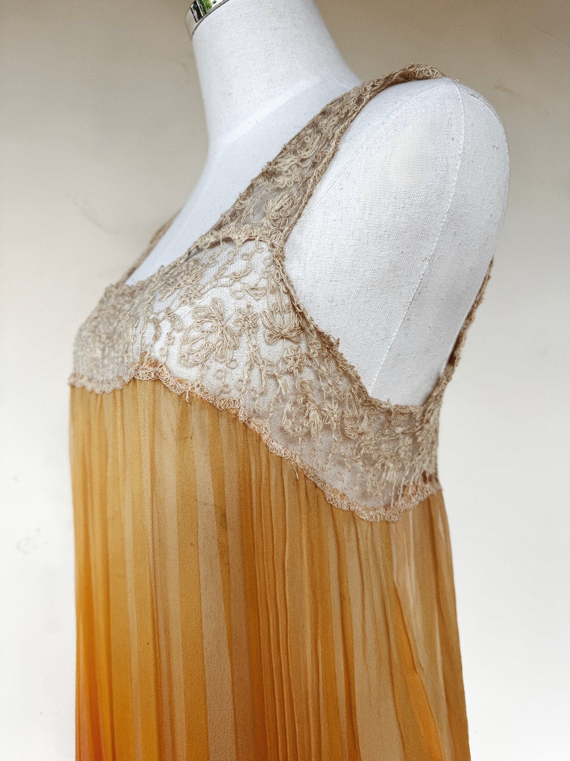Absolutely spectacular, 1920s two piece ensemble, in the most incredible, yellow and orange ombré silk chiffon. Comprised of a pleated slip dress with a net and lace neckline, and a stunning kaftan tunic atop. Kaftan tunic has two, baby blue silk tassles on each end to hold down the material, as well as a darling silk rose. This chic and elegant set can be worn together or apart as separates. Can also be cinched at the waist with a belt or sash.