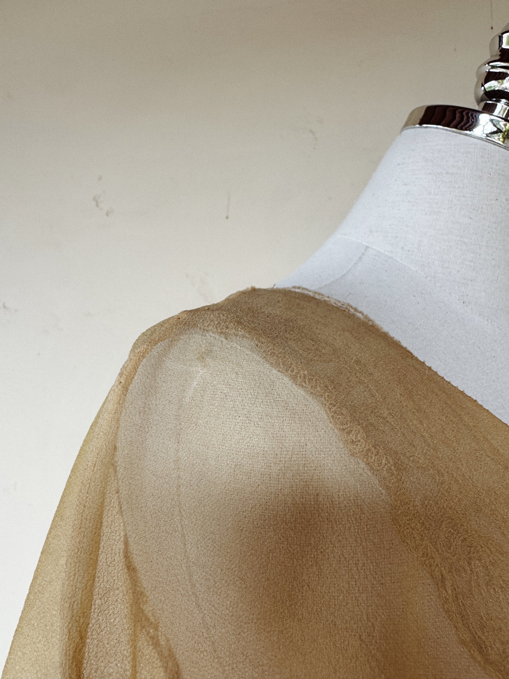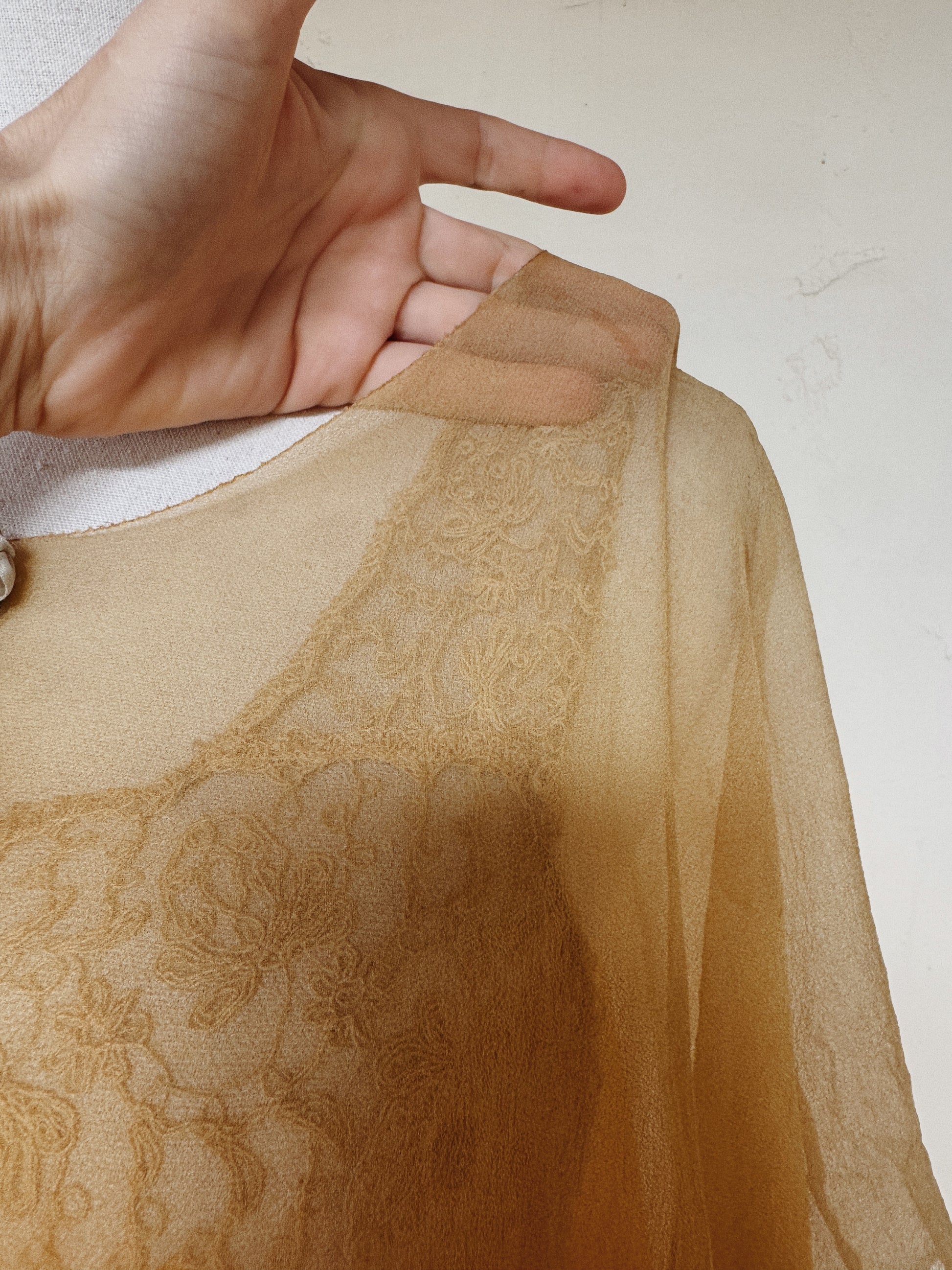 Condition is quite good for age, though does have a few minor flaws. Most notably, on the tunic, there is a faint watermark on the shoulder, and a small hole on the side near the tassel. For the slip, there are various minor and small marks and a few small pinholes. Lace does not seem to bare any holes as far as I can tell, but needless to say, should be worn with care. She really presents beautifully and chiffon is in strong condition. A rare and unique piece that doesn’t come around often.
