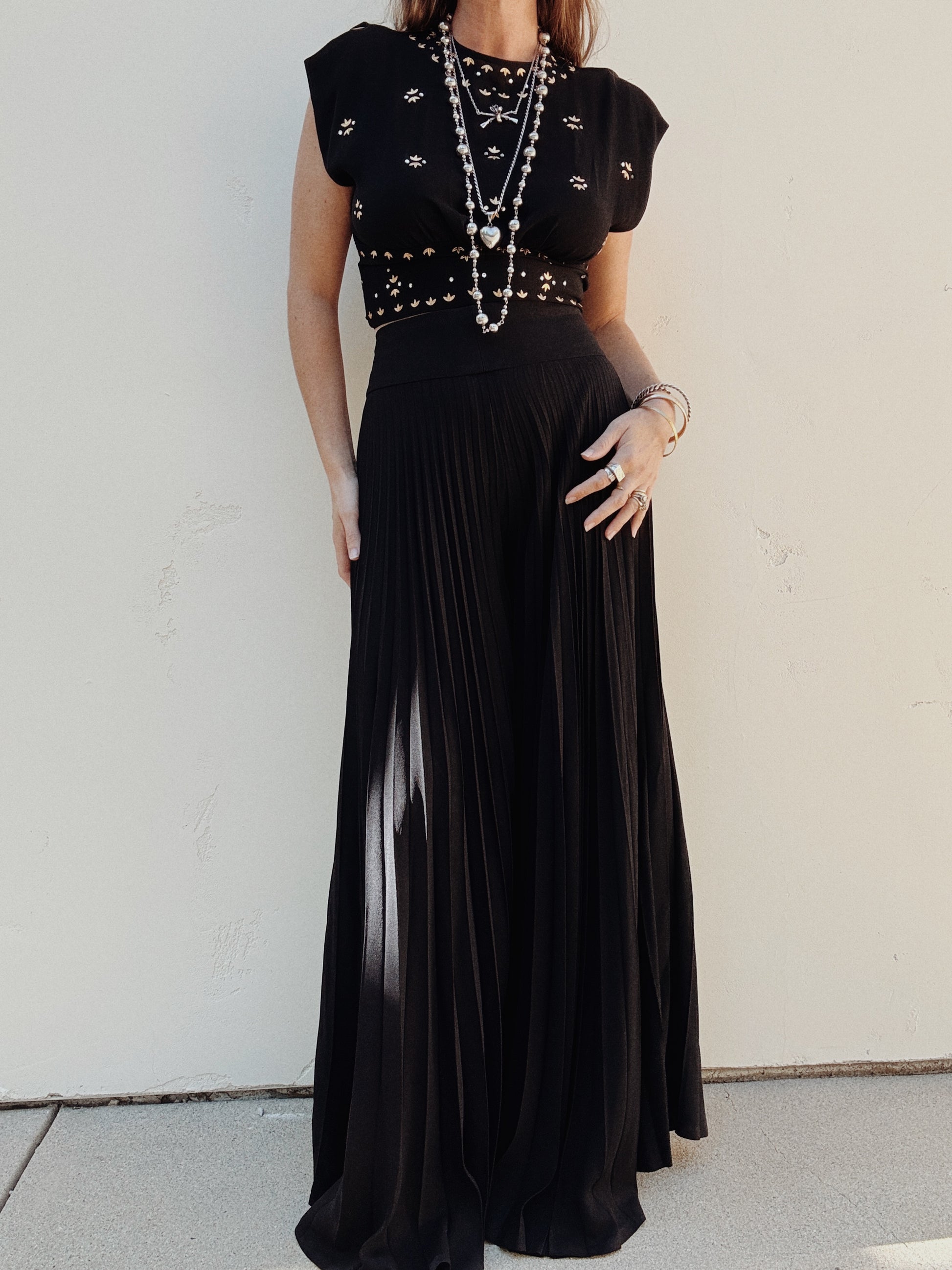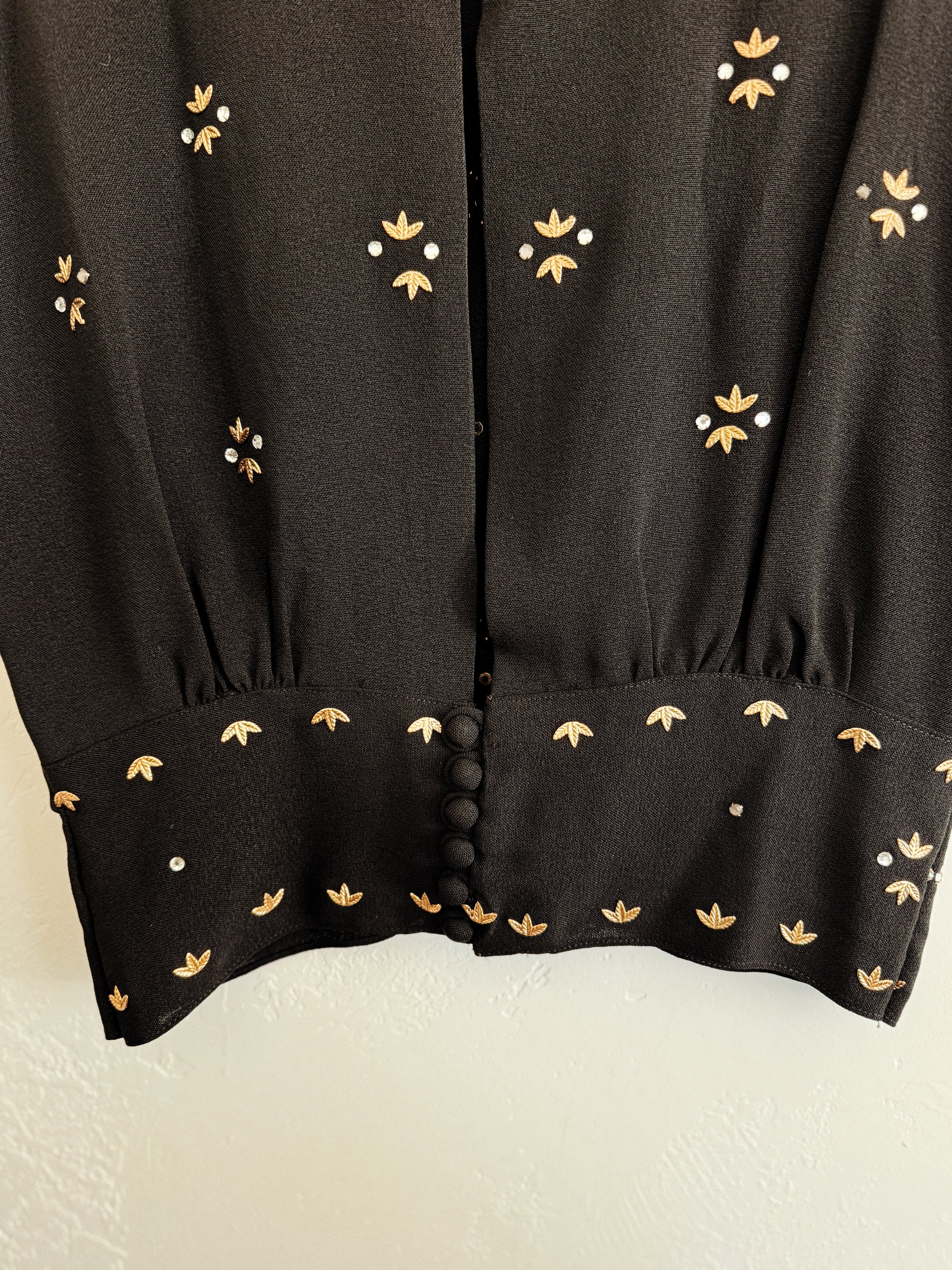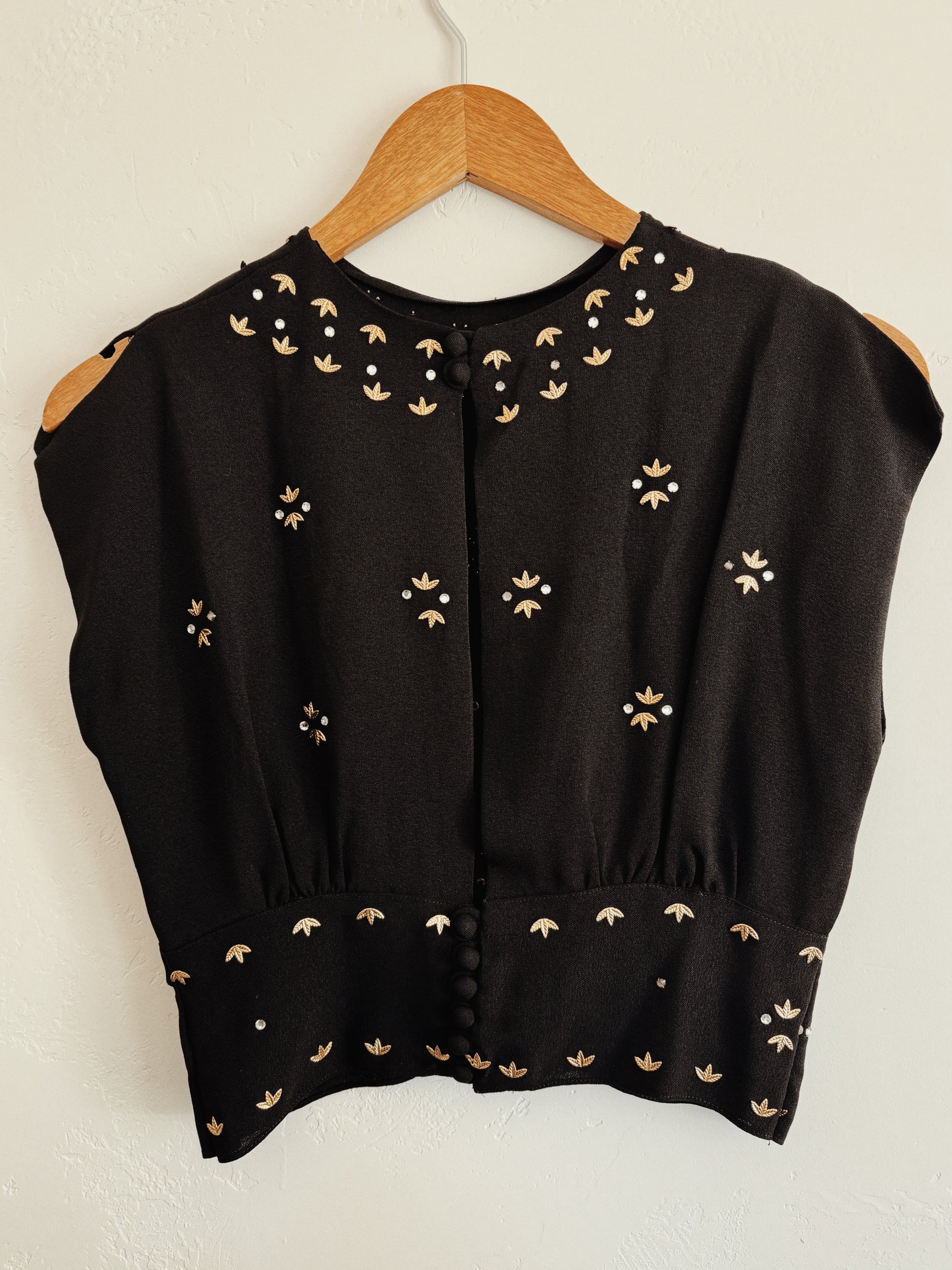 1930s Black Leaf Stud + Rhinestone Cropped Crepe Blouse- S/M