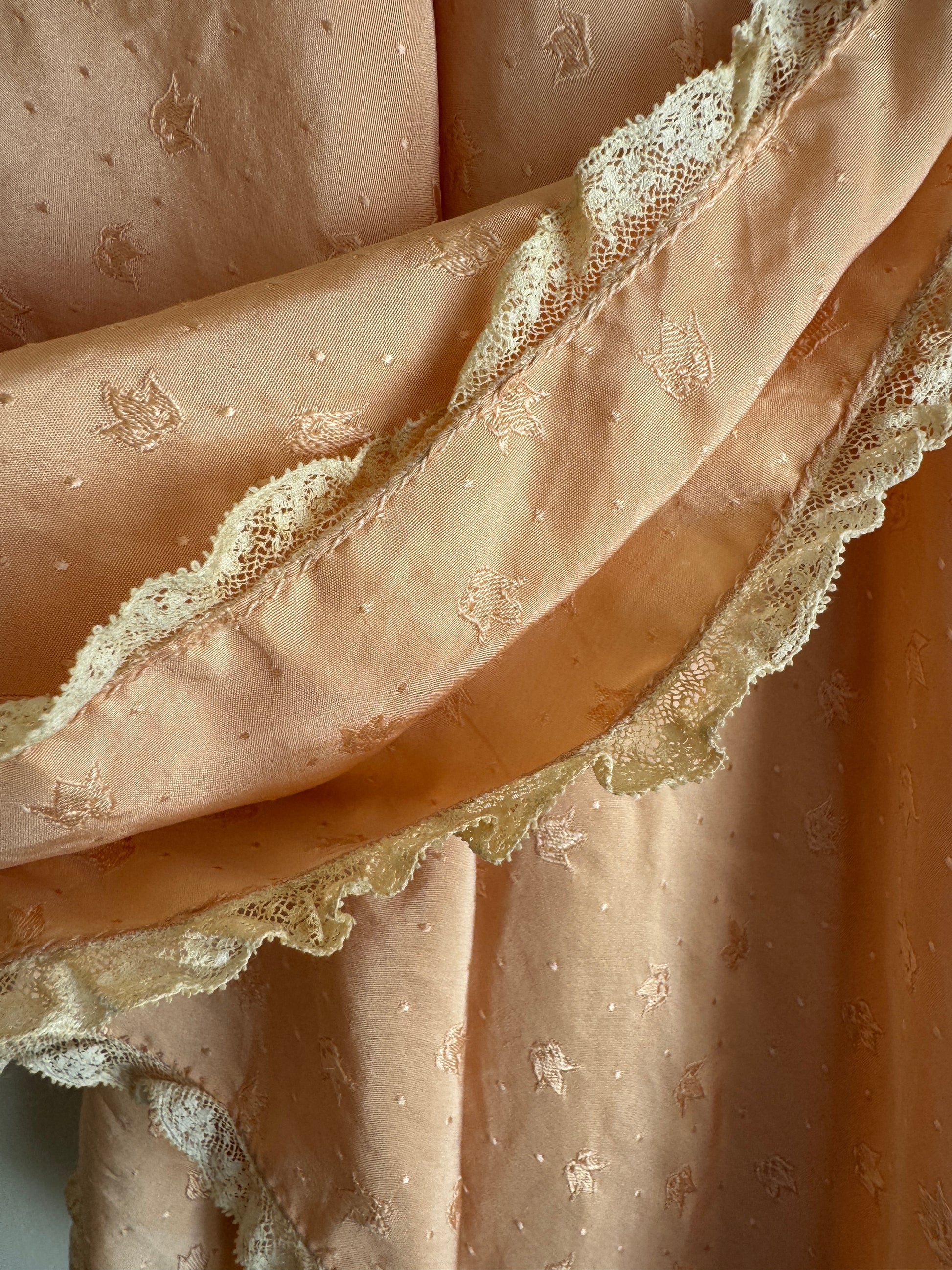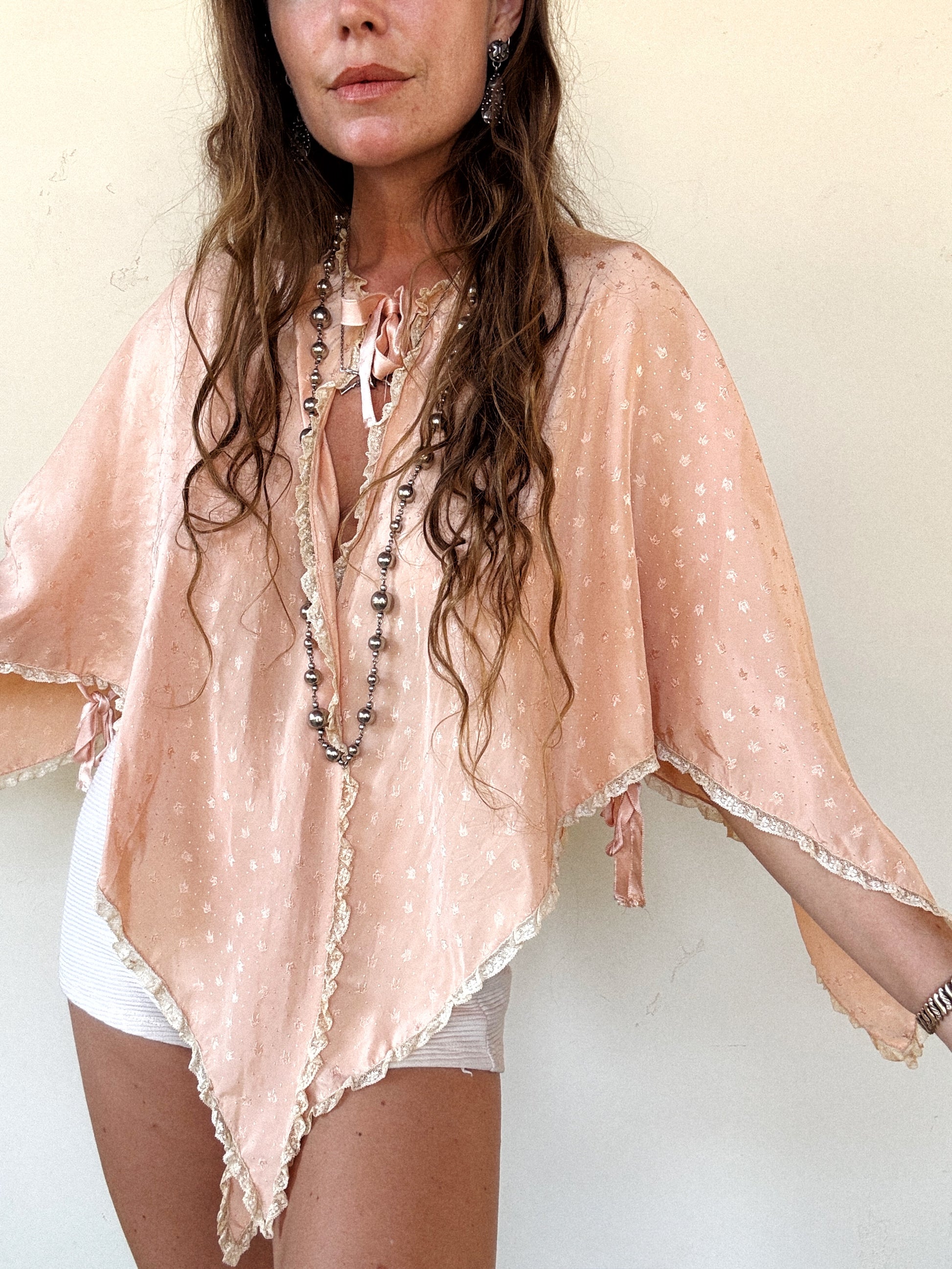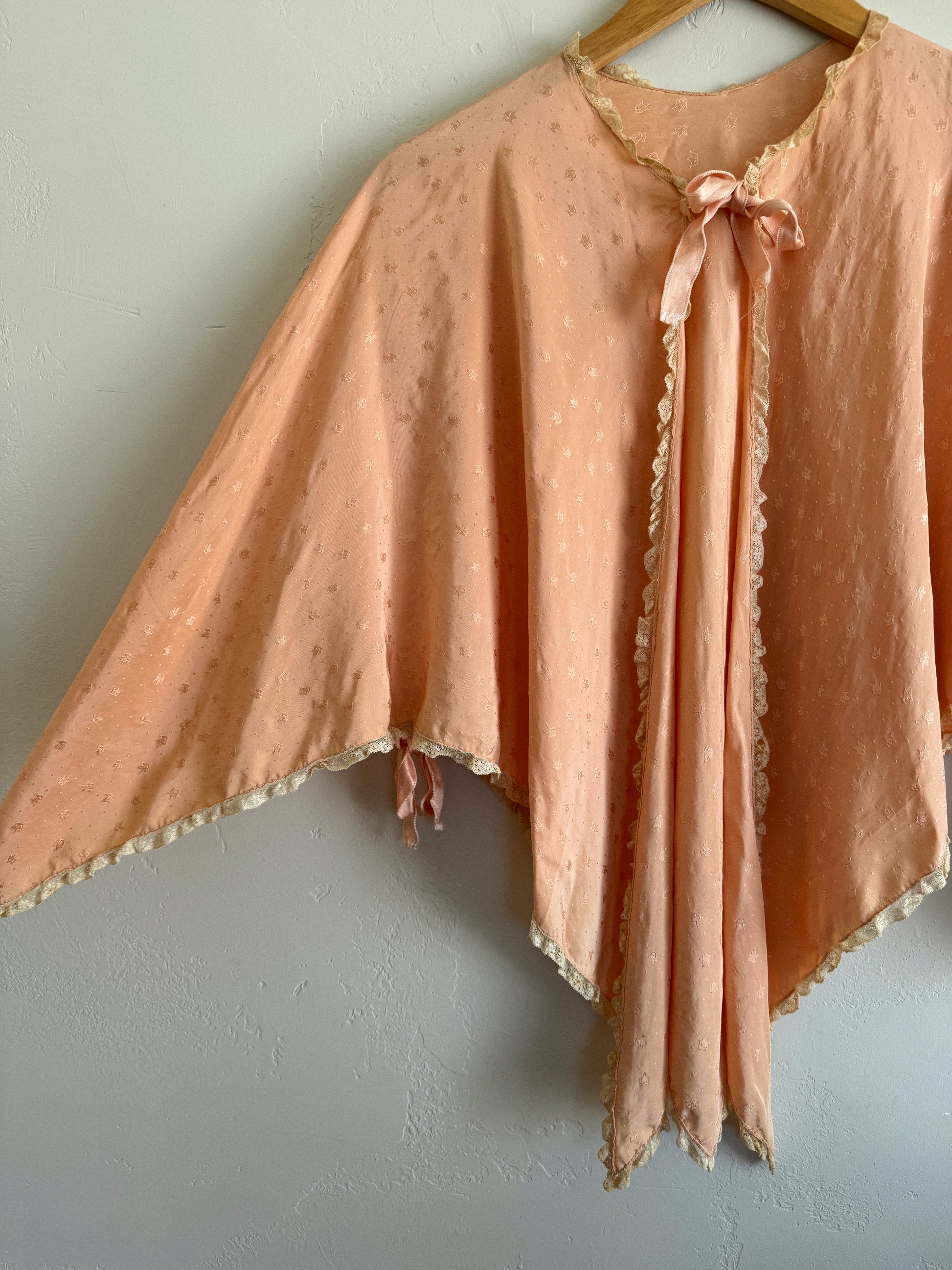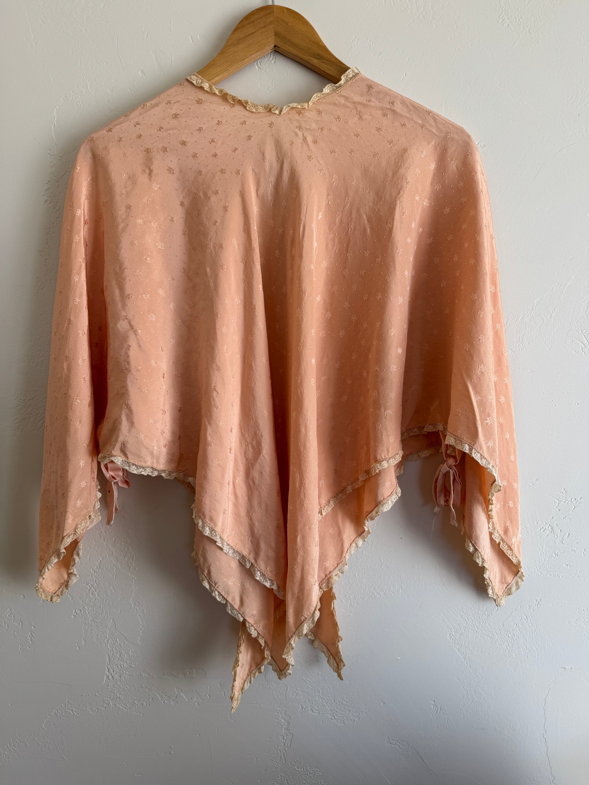 Lovely, 1930s dusty rose bed jacket with the most fabulous hanker chief hemline. Dramatic and deep angular cuts that are brought together by satin ribbons beneath the arms and at the neckline. Made of a soft and lustrous silk brocade, there could be a bit of rayon in the weave as well. Almost entirely hand sewn. Makes a lovely blouse over a bralette or camisole.