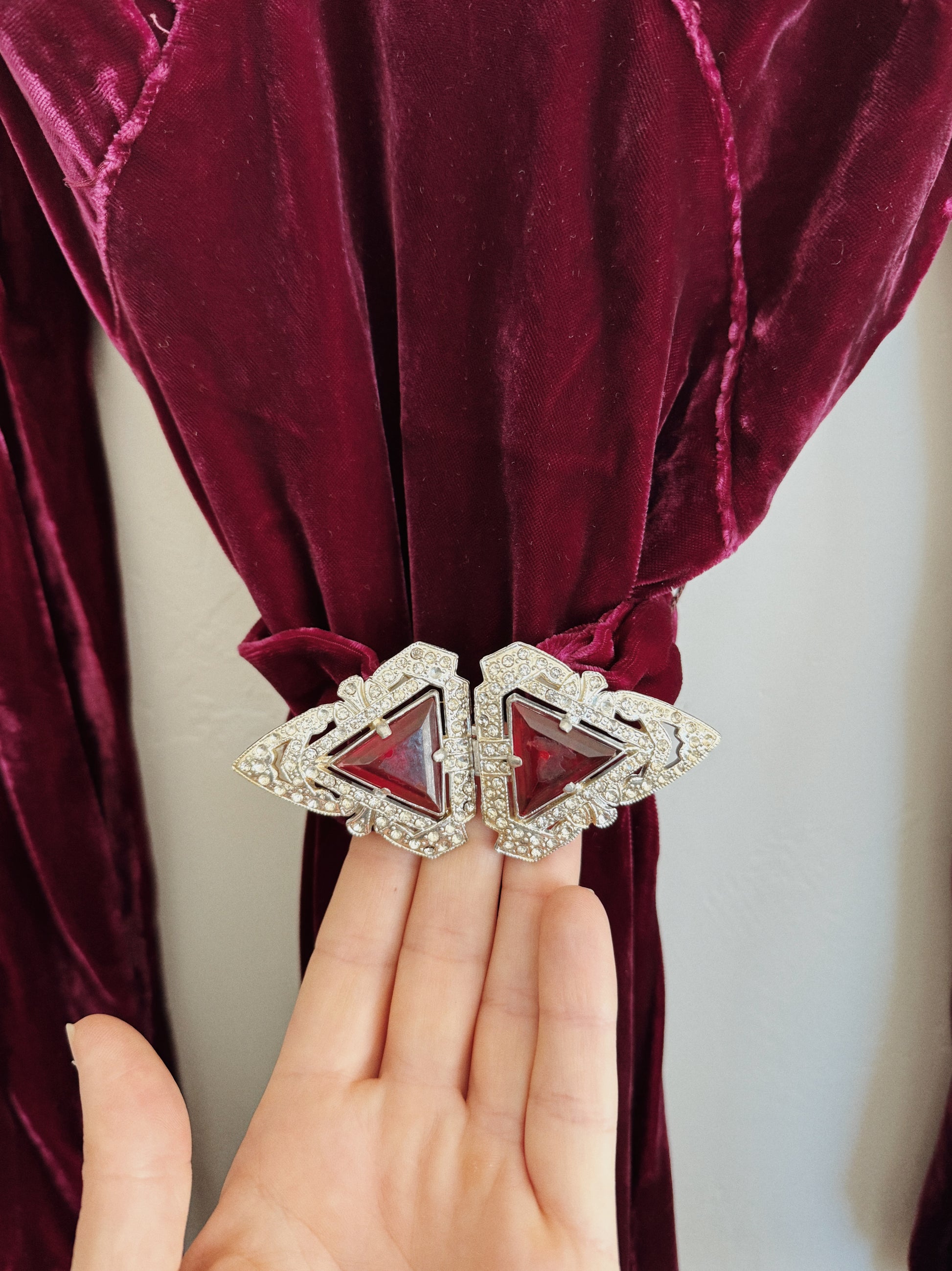 Step into luxury with this absolutely divine, 1930s mulberry purple, silk velvet gown with the most fabulous, ruched velvet balloon sleeves and collar. Cut on the bias, the silhouette of this dress is absolute perfection. Topped with a stunning, cranberry jeweled and rhinestone, deco belt, she is in excellent condition for age. There are a few missing rhinestones on the belt and the jeweled accent on the collar. However, since the silver tone backing is so reflective, it’s not noticeable when worn. Would make the perfect holiday or wedding guest piece.