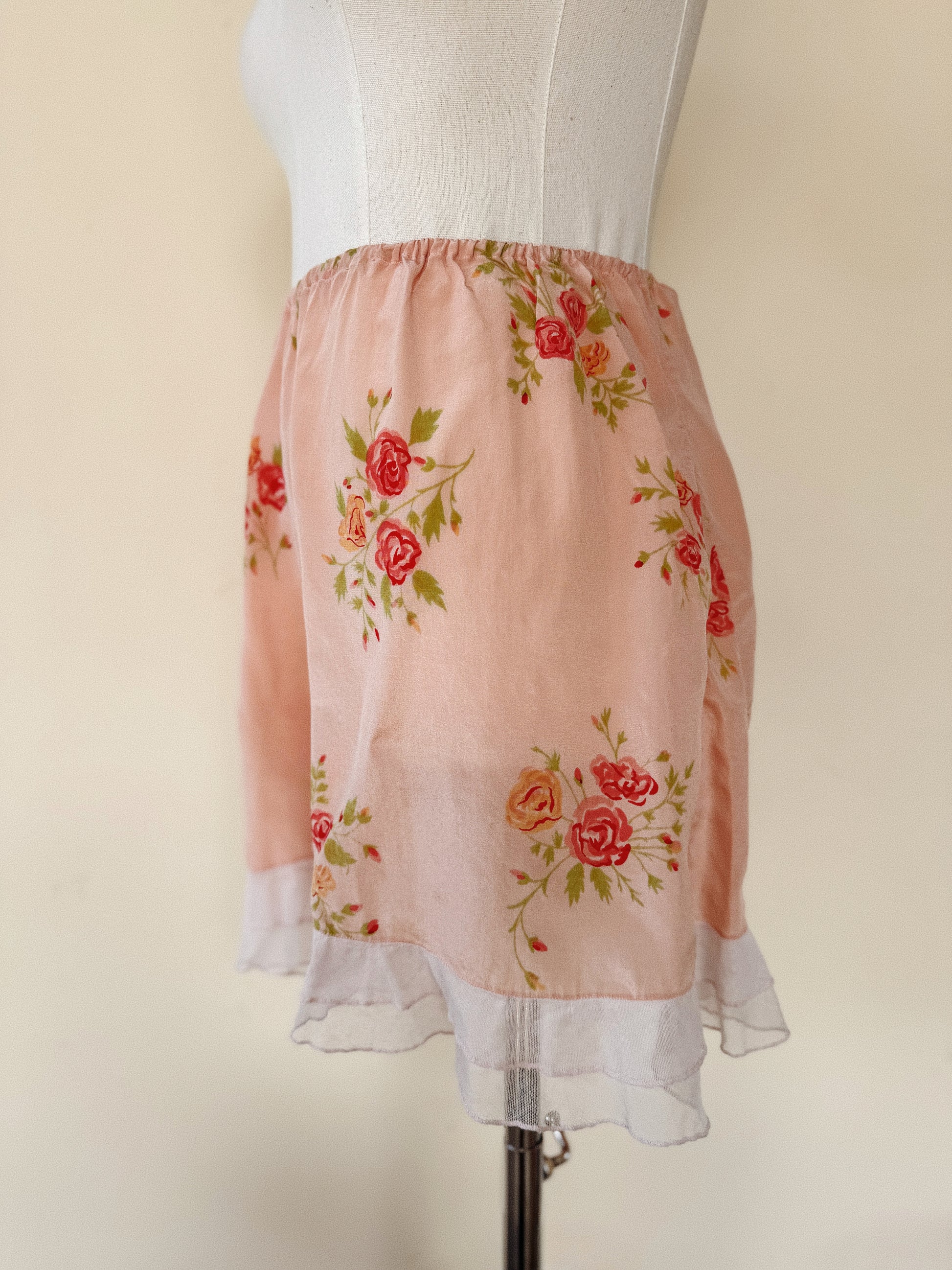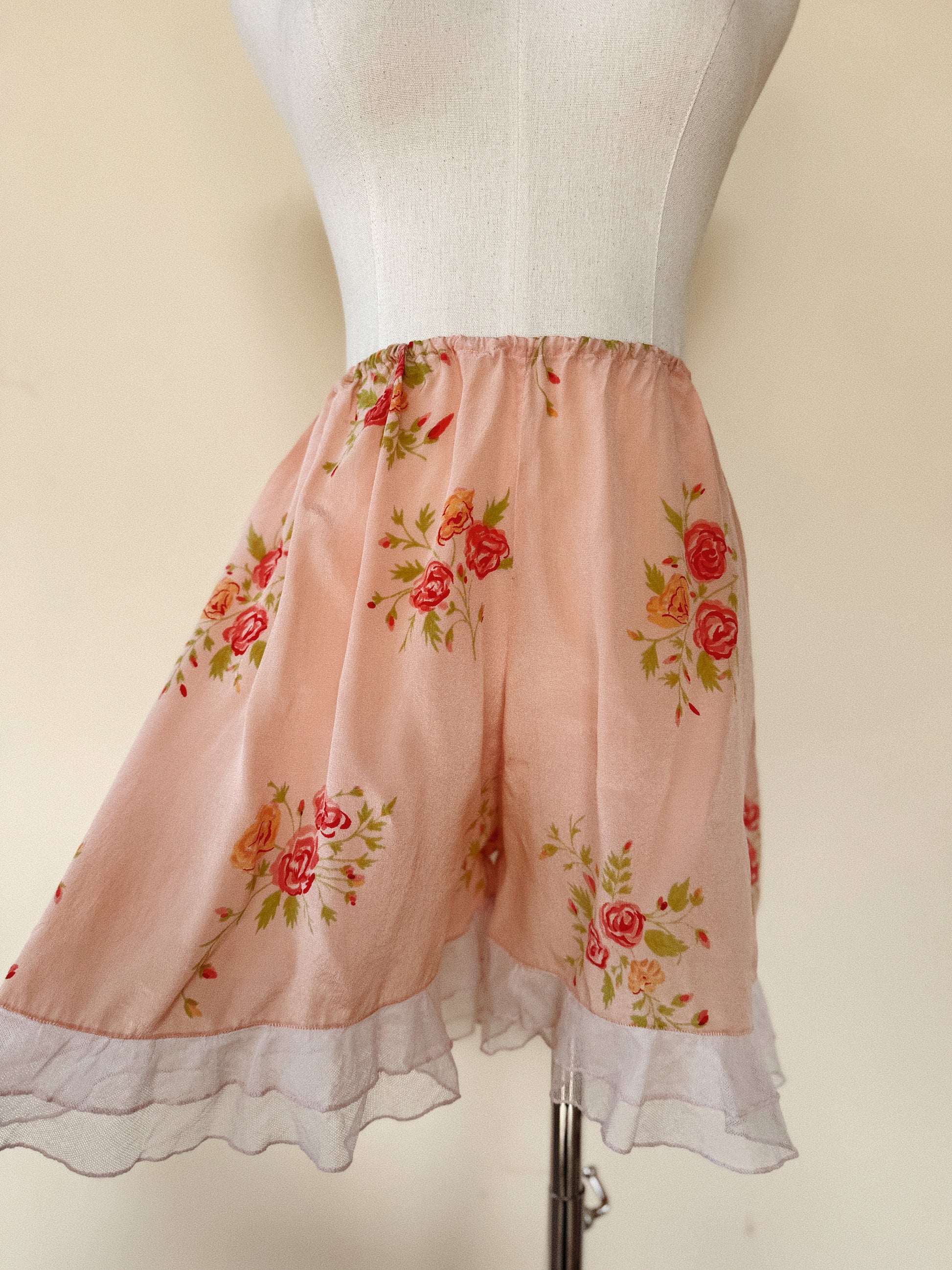 1930s Peach Silk Floral Tap Shorts w/ Net Ruffled Hem- S/M