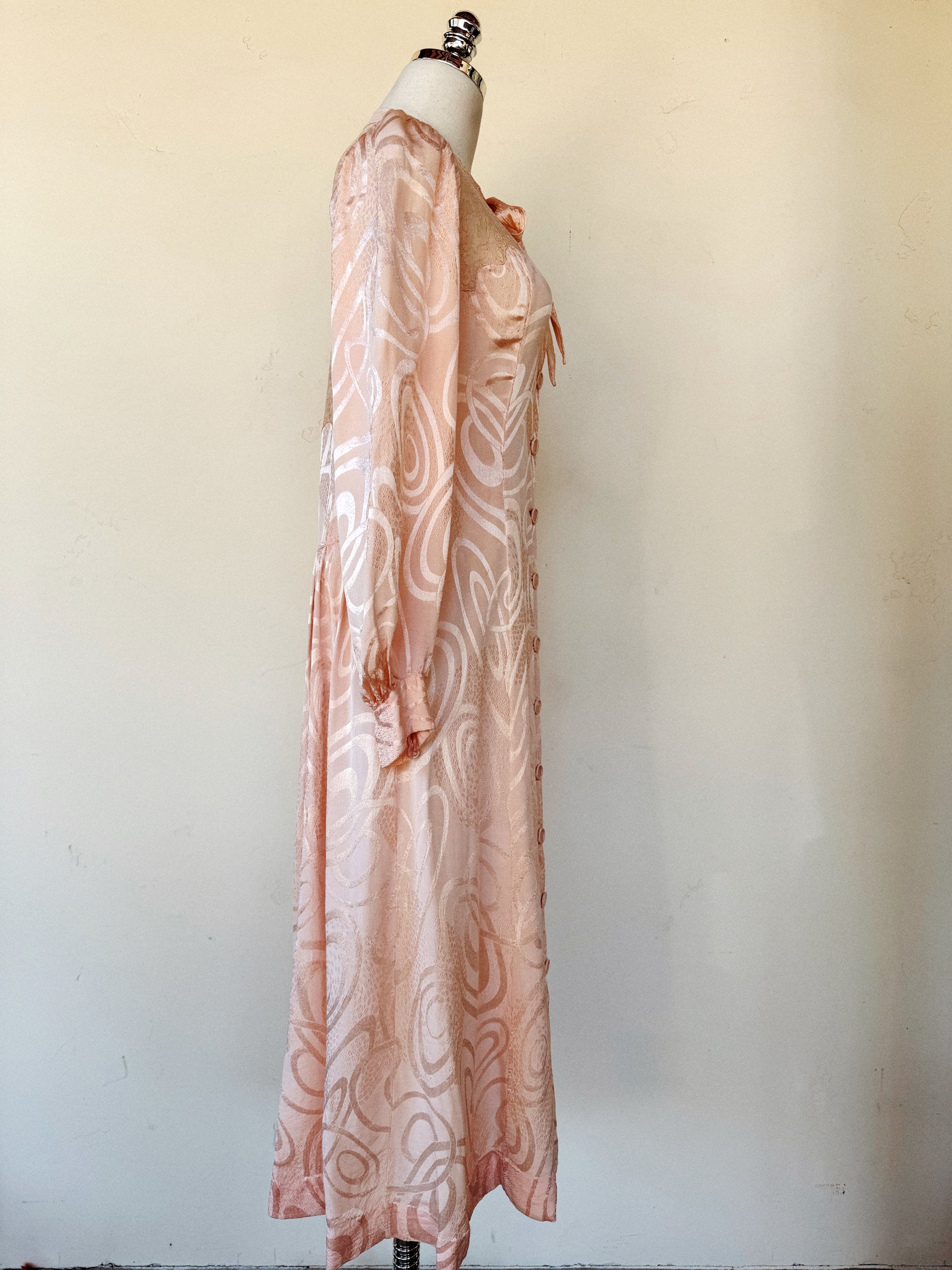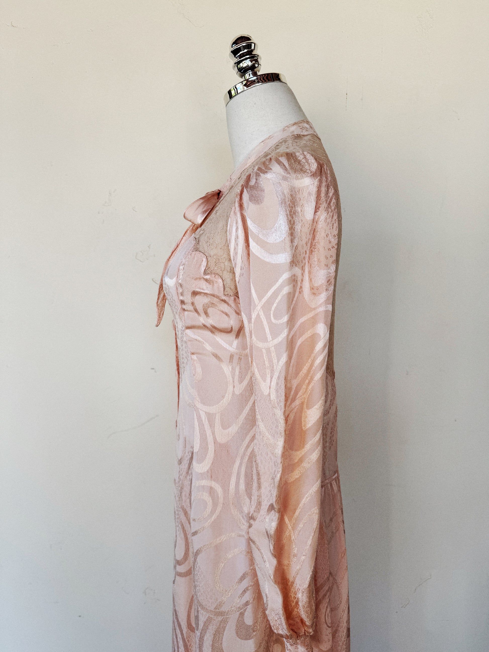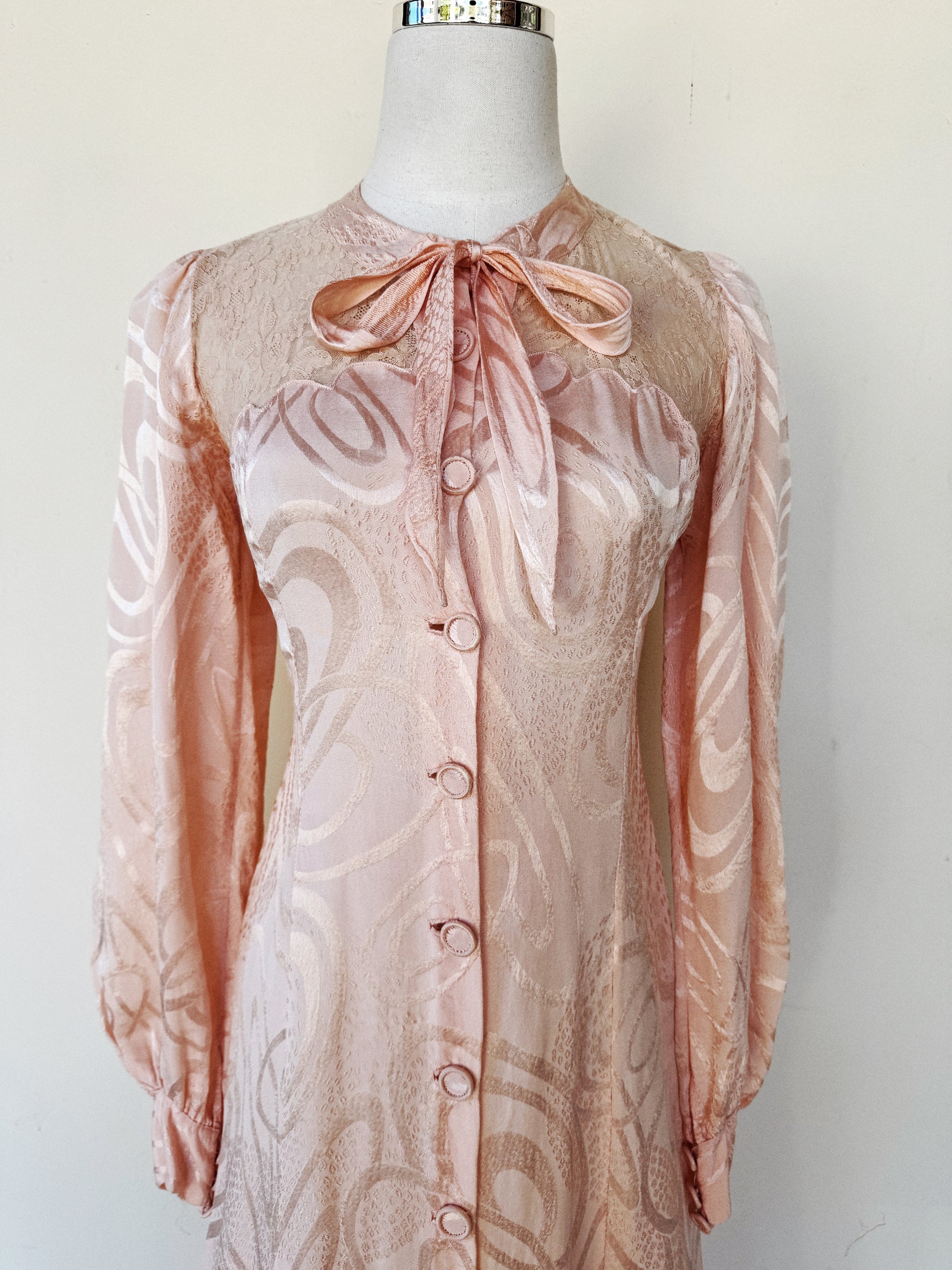 Truly unique and luxurious, 1930s French abstract, princess pink, silk dressing gown with fabulous scalloped trim. Silk brocade fabric features geometric swirling shapes, as well as patches of what almost resembles a leopard print. Has bishop sleeves with a thick cuff of three buttons each side. Bust has scallloped edges over the french lace that covers the entirety of the back. Finished off by the most delightful, tapered bow. Could also be worn open as a duster if desired!