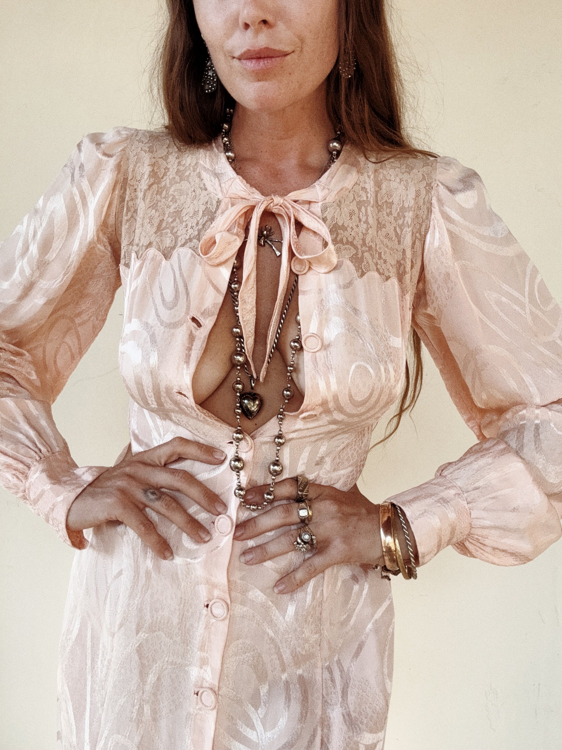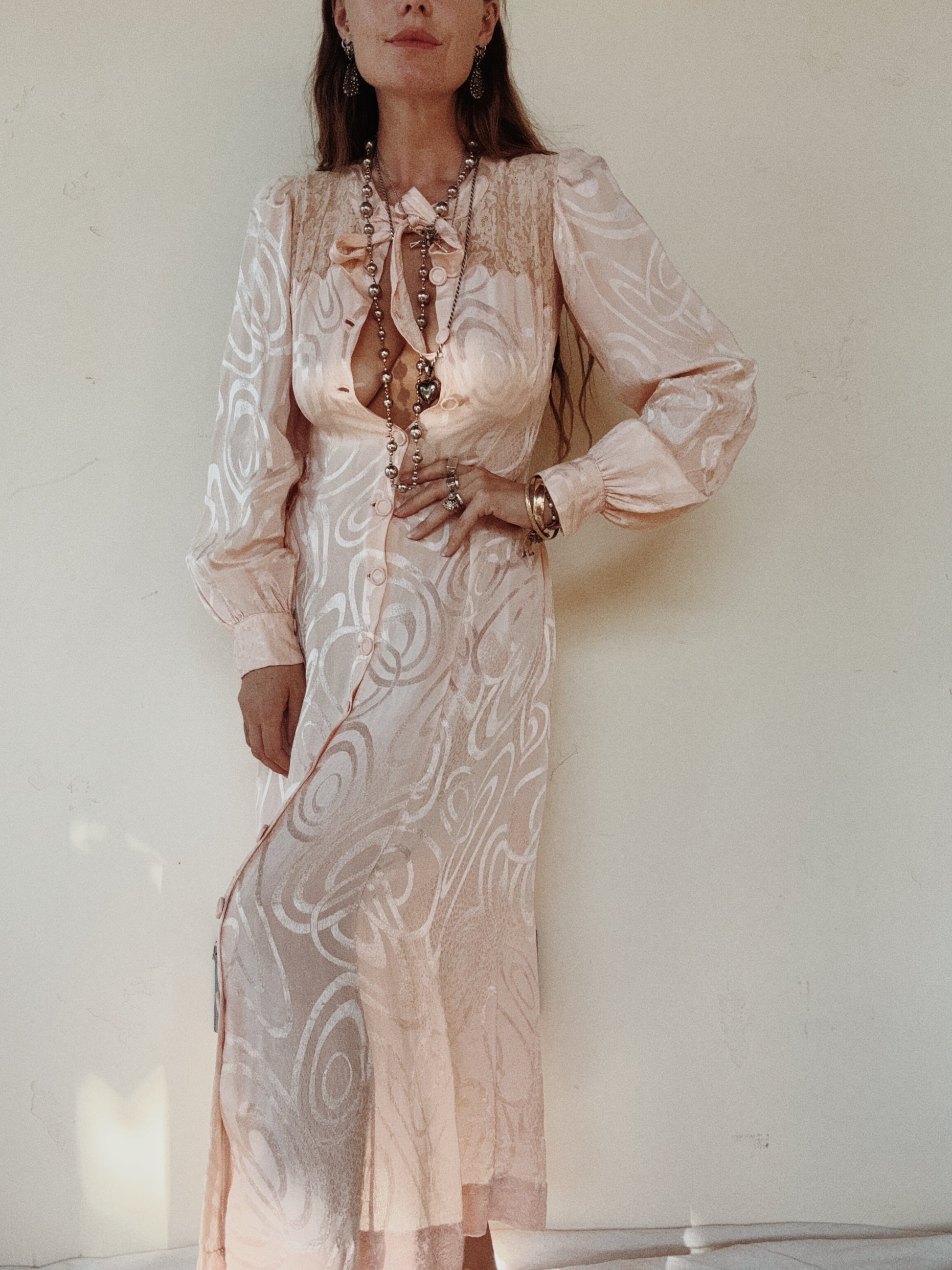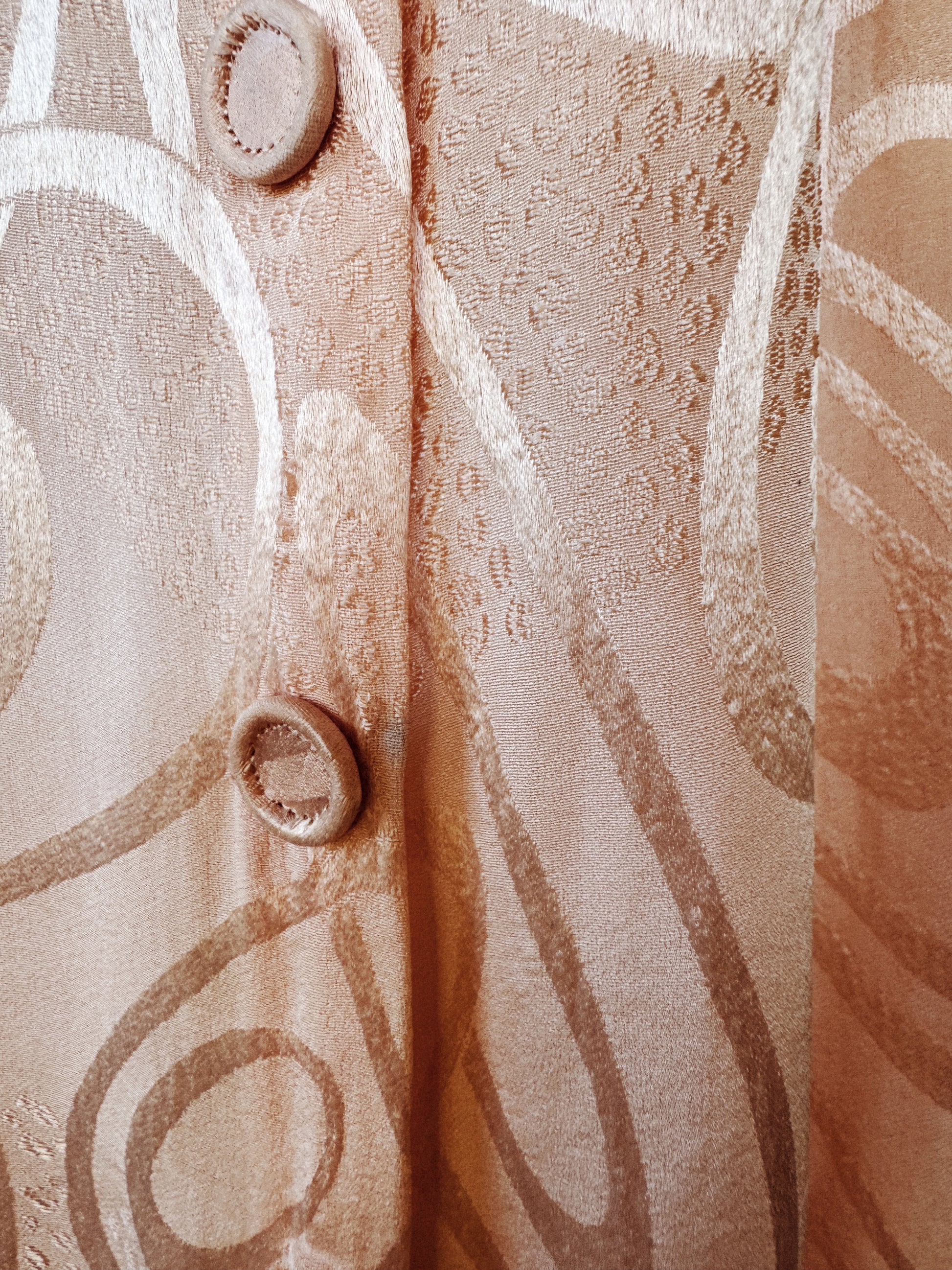 Truly unique and luxurious, 1930s French abstract, princess pink, silk dressing gown with fabulous scalloped trim. Silk brocade fabric features geometric swirling shapes, as well as patches of what almost resembles a leopard print. Has bishop sleeves with a thick cuff of three buttons each side. Bust has scallloped edges over the french lace that covers the entirety of the back. Finished off by the most delightful, tapered bow. Could also be worn open as a duster if desired!