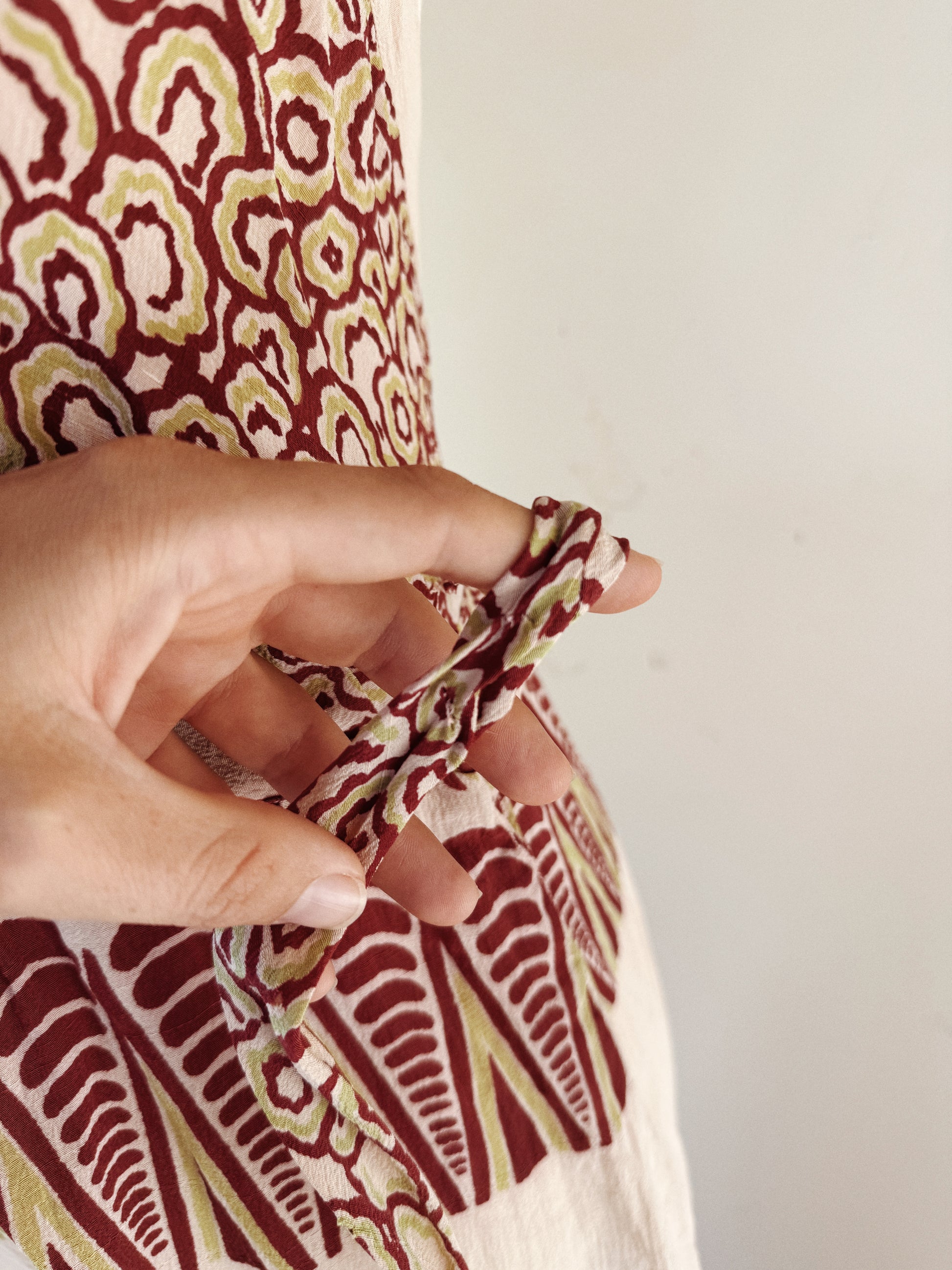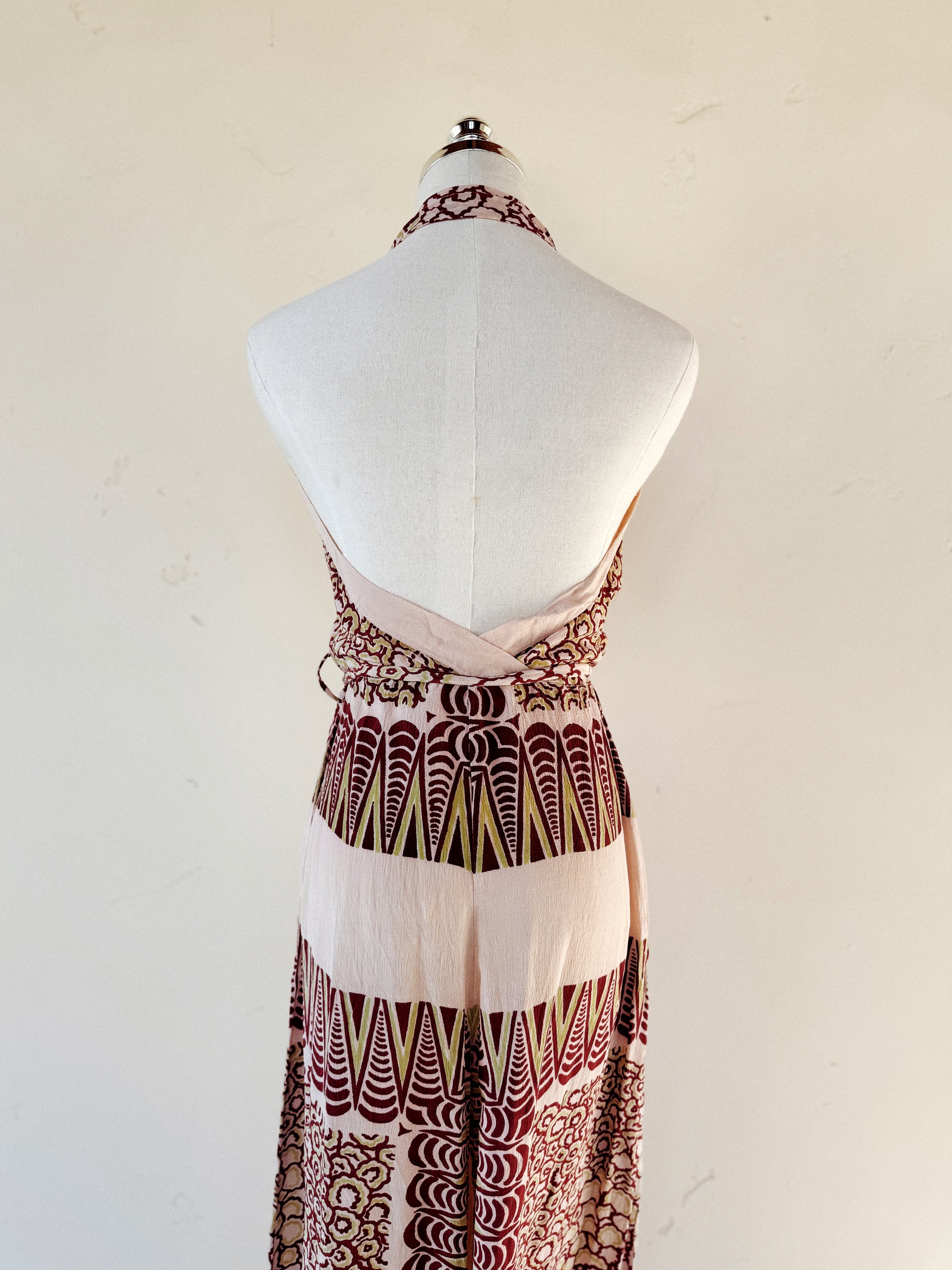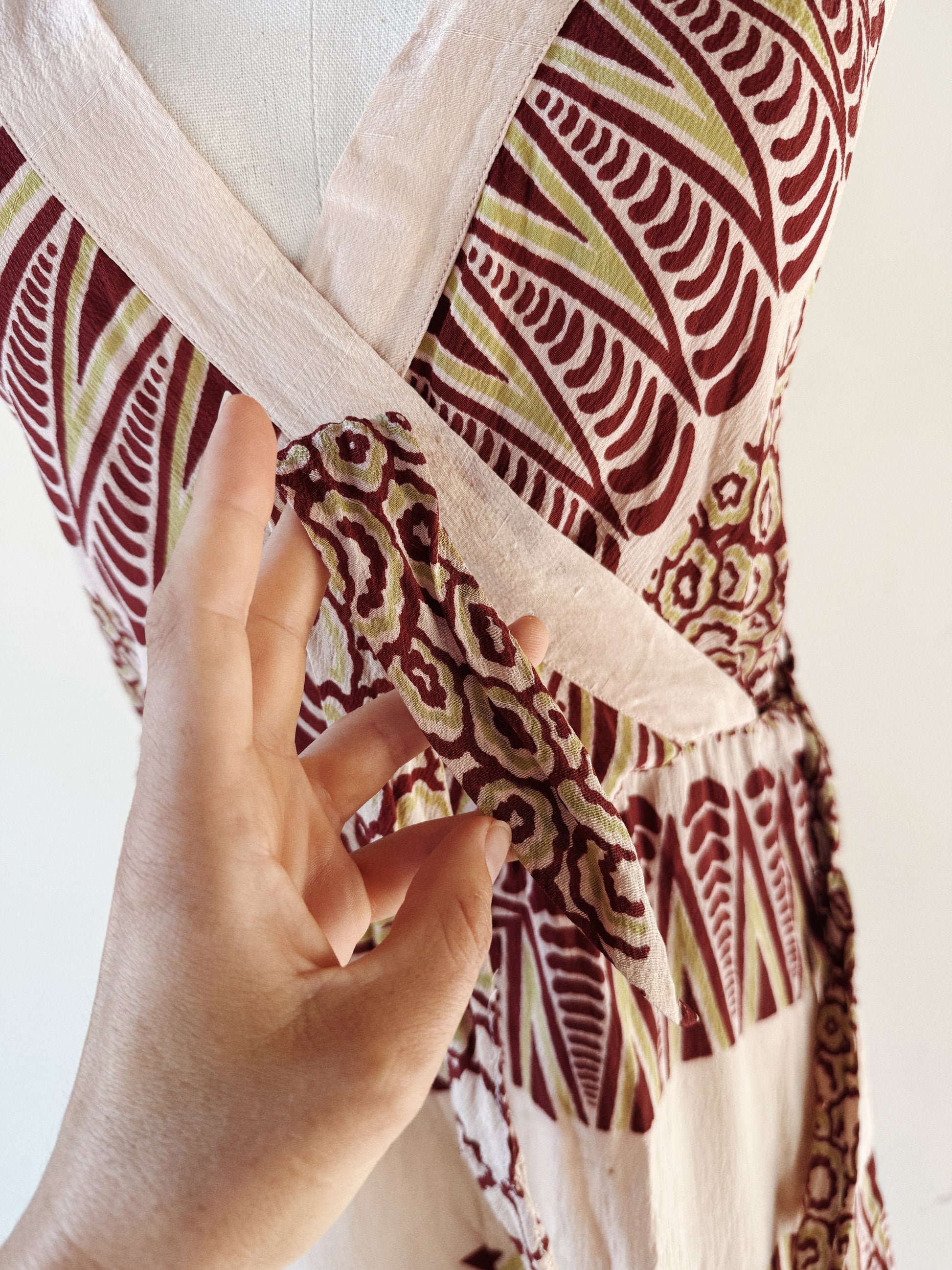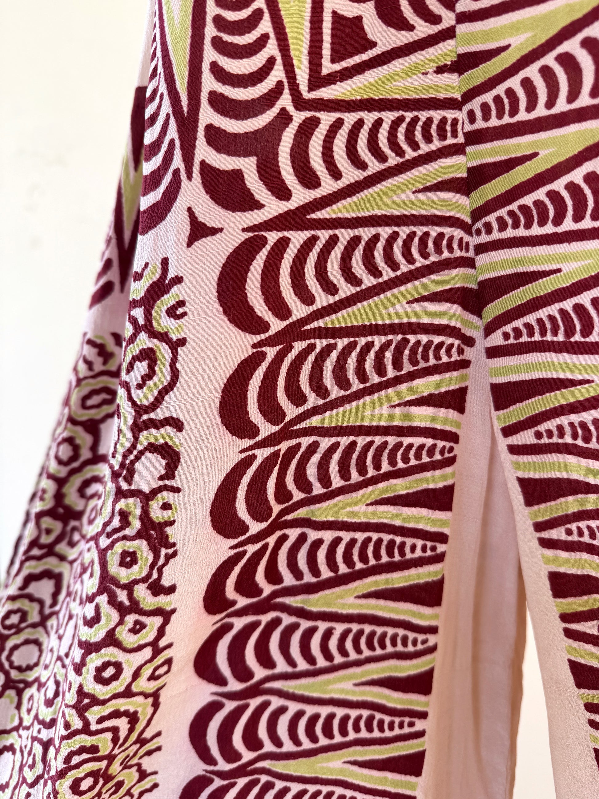 In outstanding condition for its age and very wearable, with a few very superficial flaws. The first being, there are some mends on the sash, as well as a few tiny marks on the front, and the faintest color bleed on a few of the geometric, burgundy shapes. All show in the last few photos. The color bleed is so light it was hard to pick up, but if you look closely you should be able to get the idea. Quite inconsequential for how remarkable these are! There is no doubt in my mind that these magnificent beach pajamas could be on exhibit in a museum. Just exquisite.