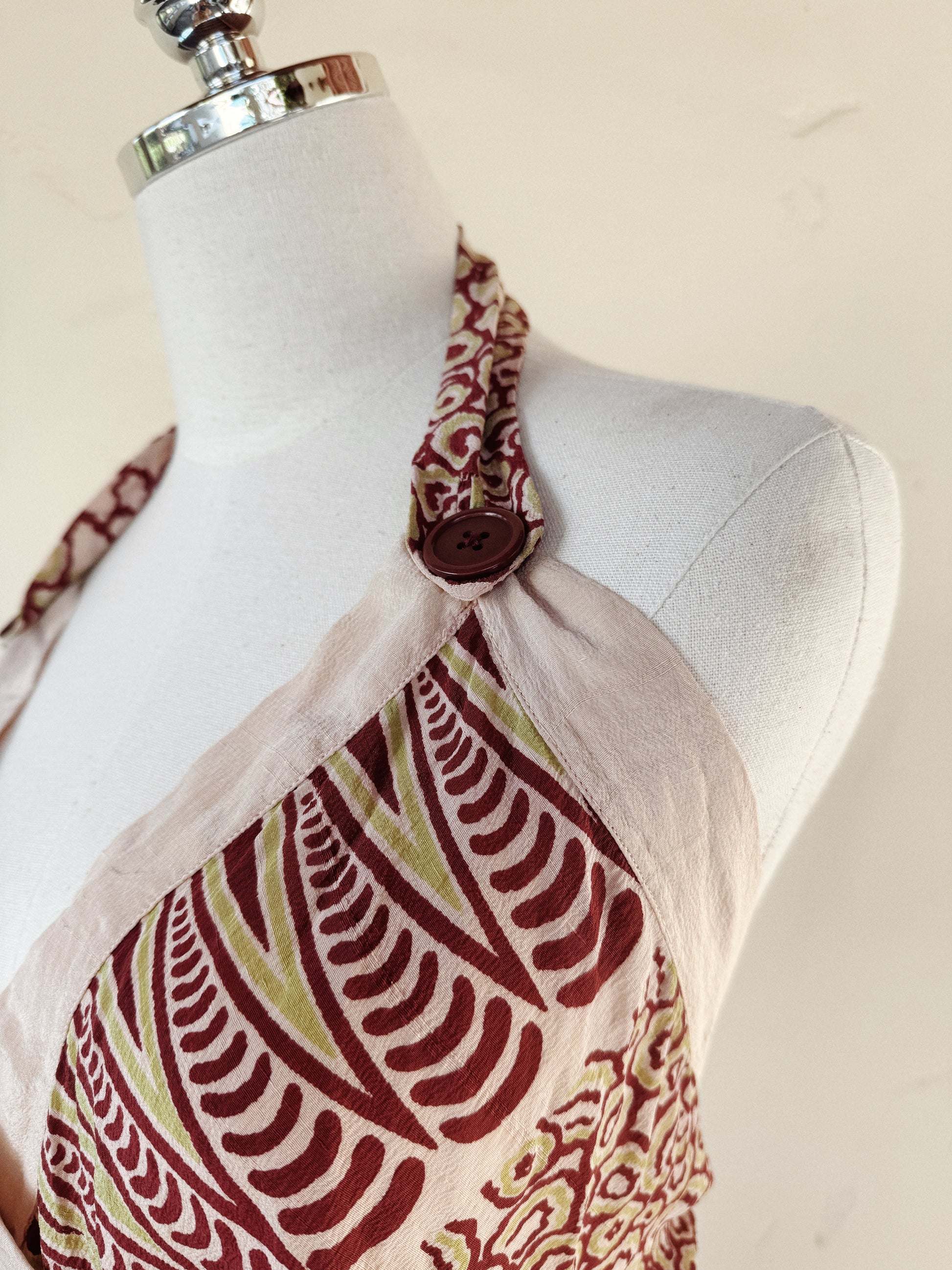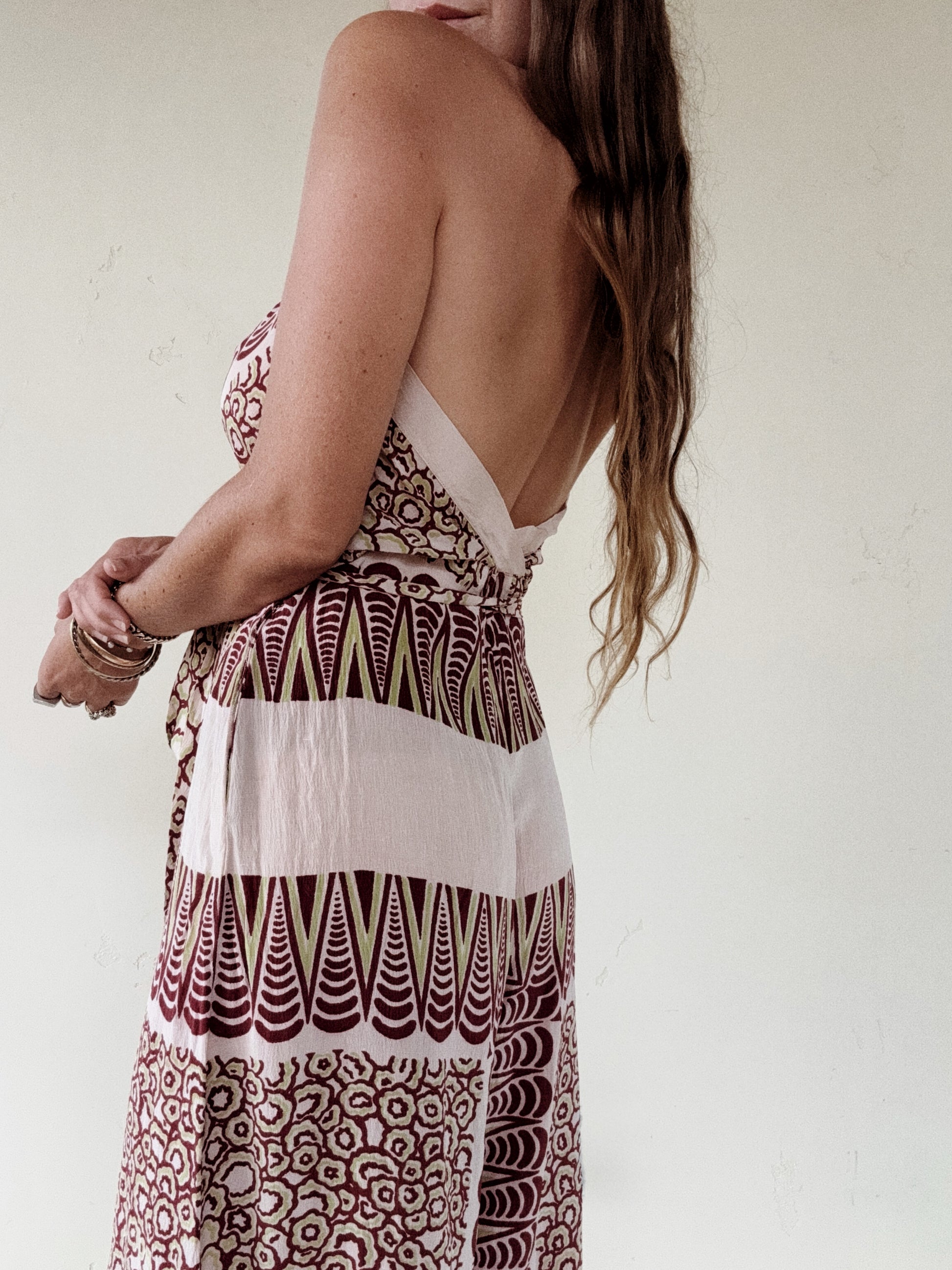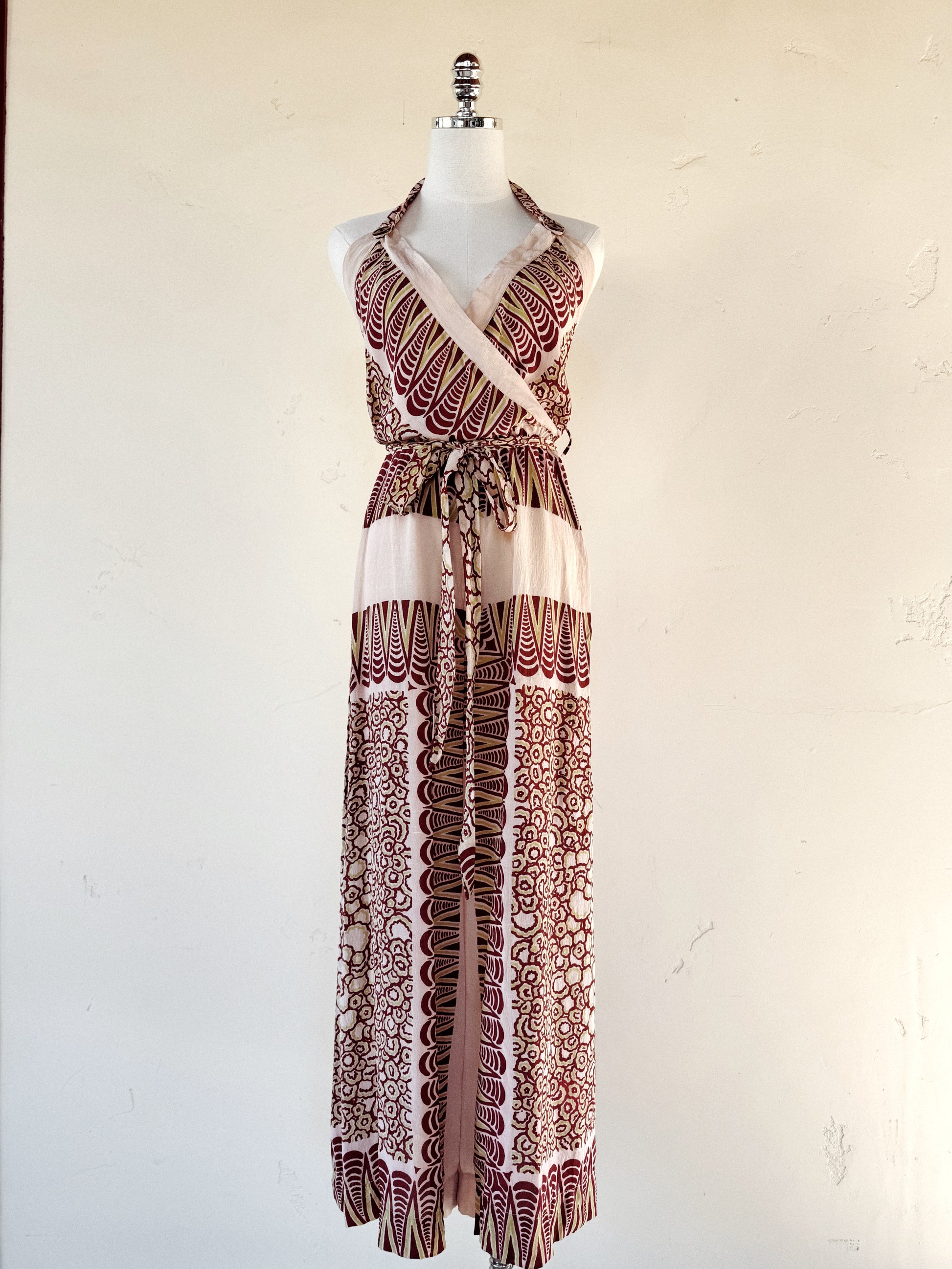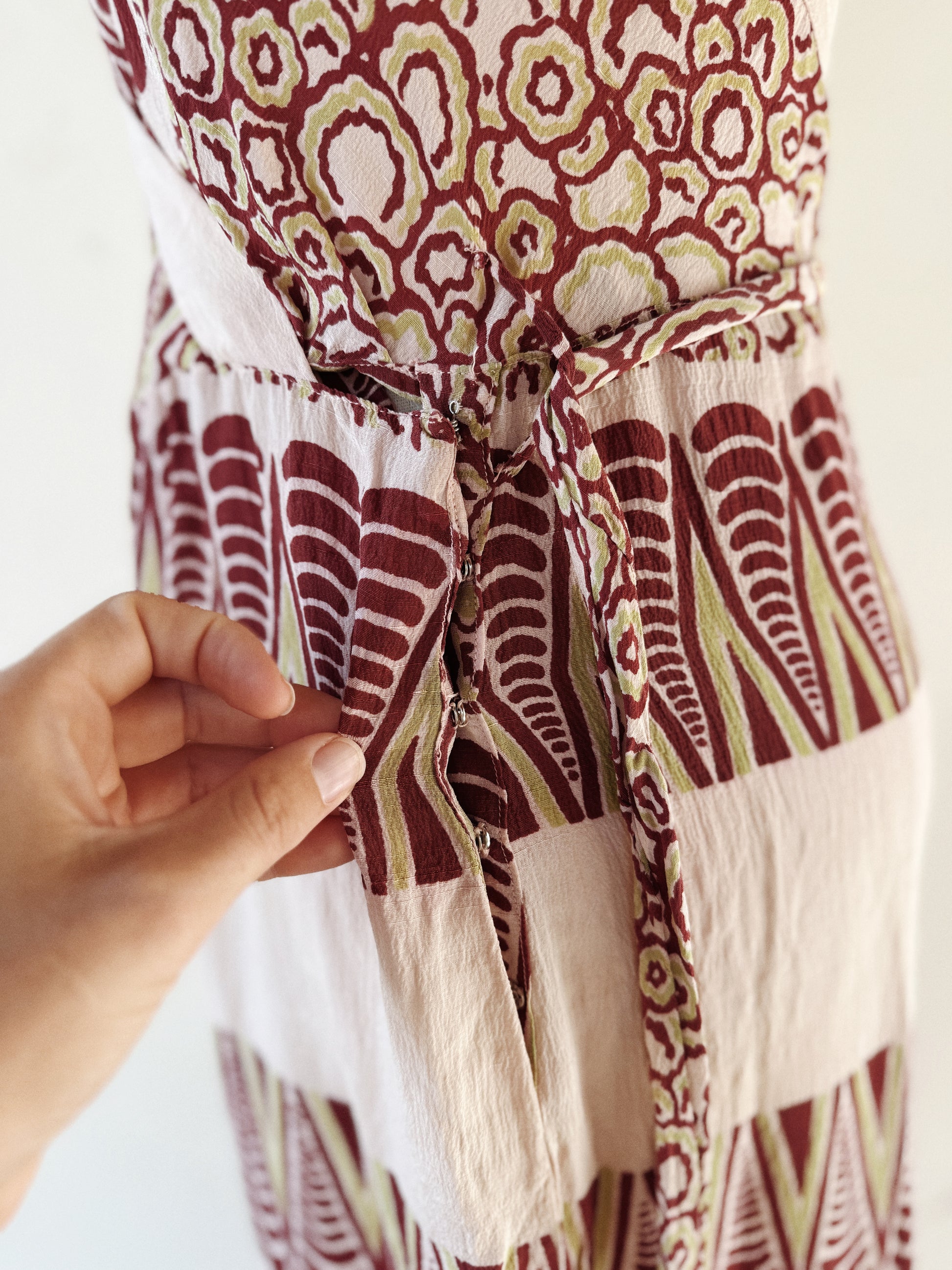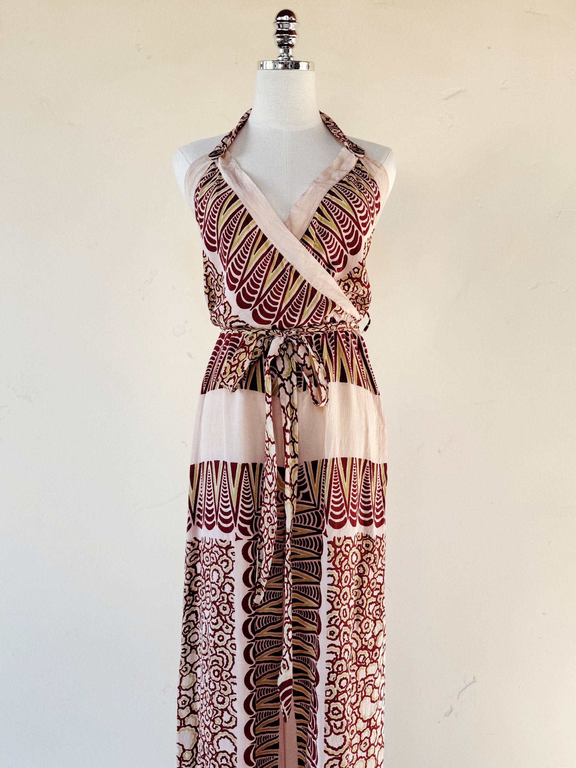 In outstanding condition for its age and very wearable, with a few very superficial flaws. The first being, there are some mends on the sash, as well as a few tiny marks on the front, and the faintest color bleed on a few of the geometric, burgundy shapes. All show in the last few photos. The color bleed is so light it was hard to pick up, but if you look closely you should be able to get the idea. Quite inconsequential for how remarkable these are! There is no doubt in my mind that these magnificent beach pajamas could be on exhibit in a museum. Just exquisite.