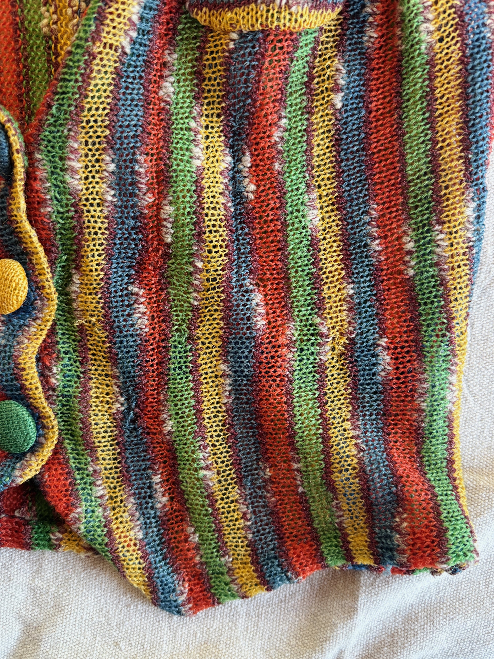 Absolutely delightful, 1930s multicolored crocheted waistcoat vest. Clowncore at its finest! Features beautiful, muted primary colors and complimentary multicolored crochet covered buttons. So playful! Two petite deco pockets and a cropped fit. Label read “VOG… Paris” it was challenging to make out the other words. In almost perfect condition with a few very tiny and very well done mends. Shown in photos. Can be worn as a top or worn over a blouse or distressed tee shirt. Material is a thin wool yarn. A truly stunning piece of early knitwear.