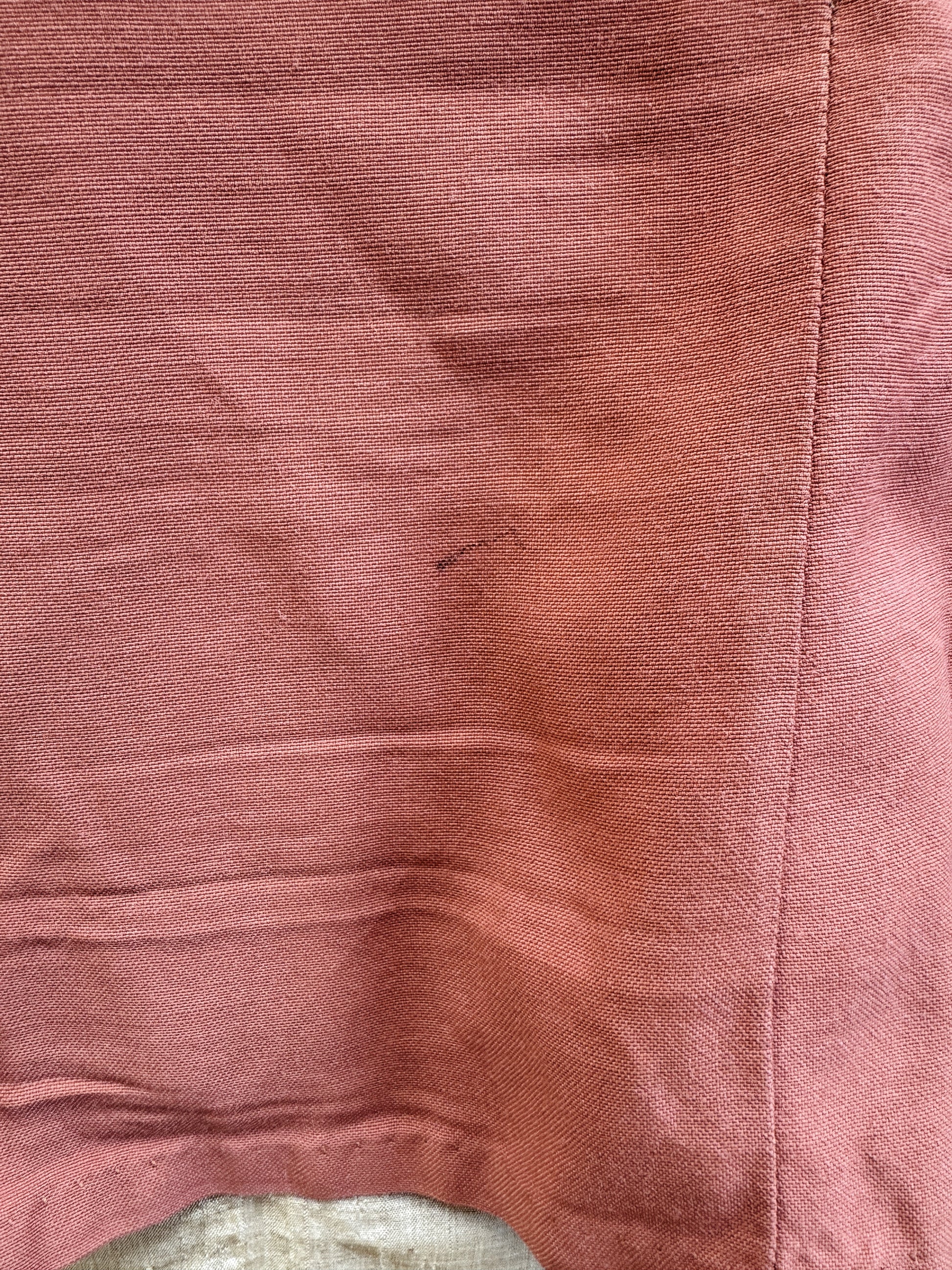 Fabulous, 1940s/50s western gabardine top in a burnt, clay red hue. Complimented perfectly by white flowers and green vines. Material feels like a cotton perhaps, but is a tight weave, like a gabardine. Slinky with a nice drape. Overall in great condition with what appears to be some light bleach stains on the front and some marks on the underarms. There is also two small pinholes on the arm and a small pen mark on the lower back. Presents beautifully and all flaws shown in photos.