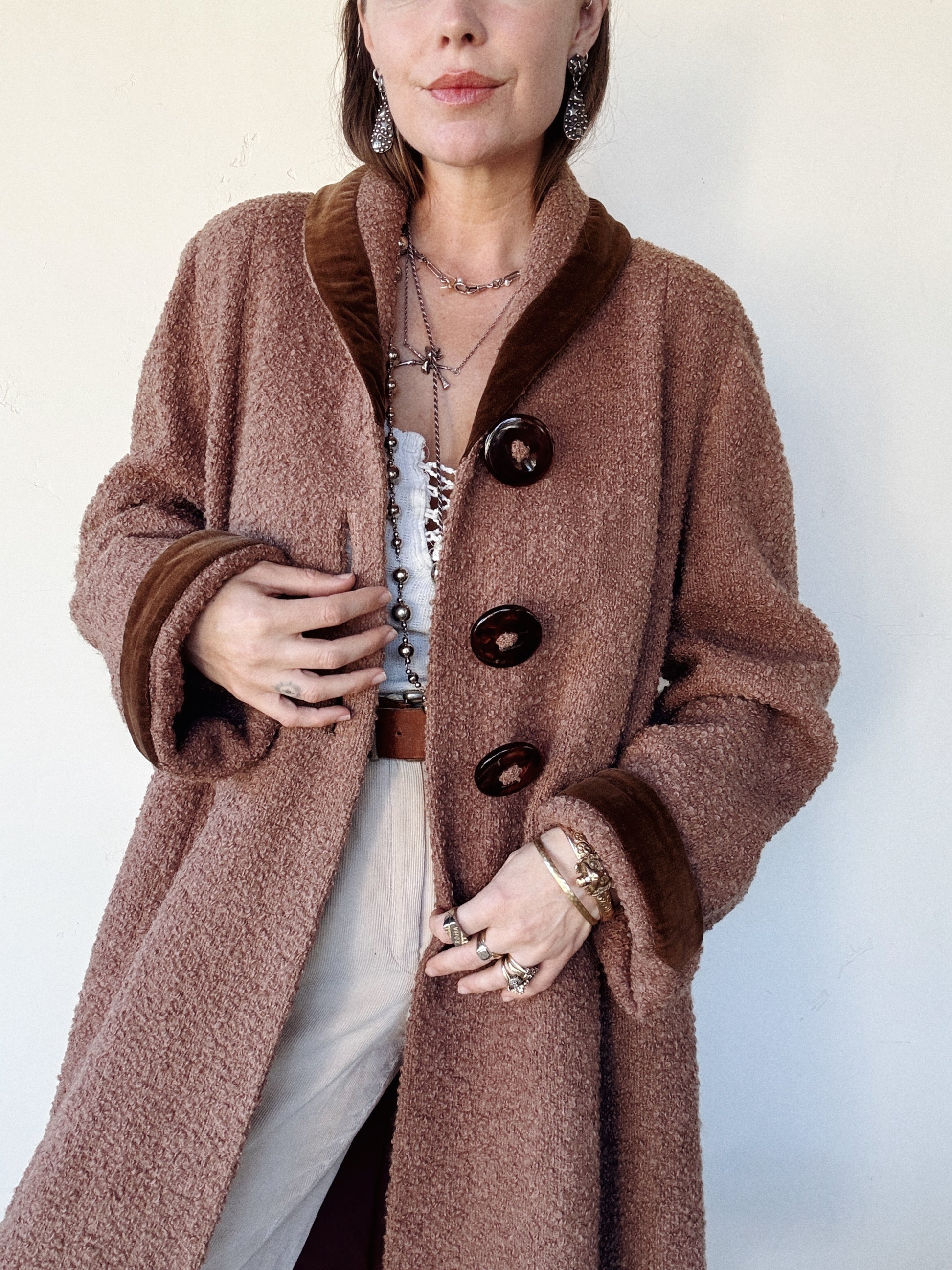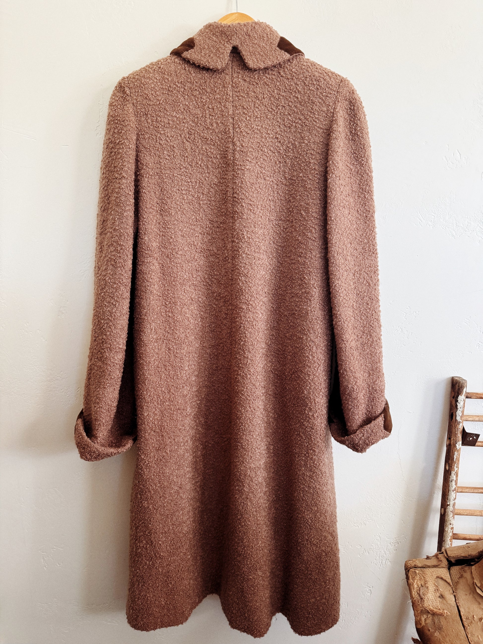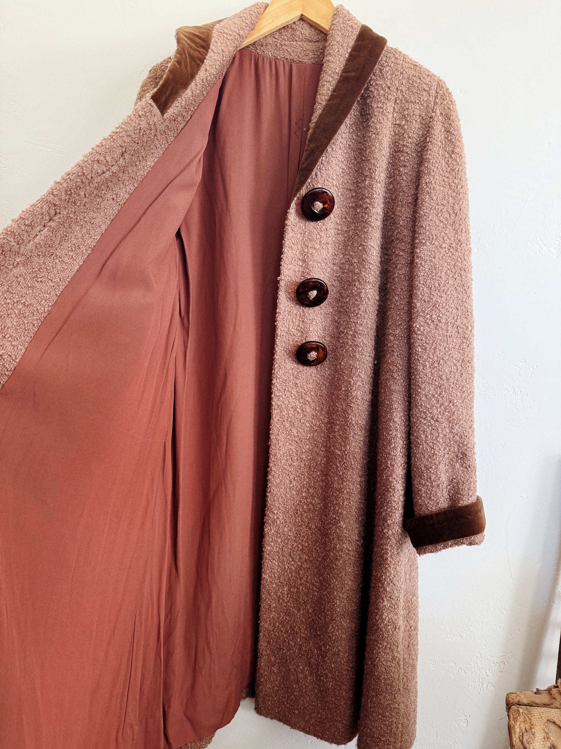 Absolutely fabulous, 1940s/50s mocha brown Bouclé overcoat with wonderful, oversized buttons. These large buttons appear to be a lucite tortoise shell and are attached to the coat by its matching Bouclé knit fabric. Trimmed in a chocolate velveteen and lined in a beautiful silk crepe fabric, which makes this piece incredibly comfortable. It is in pristine condition and is the perfect blend of timeless vintage charm, and contemporary, effortless style. I would say this coat is a medium weight and will fit a S/M to M. Will certainly become a staple in your closet.