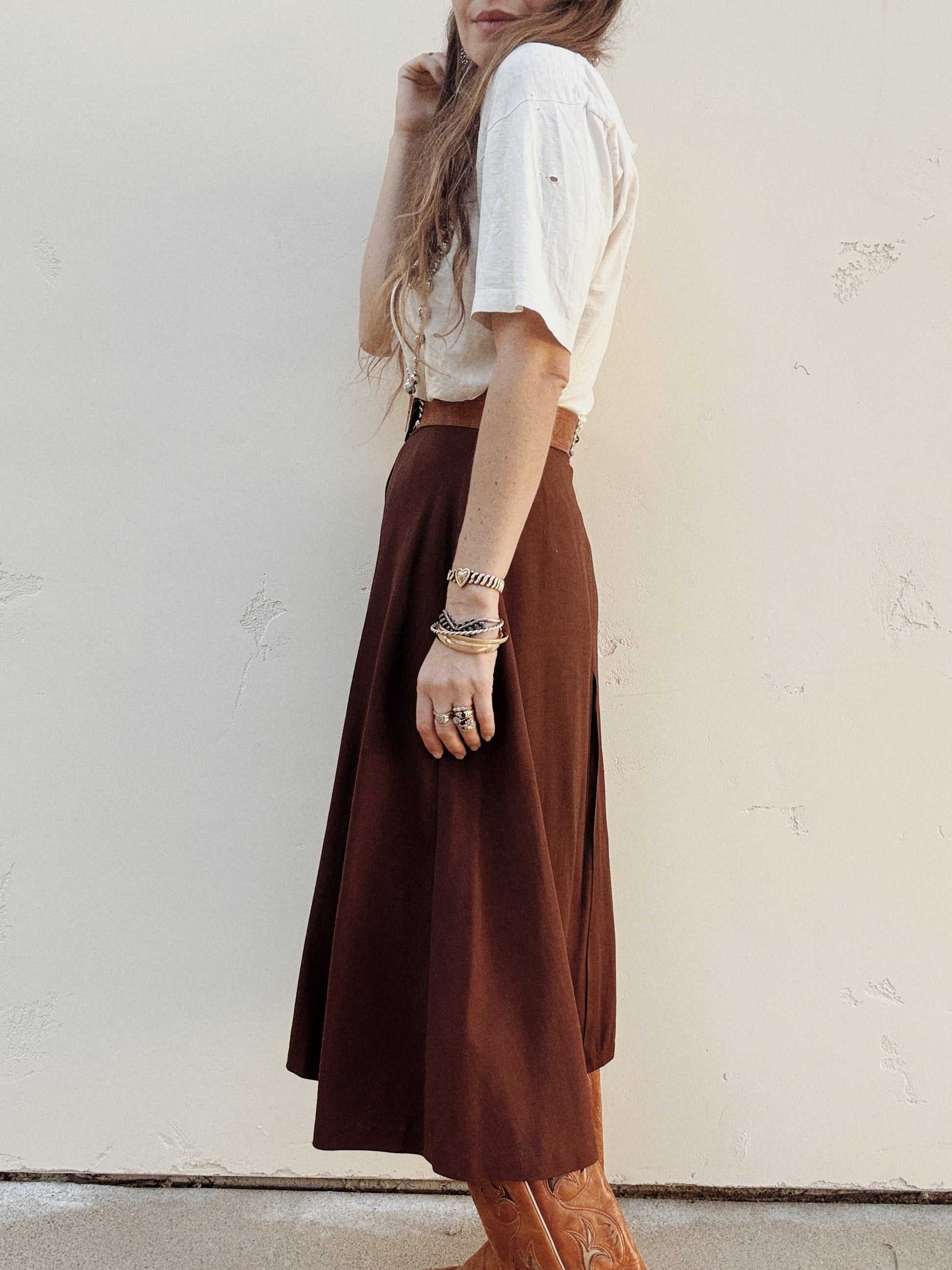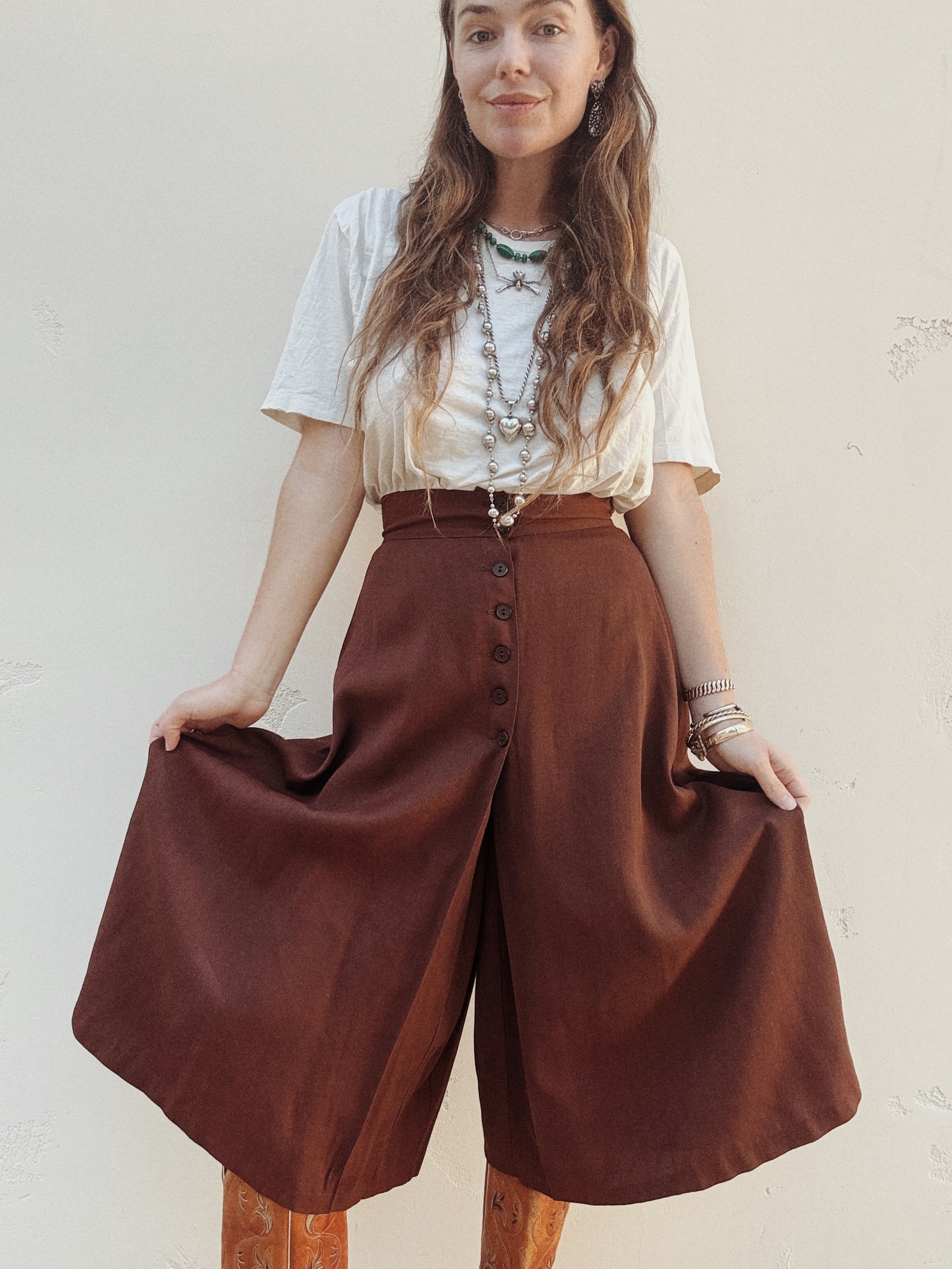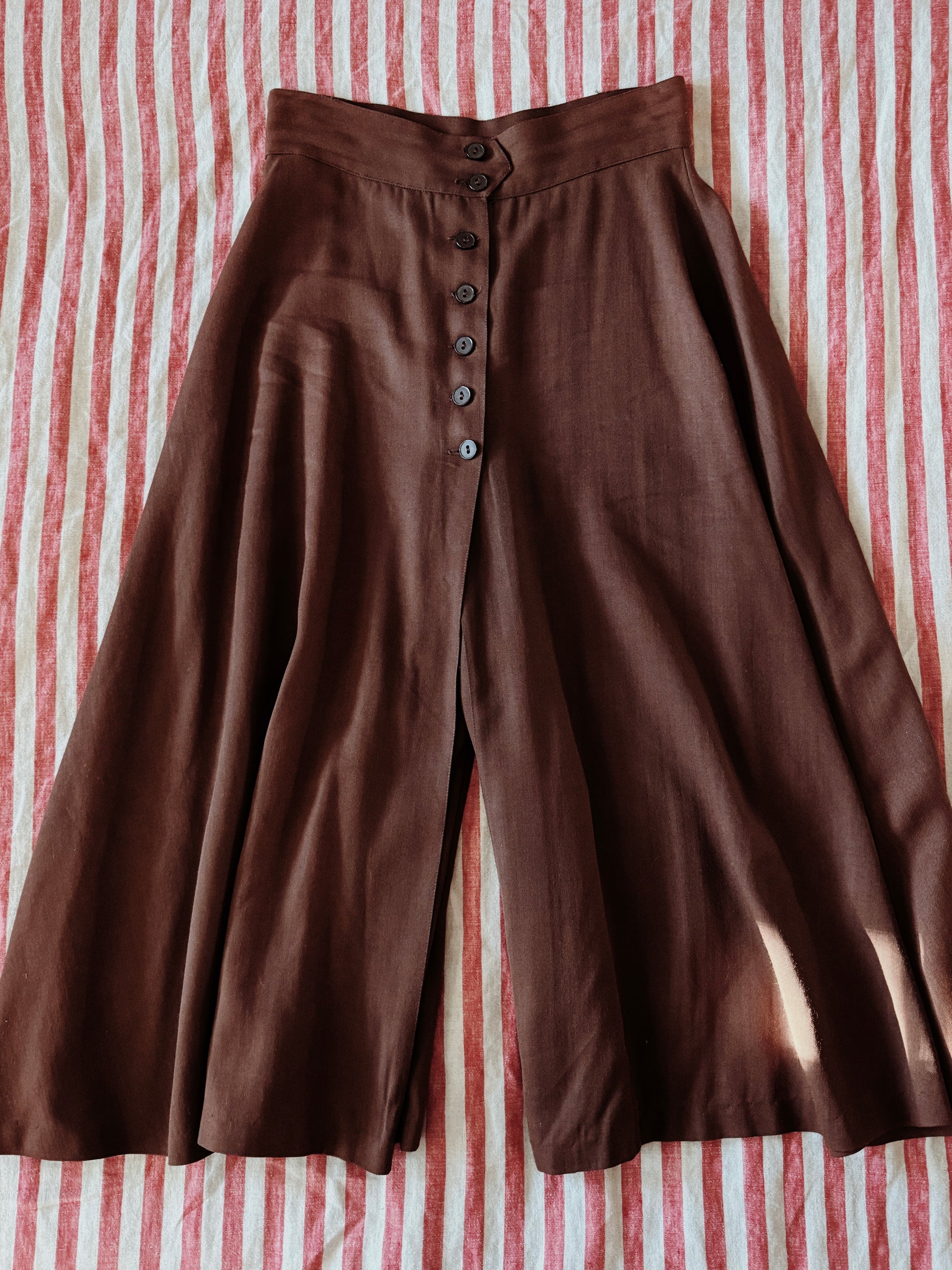 1940s Brown Rayon Gabardine Split Skirt Culotte Pants- S/M
