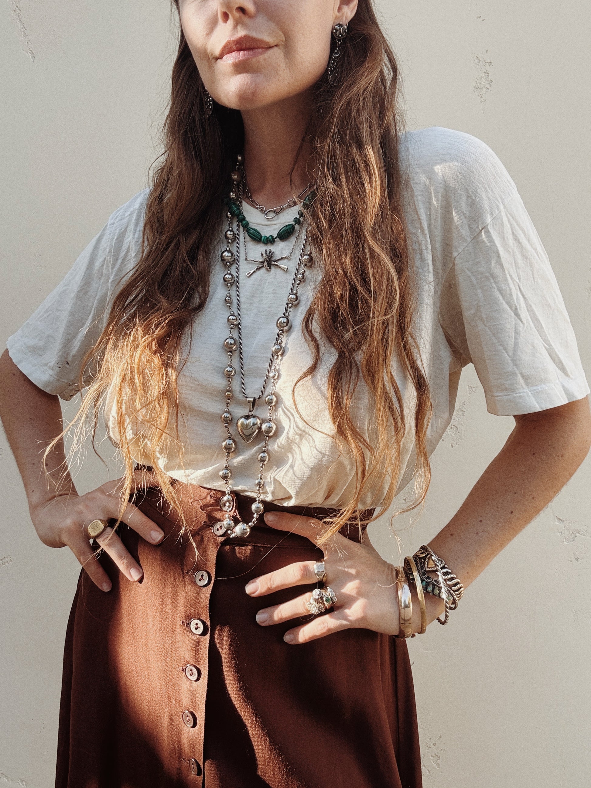 Fabulous and unique, 1940s rayon gabardine split skirt culotte pants. Ultra high waisted fit with buttons that close over an initial metal zipper closure. Very interesting and sleek design. Pairs perfectly with tall boots. These are in pristine condition. I’ve never seen another like them. Styled with a 1930s/40s jeweled belt with stamped Navajo buckle. Also available.