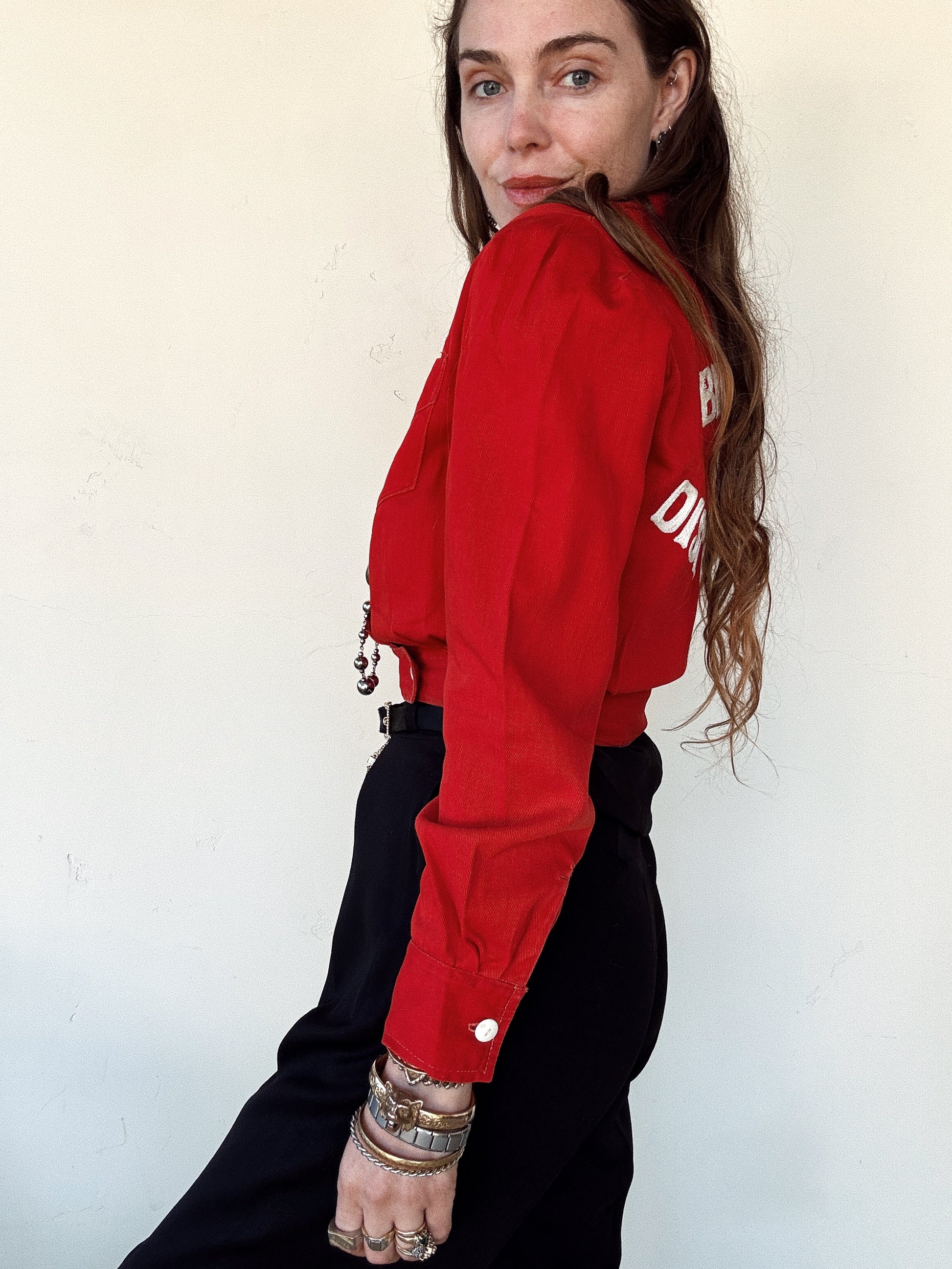 Absolutely awesome, 1940s cherry red, cotton twill jacket with chain stitching. This fabulous piece of women’s sportswear features a cropped fit with puffed shoulders, and the name “Evelyn” is embroidered in the front over the deco style pockets. This piece is meant for someone with slightly broader shoulders. Waist measurement should be taken below the ribcage, due to the cropped fit. Buttons at the waist could potentially be moved to open it up a bit. In excellent condition, and looks great worn open or closed!