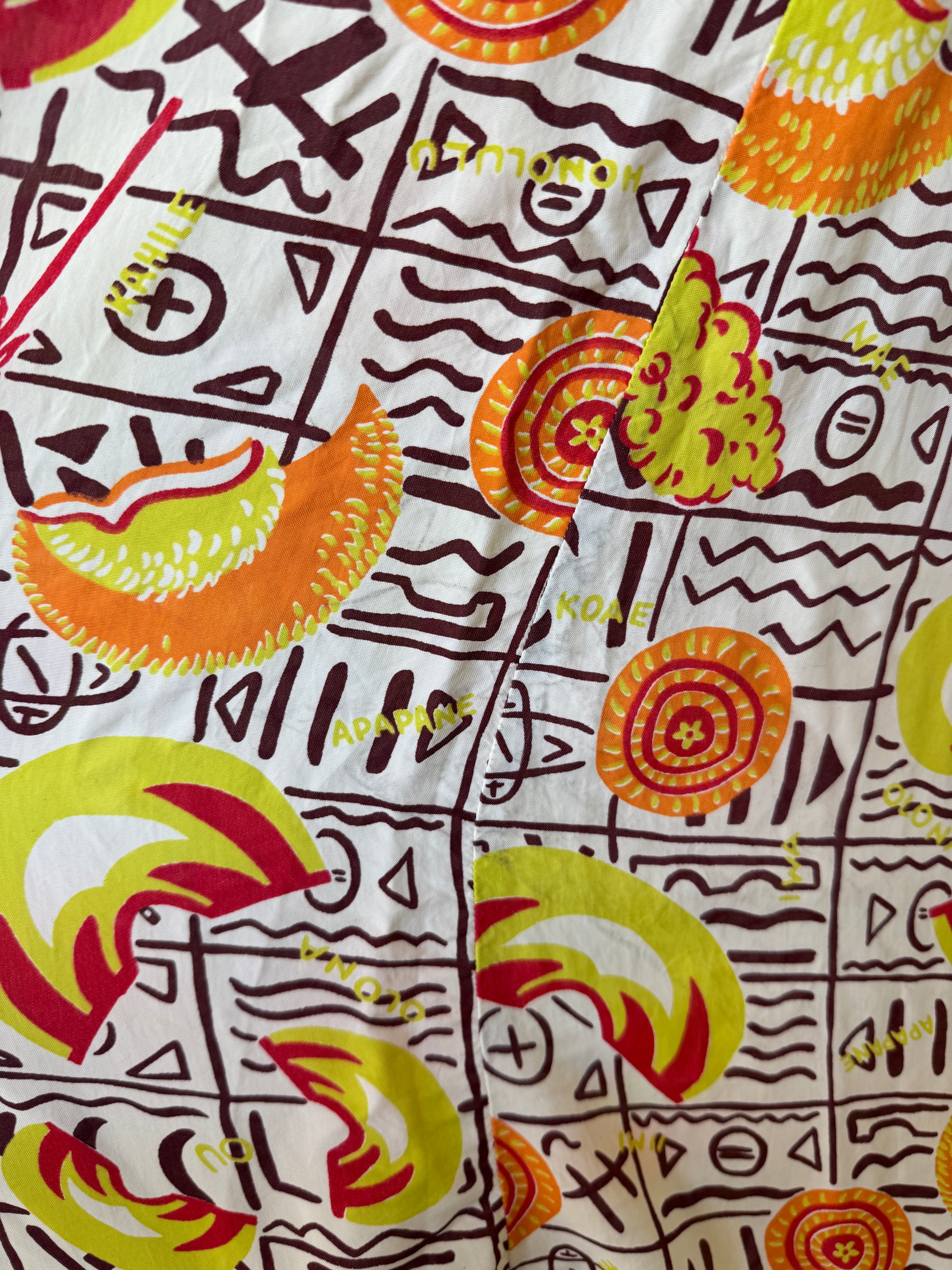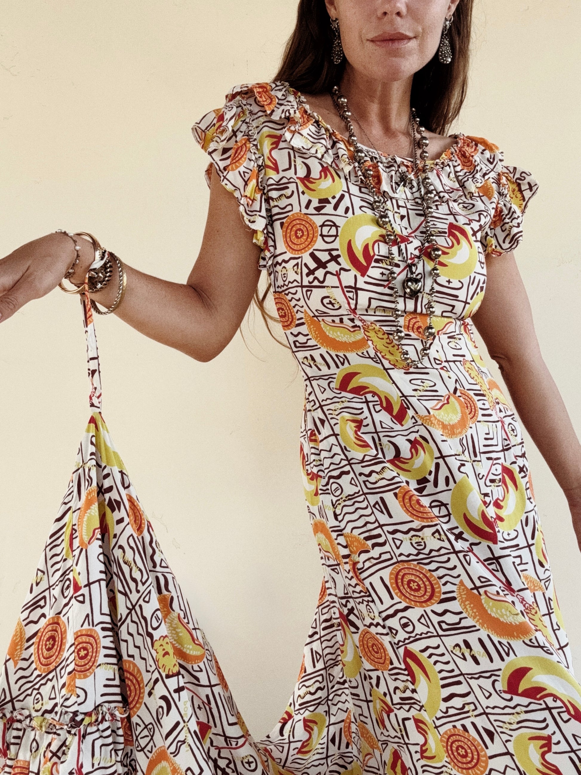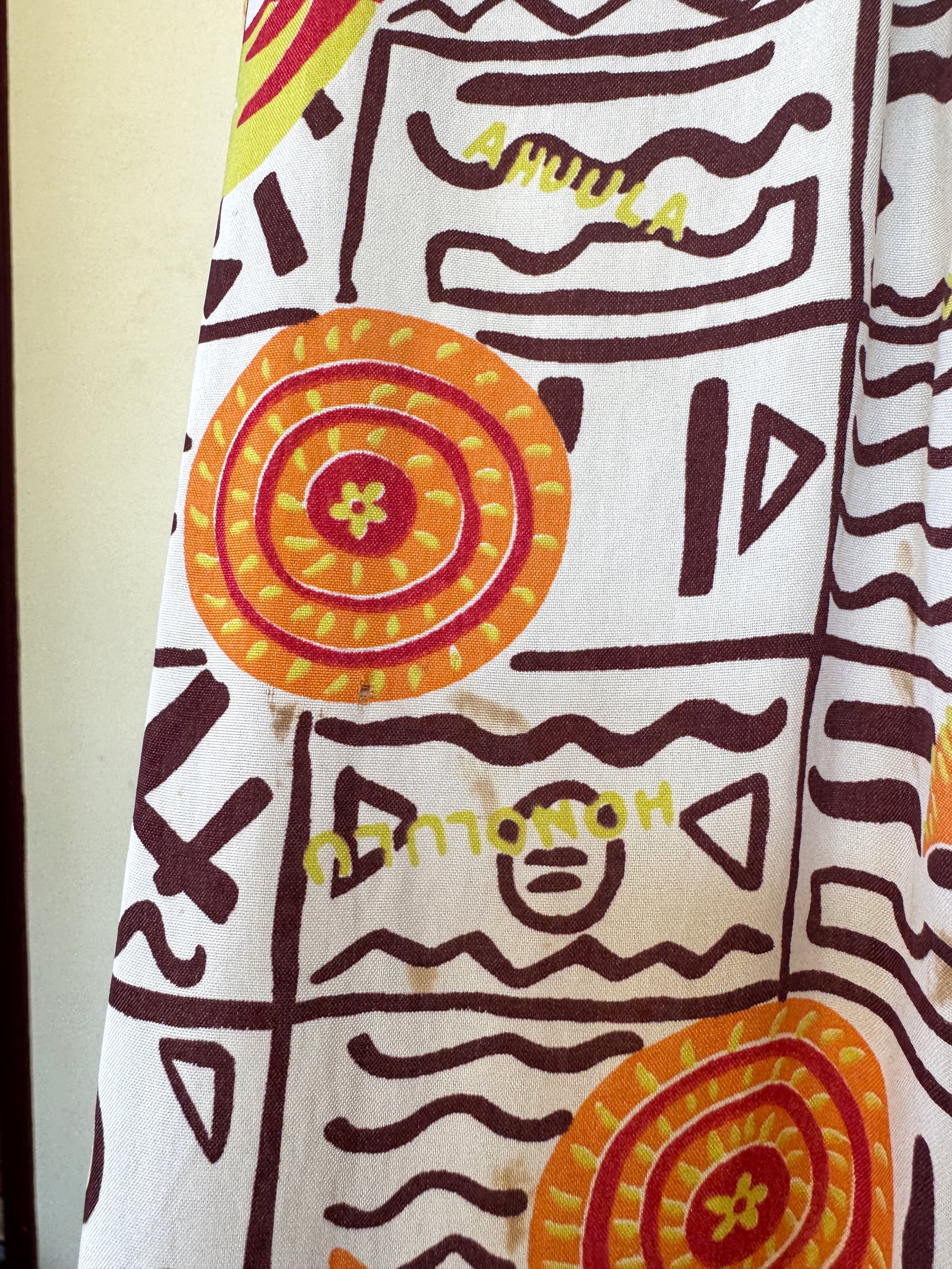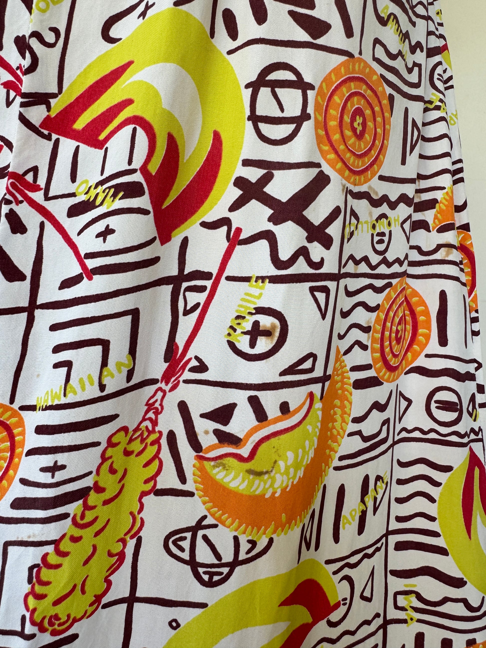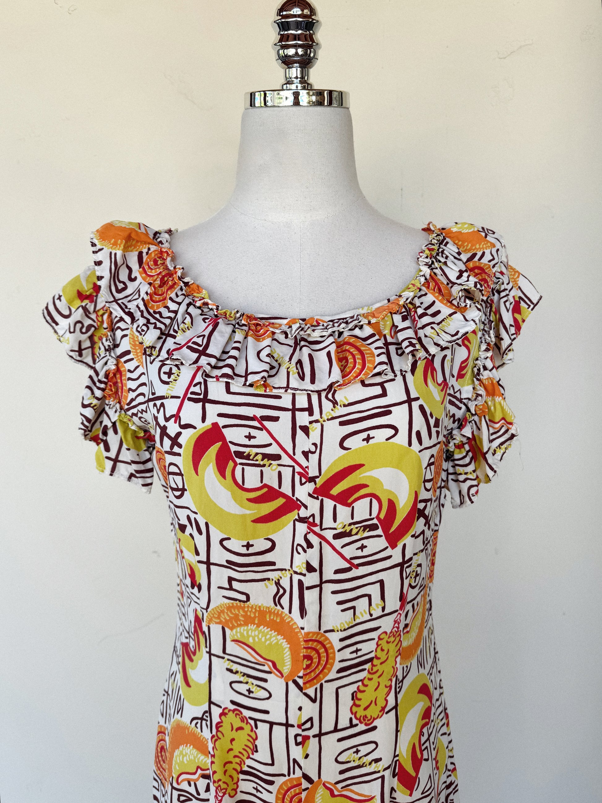 Absolutely fabulous, 1940s, cold rayon Holoku gown with a super fun, chartreuse and orange, all over print. Classic ruffle trim with a trimmed waist. Train has a bracelet attached so to not drag. In wonderful condition for age, with some marks that get lost in the all over print, as well as one pinhole. Side zipper closure.