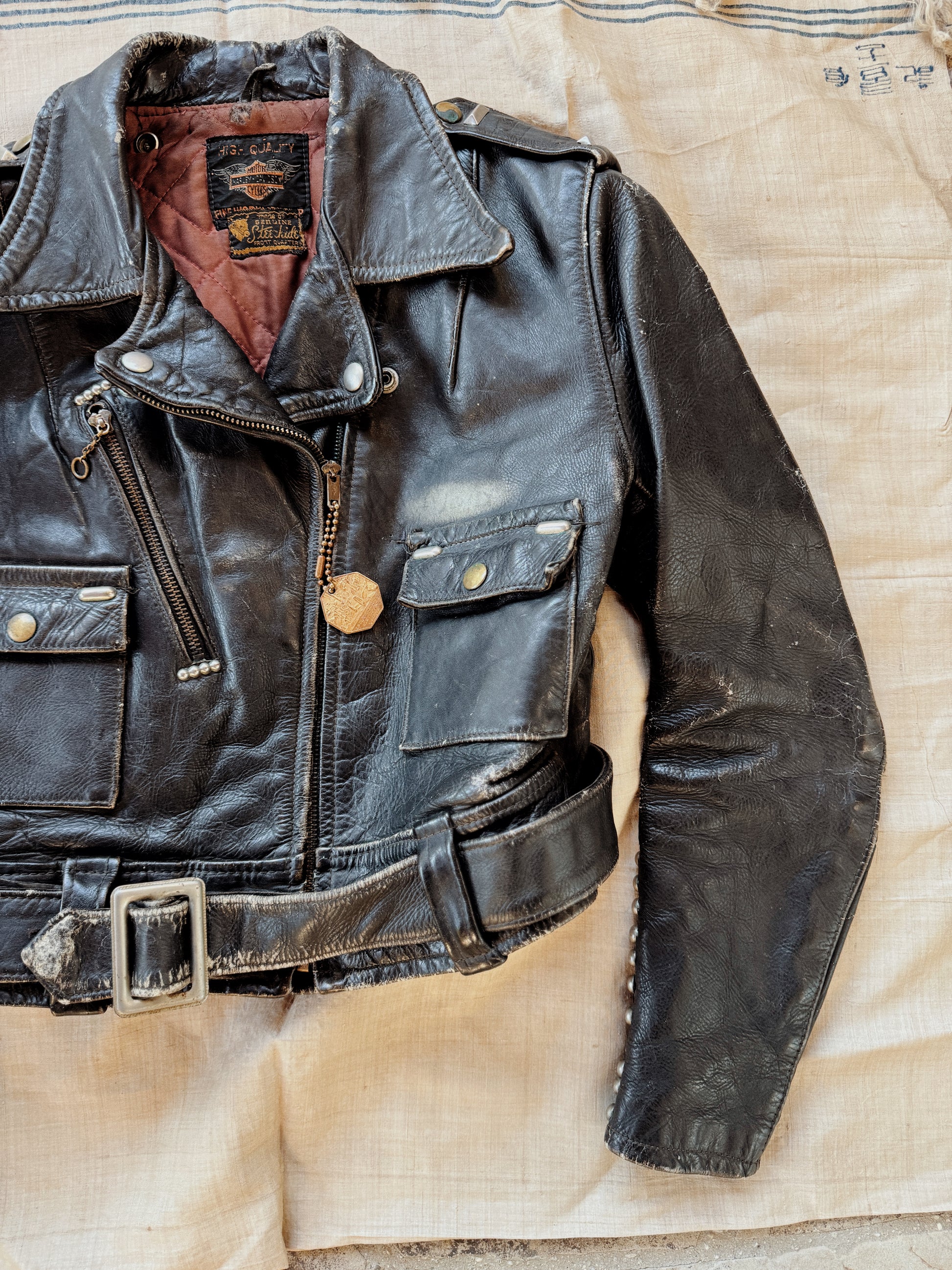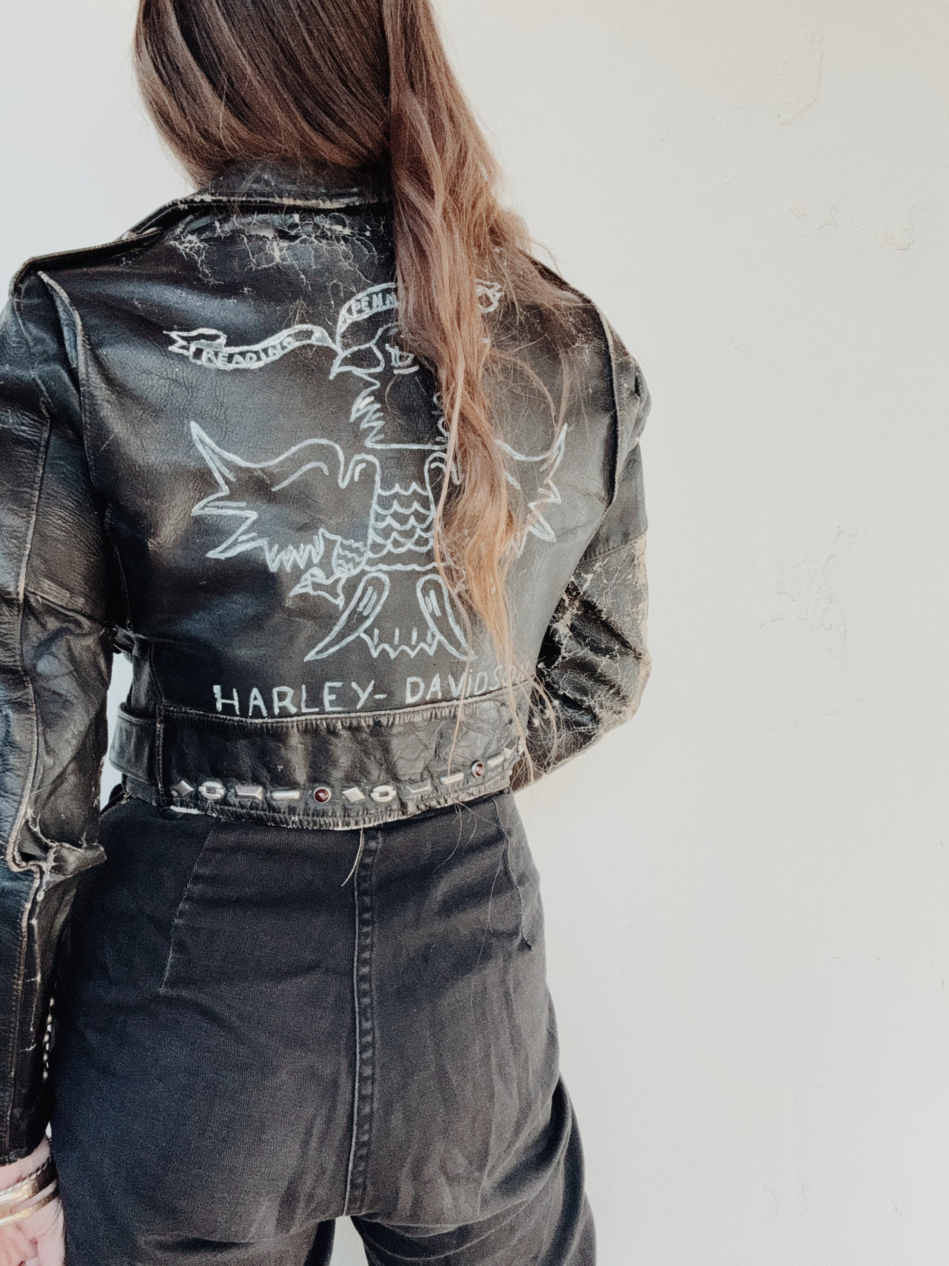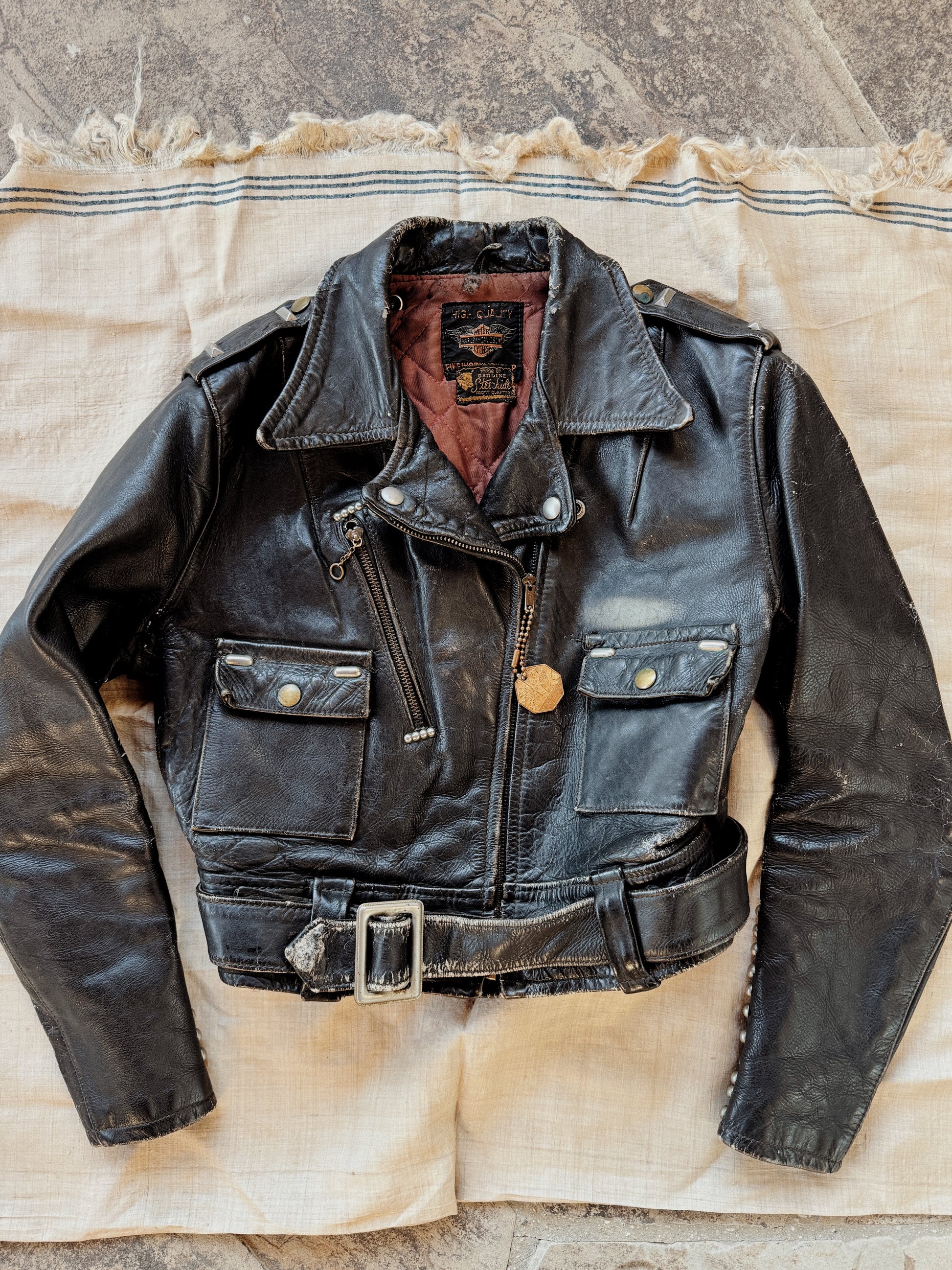 Truly incredible, 1950s Harley Davidson Cycle Queen Moto Jacket. Customized by the original owner with artwork and embellished in multiple types of studs and jewels. Worn to perfection and is super comfortable. This one is steerhide, which also offers a fuller range of movement. Has wear throughout, but most notable is a hole on the left elbow no believe this could be patched. Zippers are original and fully intact. A one of a kind, historic treasure- ready to be enjoyed for years to come.