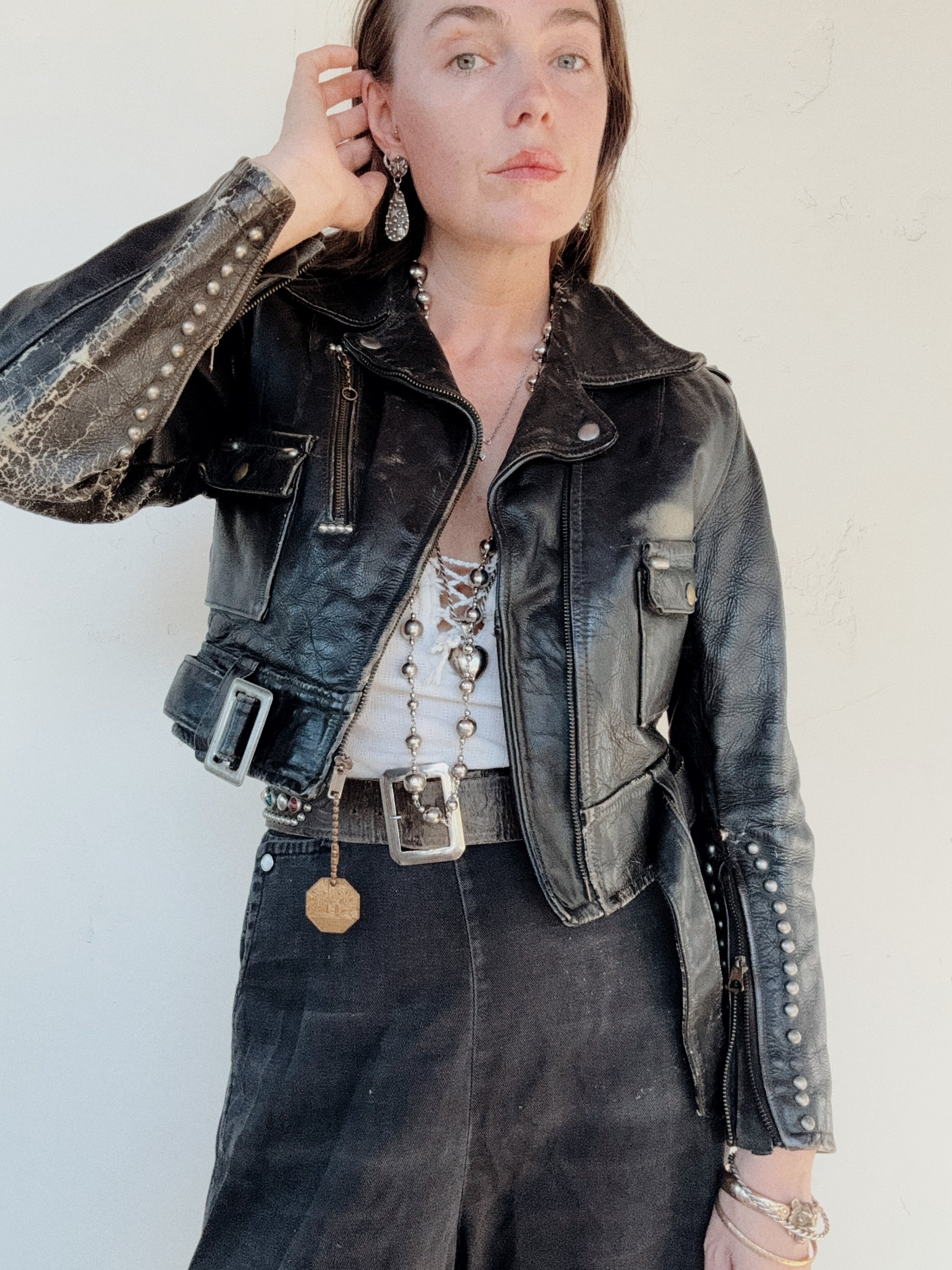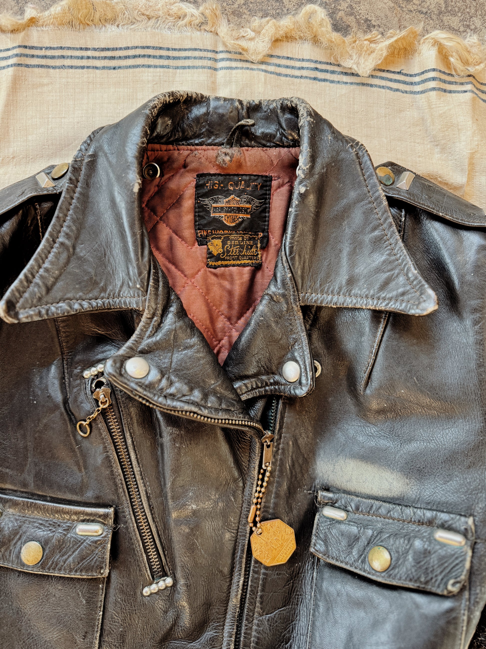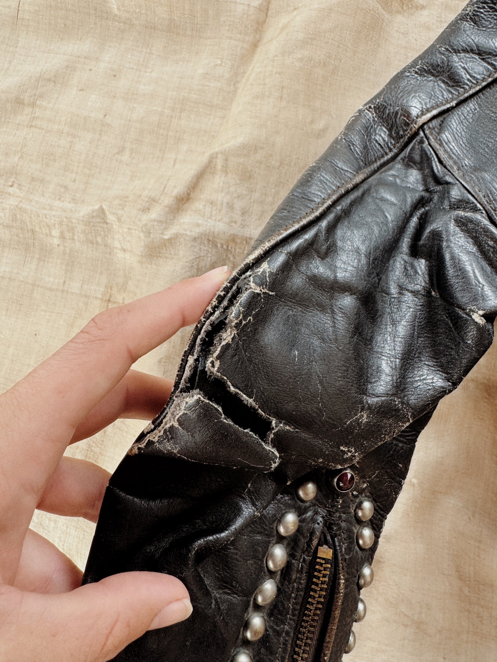 Truly incredible, 1950s Harley Davidson Cycle Queen Moto Jacket. Customized by the original owner with artwork and embellished in multiple types of studs and jewels. Worn to perfection and is super comfortable. This one is steerhide, which also offers a fuller range of movement. Has wear throughout, but most notable is a hole on the left elbow no believe this could be patched. Zippers are original and fully intact. A one of a kind, historic treasure- ready to be enjoyed for years to come.