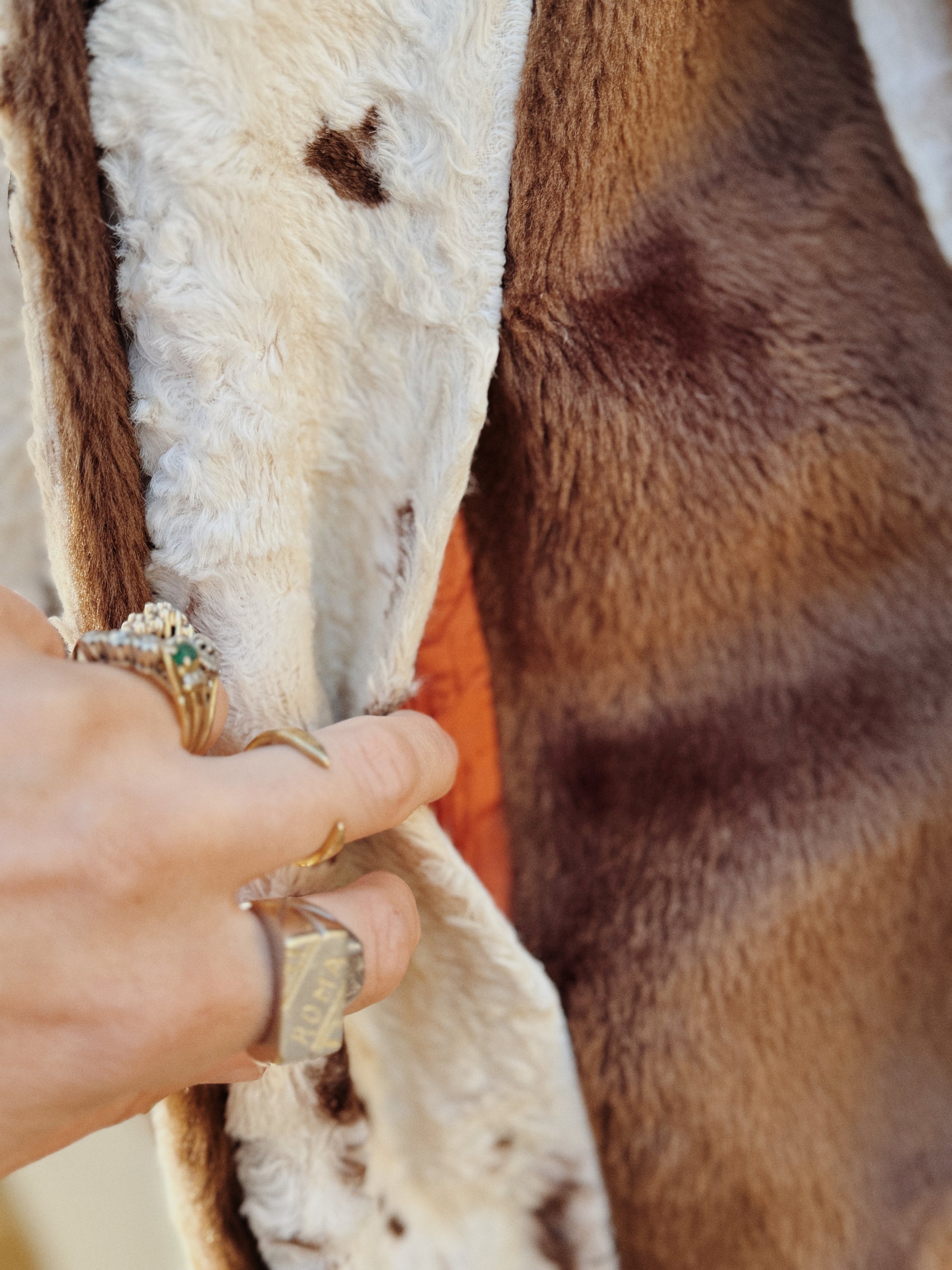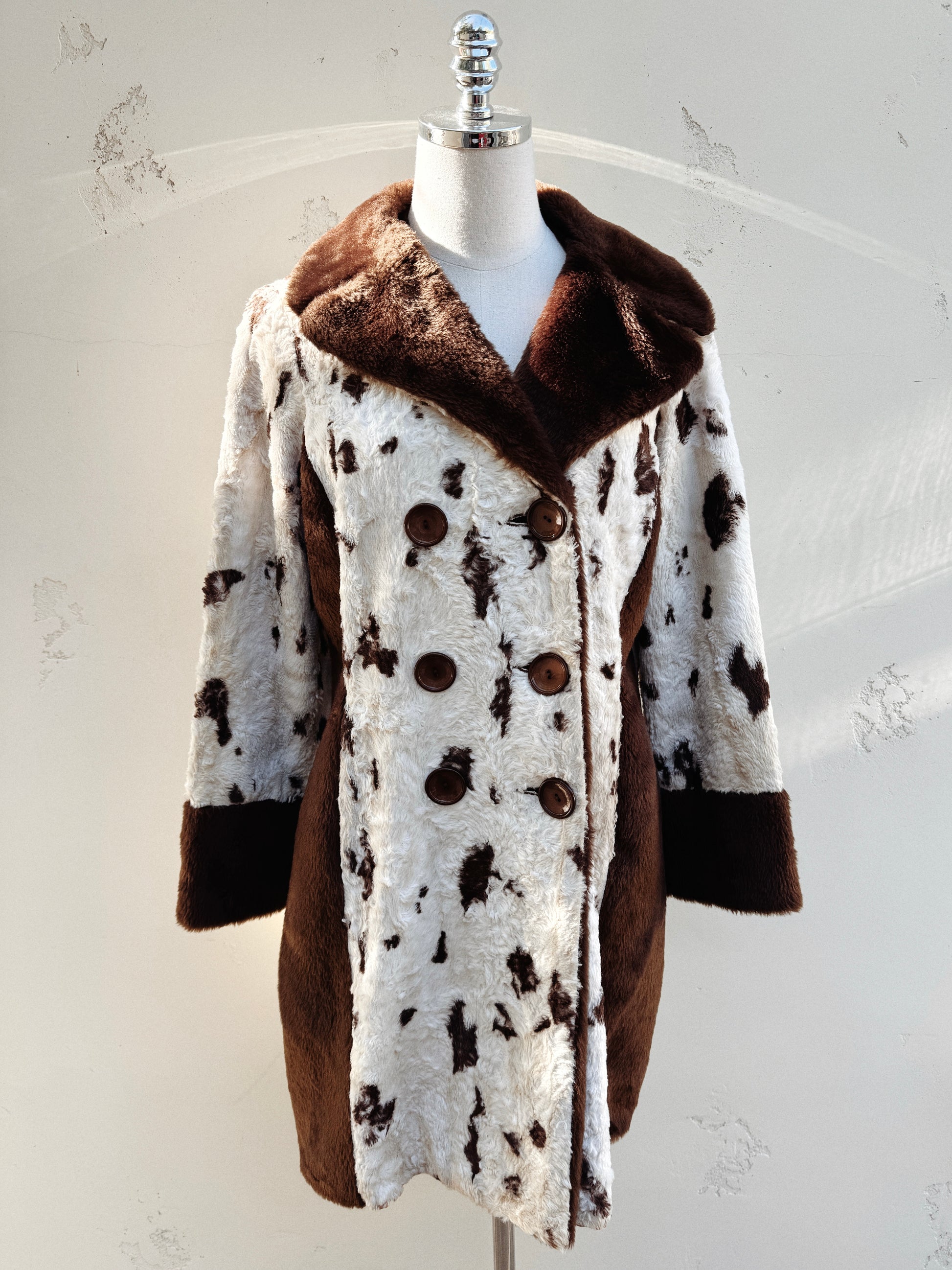 Delightful, 1960s faux fur cowhide coat with a brown fur trim. Double breasted and a nice, slightly longer hemline. I see this as being a staple of any closet, upleveling any outfit in cooler or evening weather! Honestly am sort of tempted to keep this. Just so wearable and I’ll always love a cow print. In really lovely condition. Some very faint discoloration and light wear. Presents beautifully.
