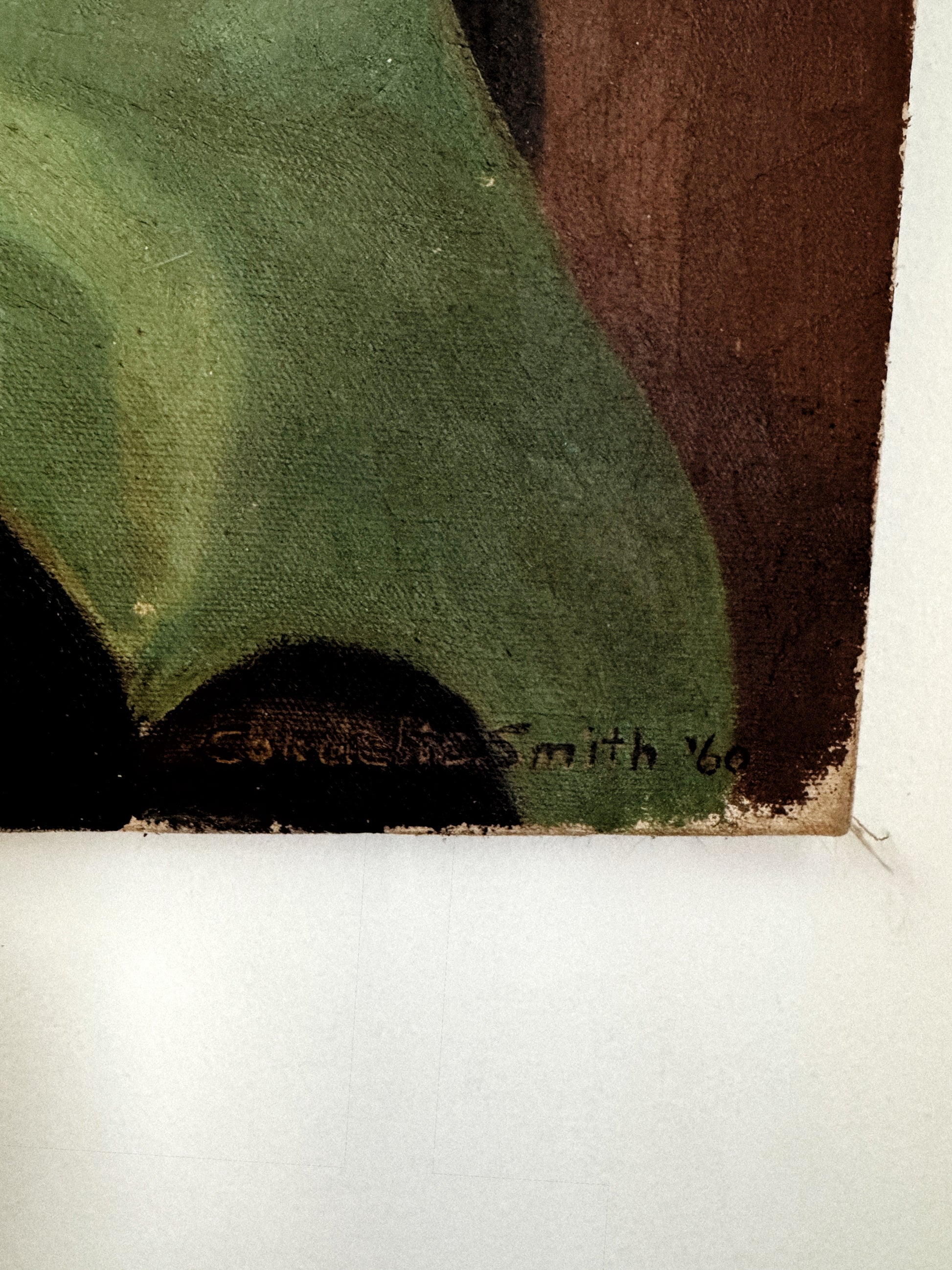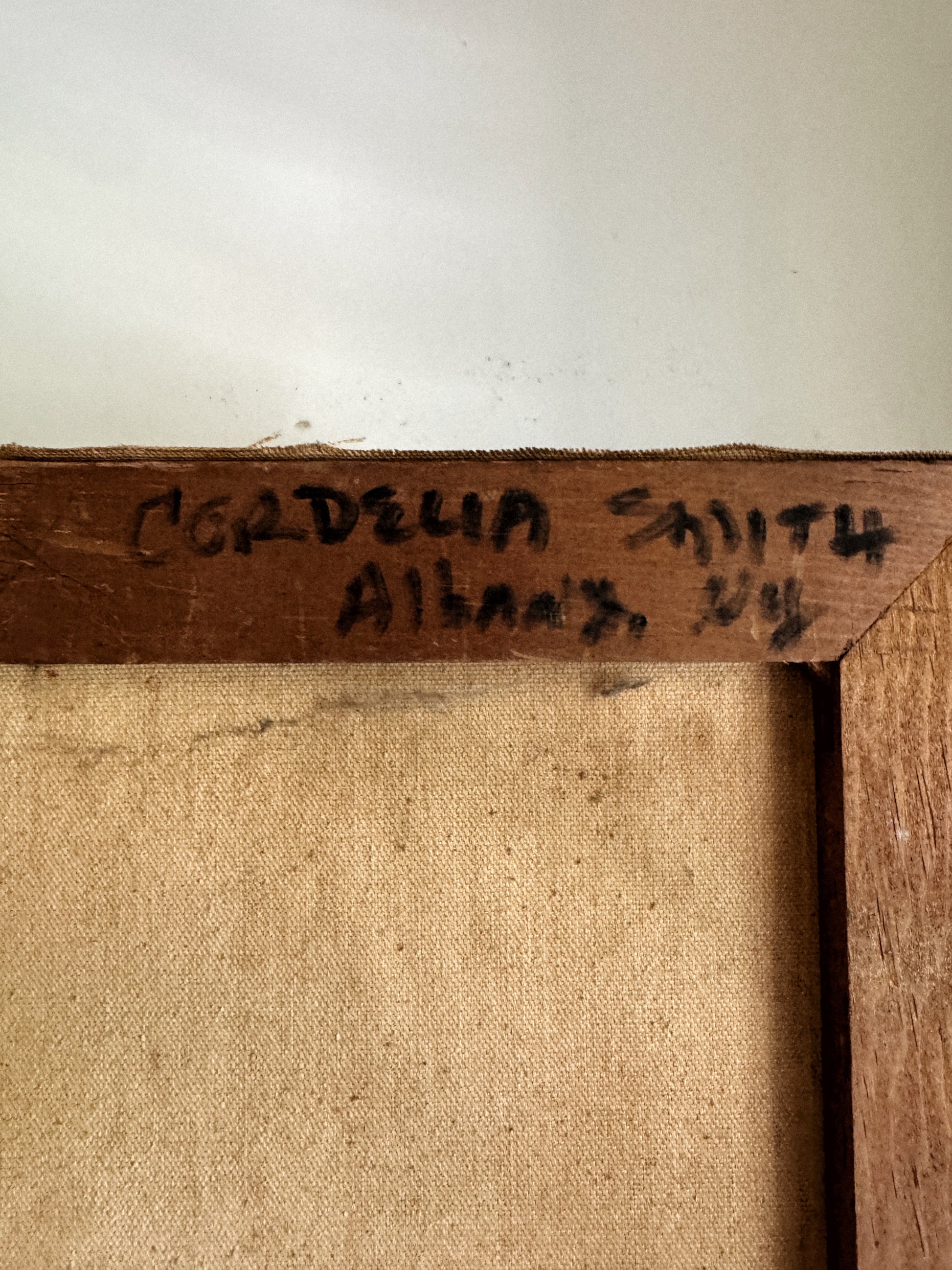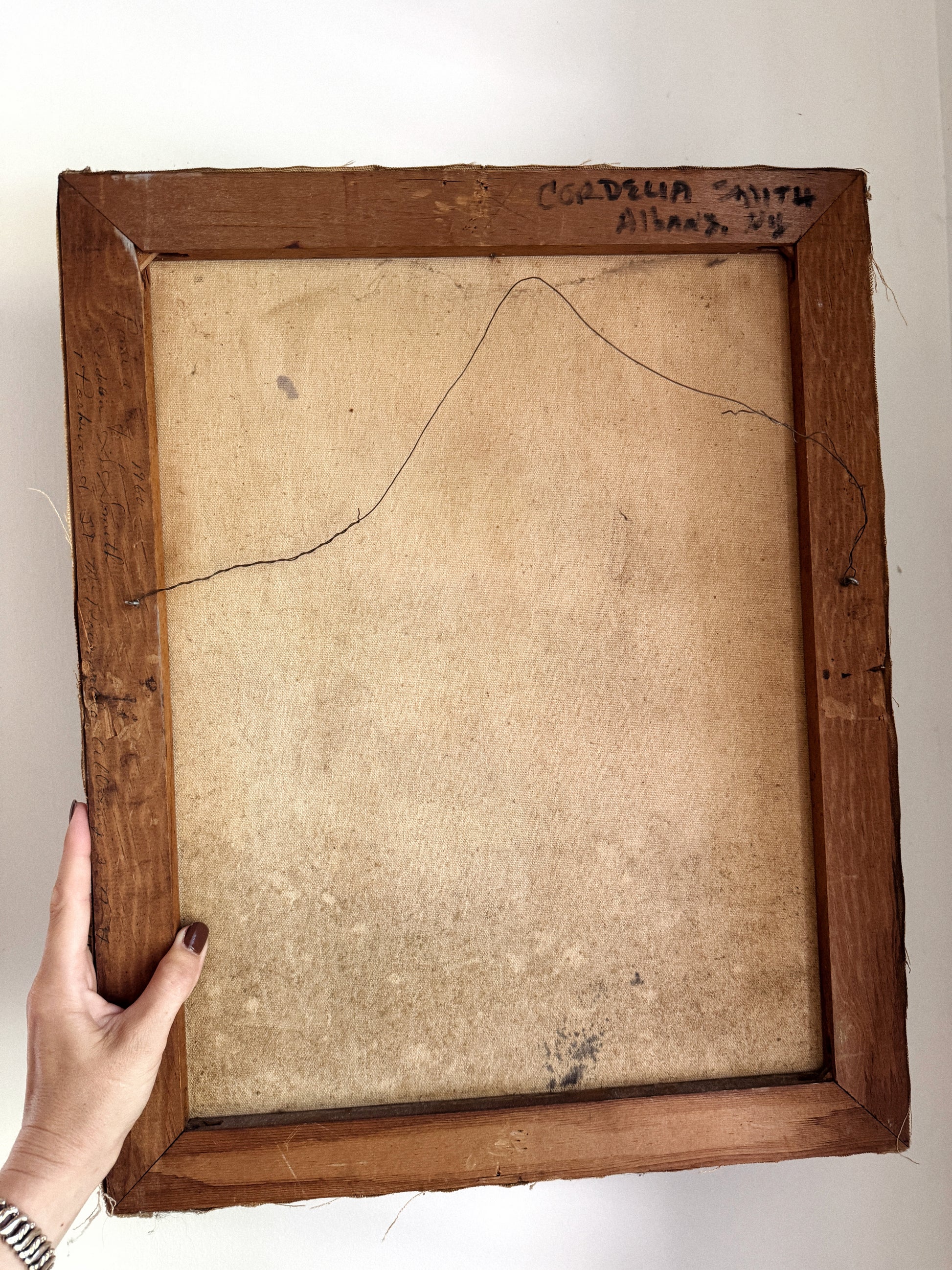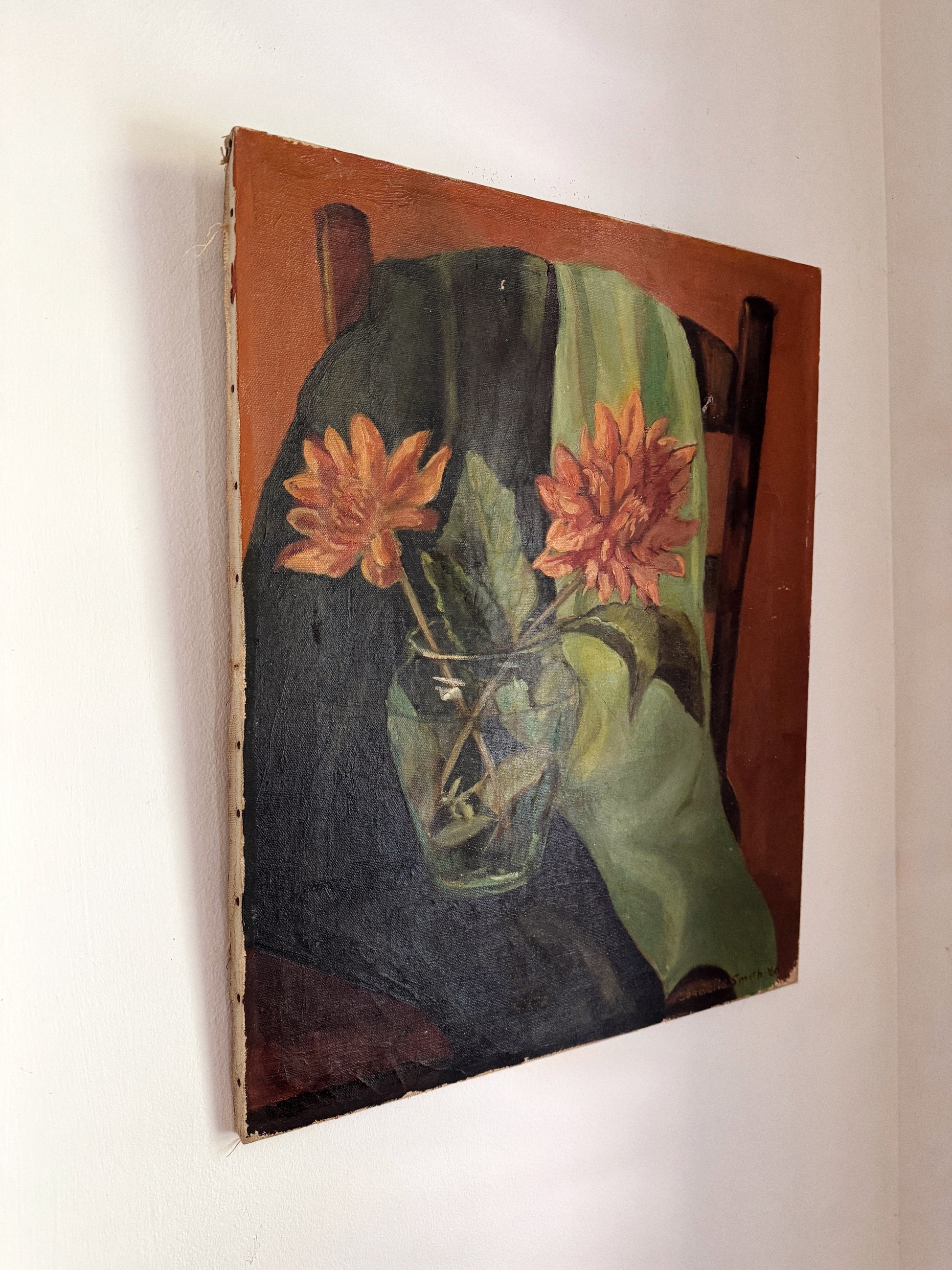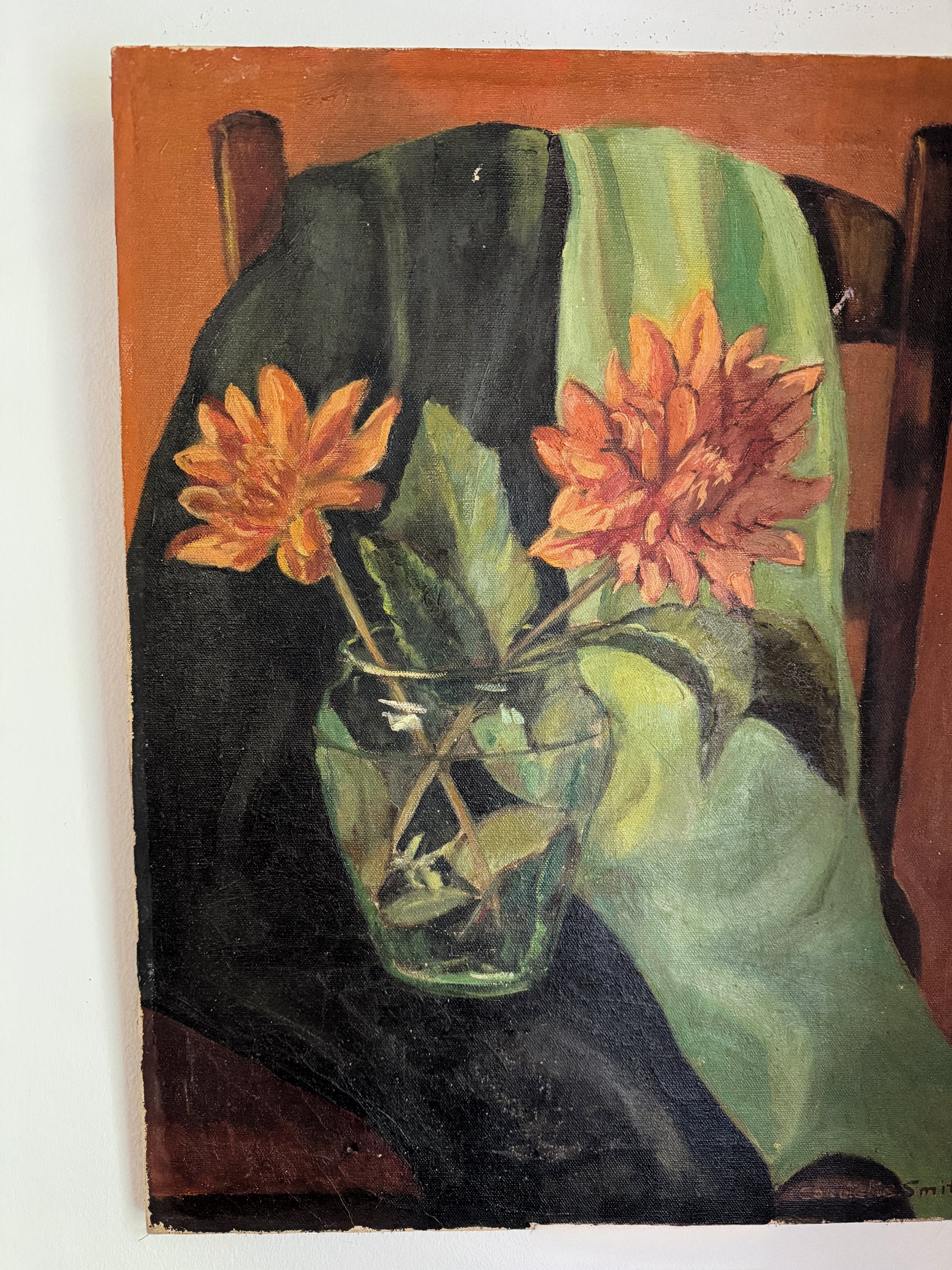 Gorgeous, 1960s burnt orange and Chartreuse green floral still life. This late midcentury piece, features beautiful orange dahlia flowers with a complimentary burnt orange background. Perfectly contrasted with the wooden chair and chartreuse and emerald green tablecloth or blanket behind it. I love looking at the stems in the water and how it reflects the light. Such a lovely piece, just looking for the right home and frame! Signed by Cordelia Smith of Albany, New York. Dated precisely 1960.