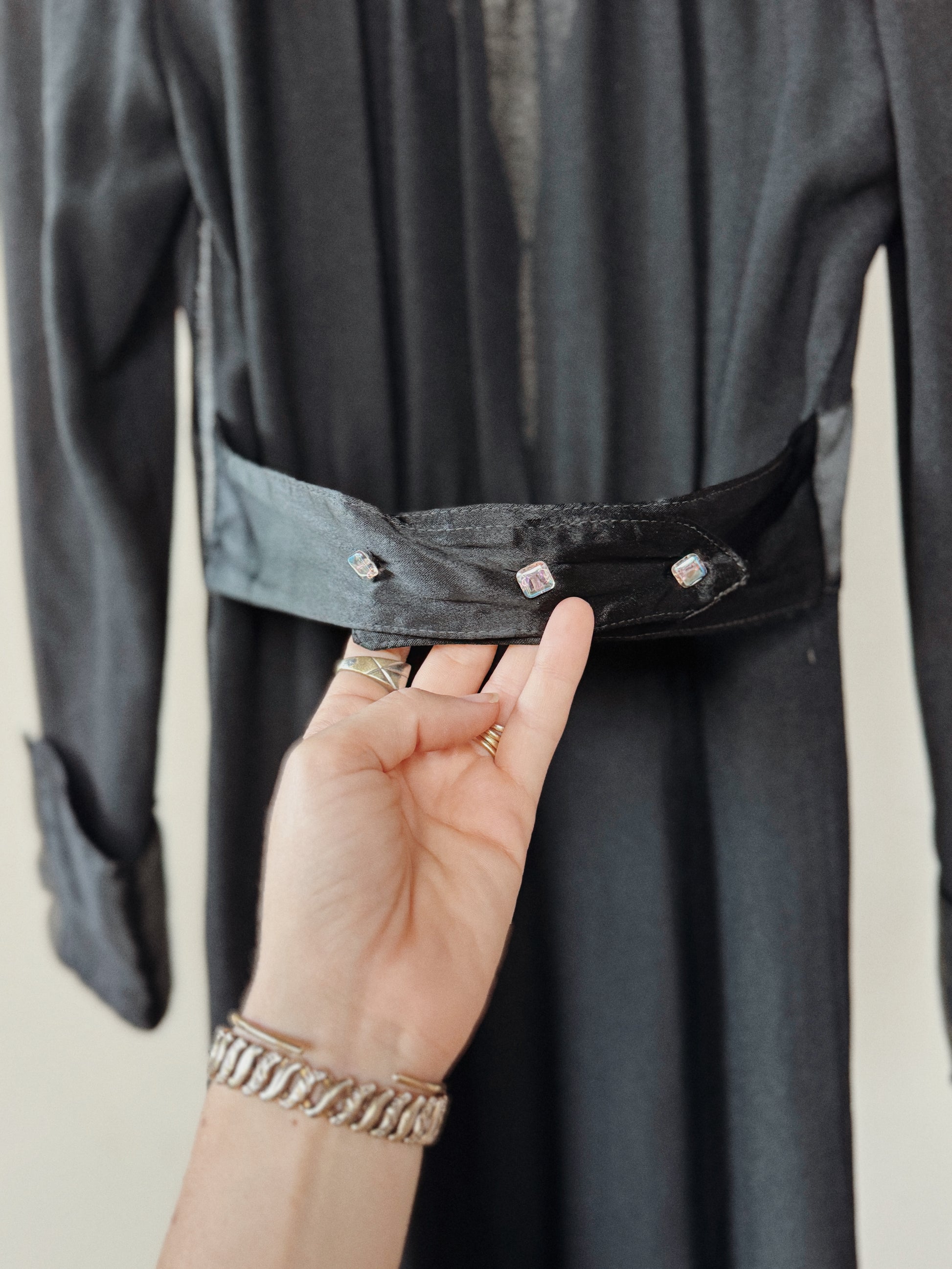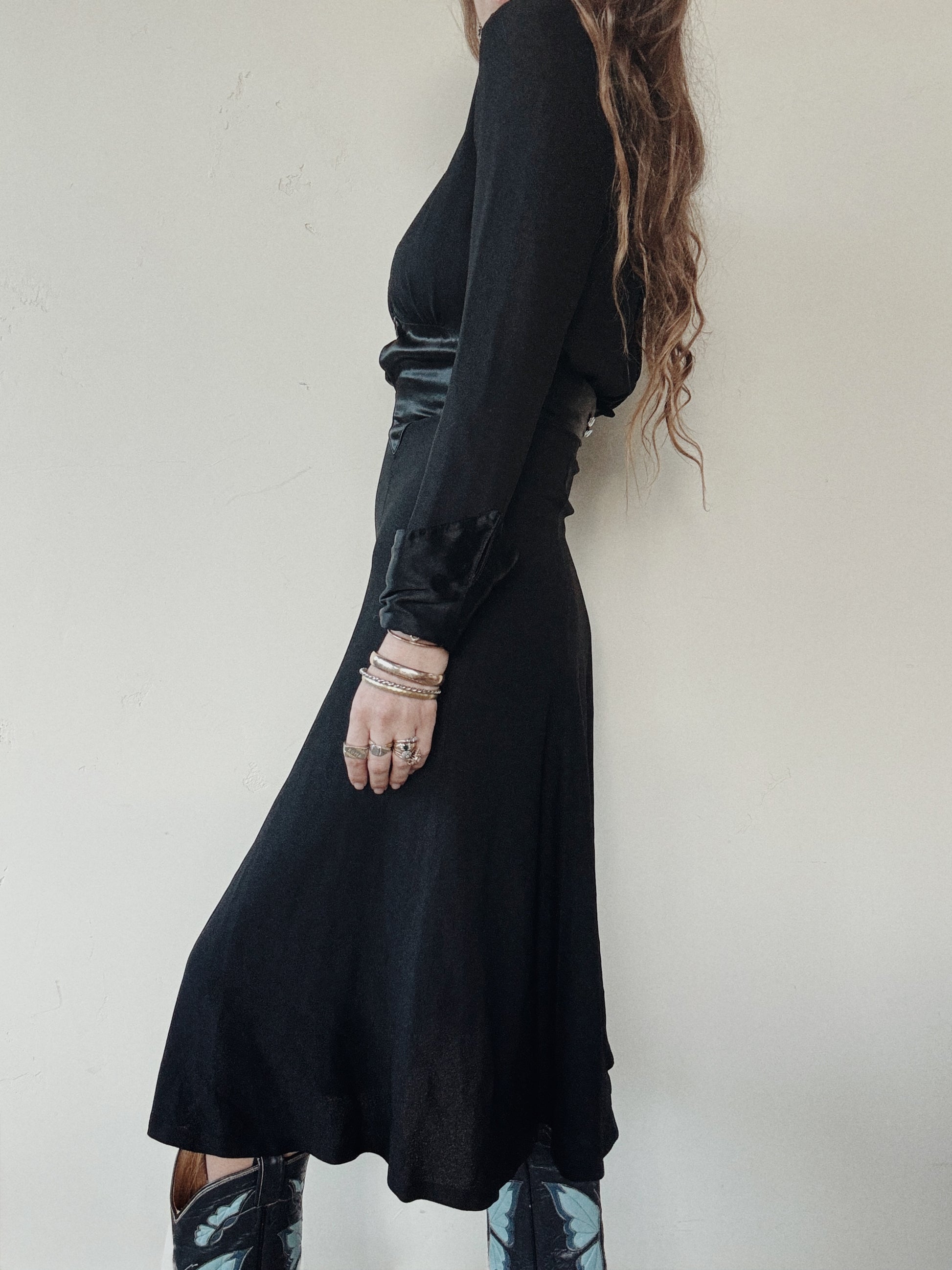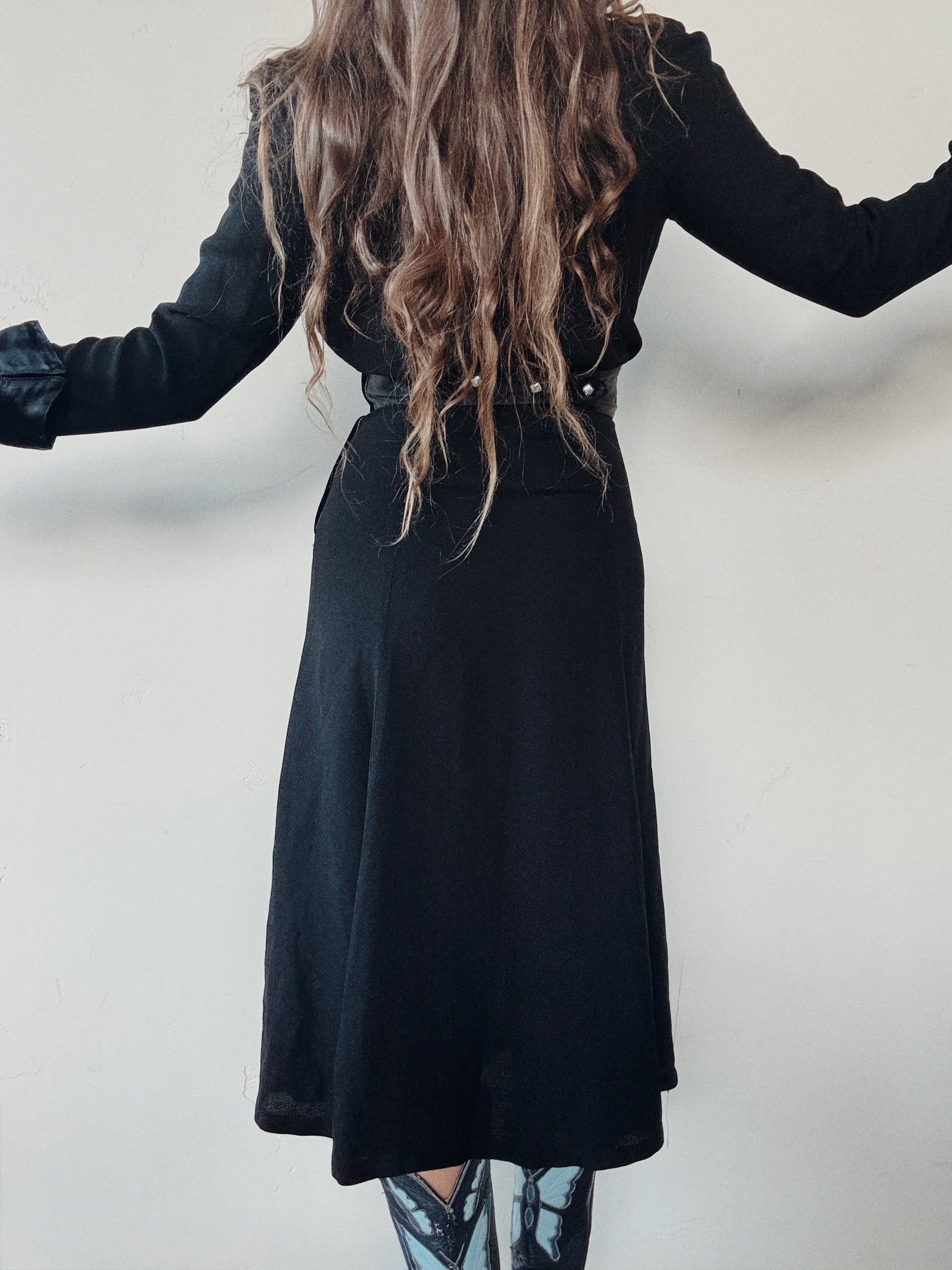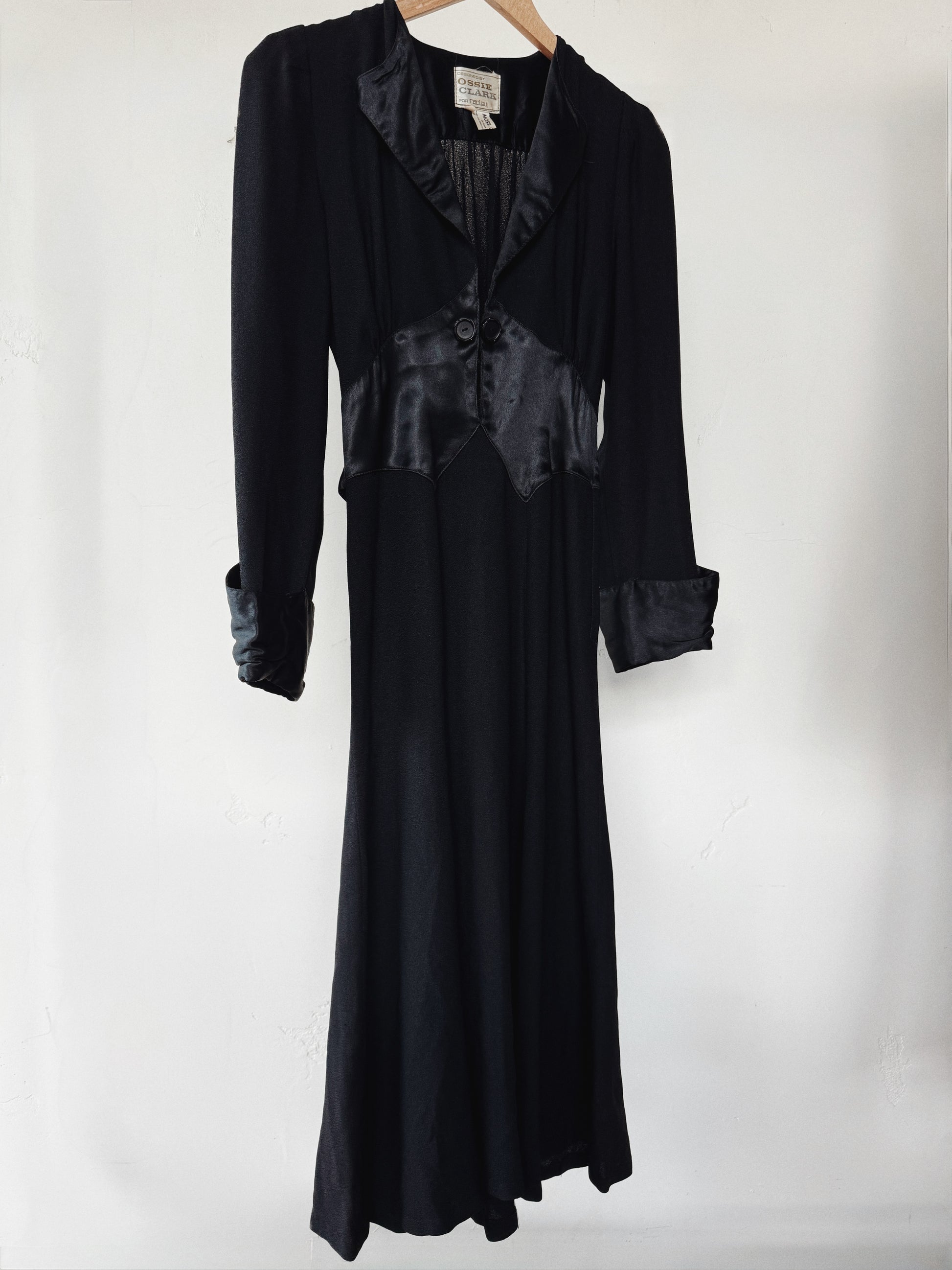 Fabulous, 1970s black rayon moss crepe dress by iconic British designer, Ossie Clark. Features a stunning, satin swiss waist + deco style cuffs, structured shoulders and an elegant drape. More of a midi cut, this dress looks fabulous with tall boots. Definitely the best midi dress you will ever wear, as the cut is so flattering.