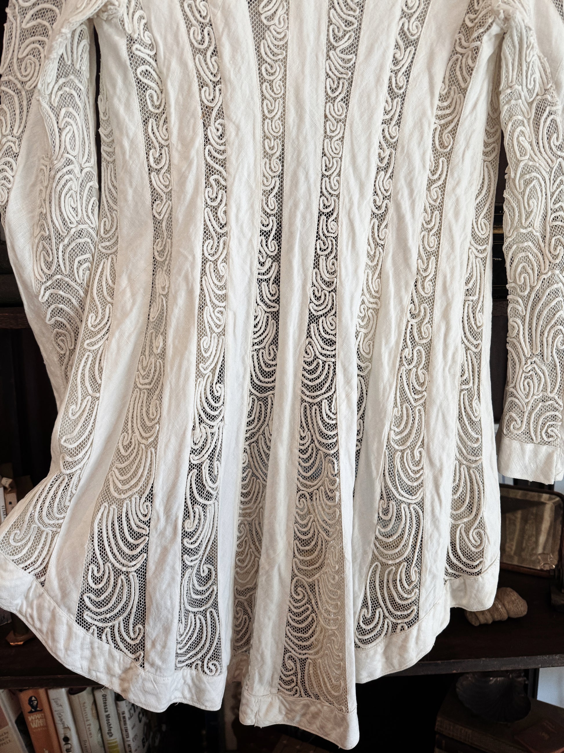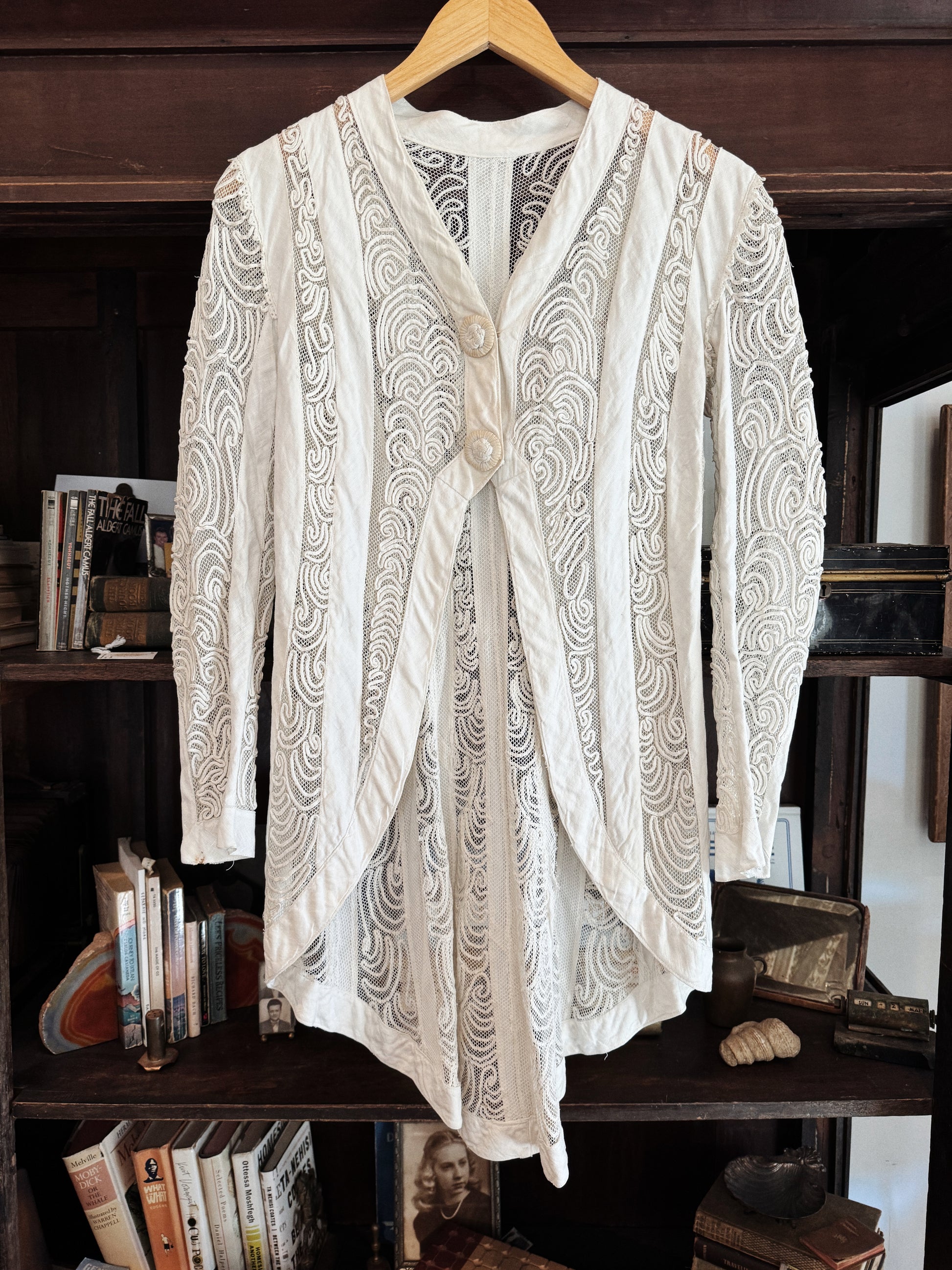 Truly magnificent, 1910s white linen and net walking jacket with soutache details. Dramatic high low cut, almost the feminine version of a coat with tails. Can think of so many ways to style this beauty! In lovely condition for her age. I’ve reinforce the original hook and eye closures. There is some slight discoloration on the front buttons, as well as a small rust mark on the sleeve cuff. Overall though, just stunning- and strong too!