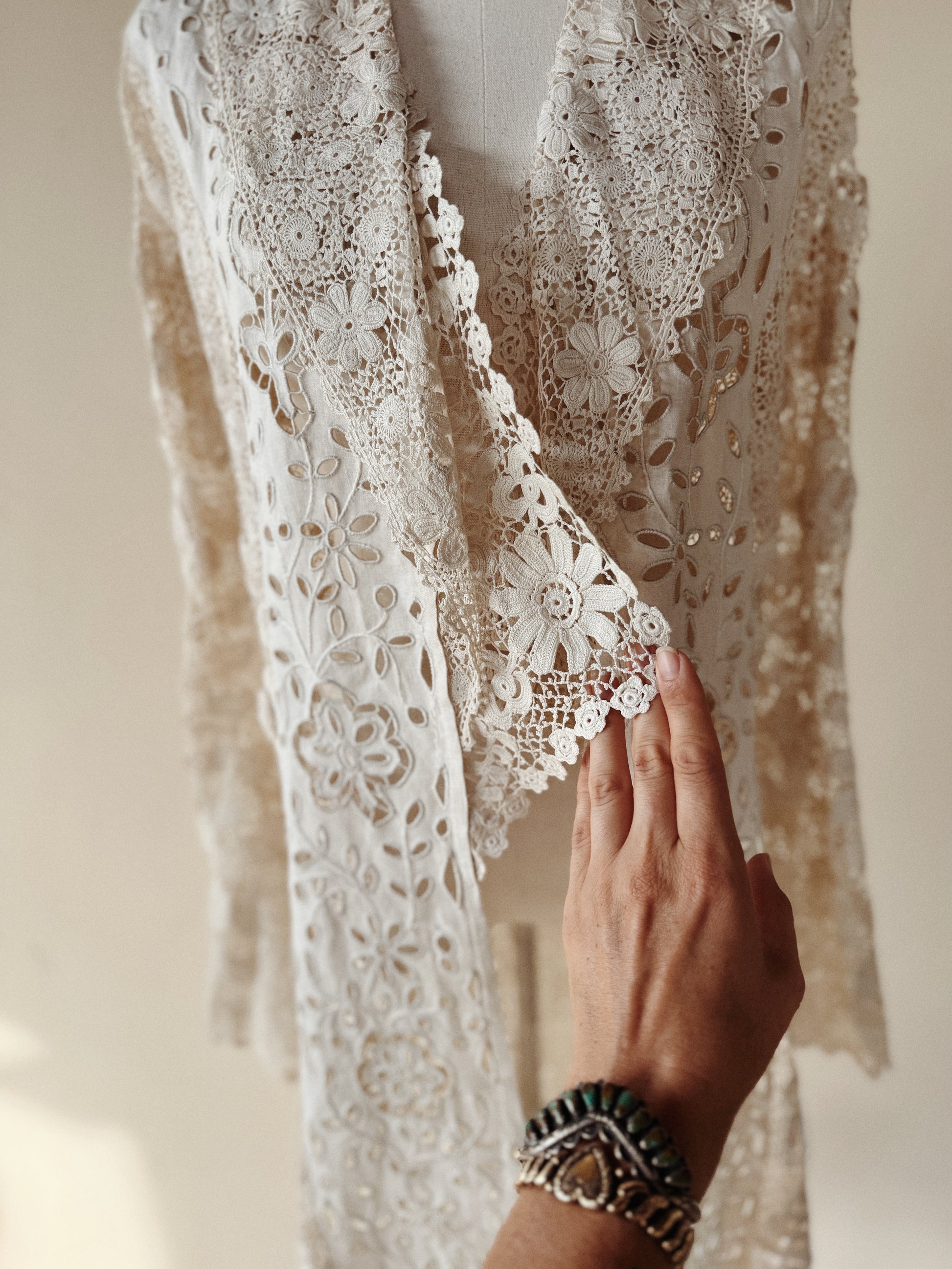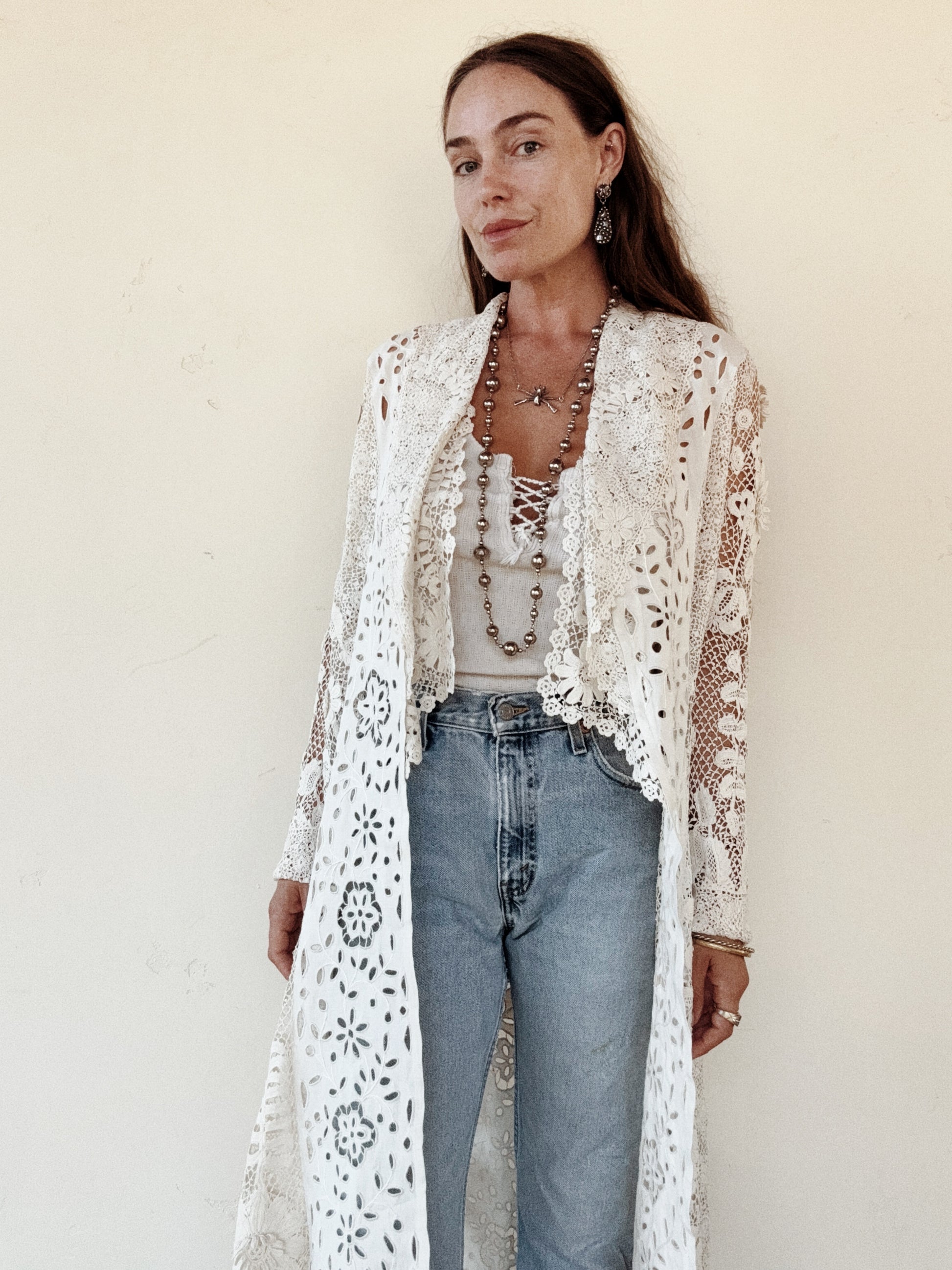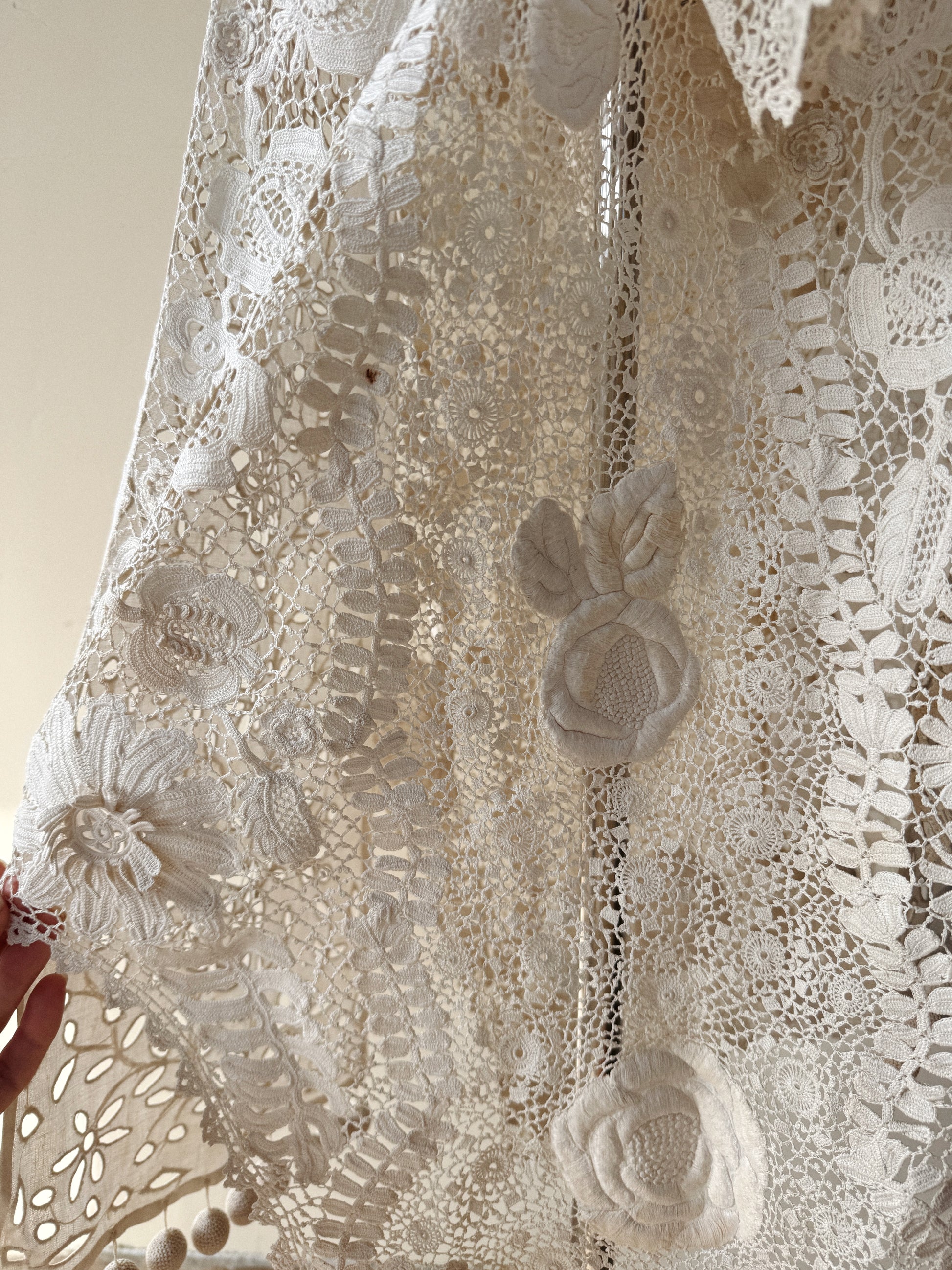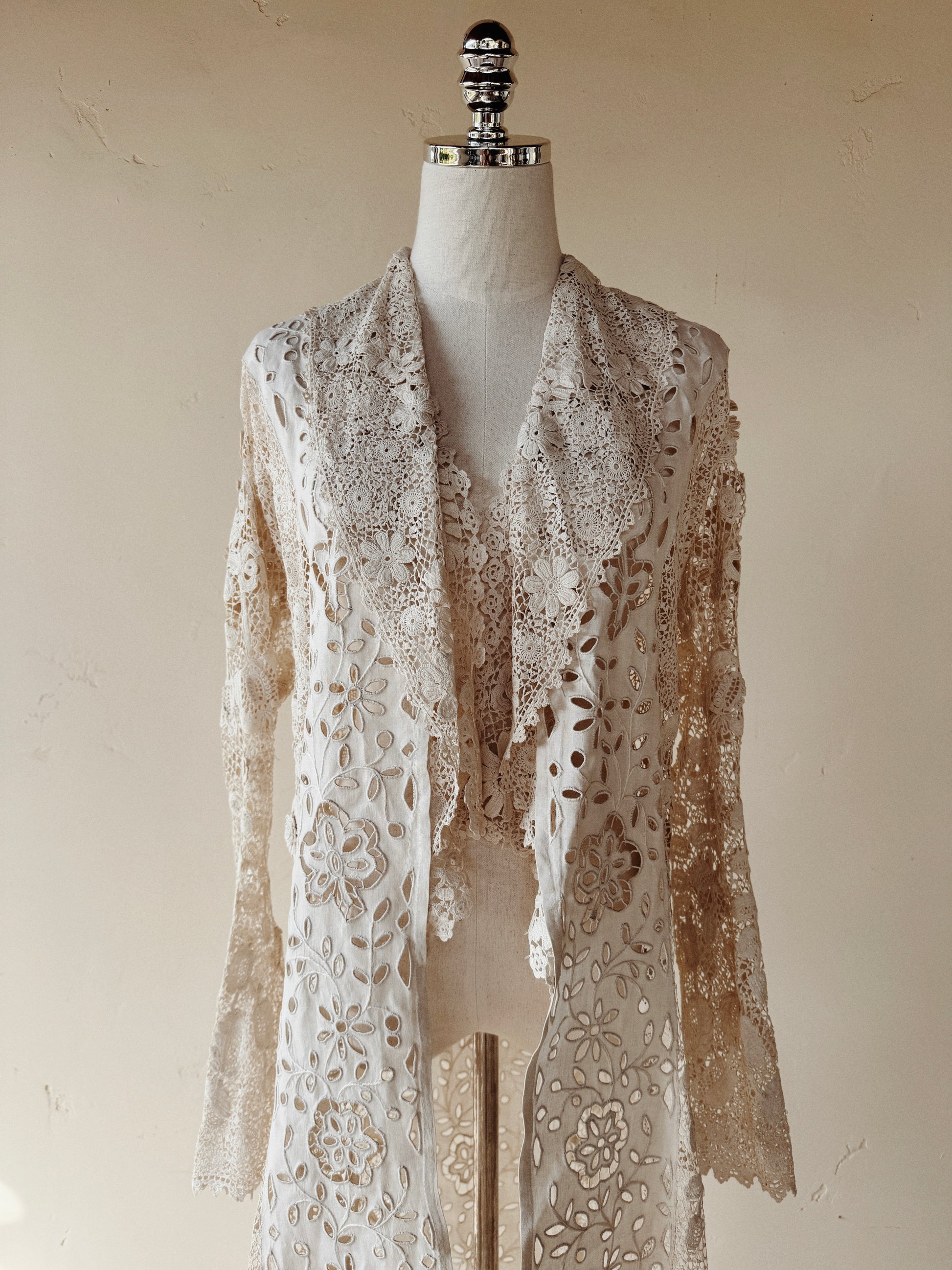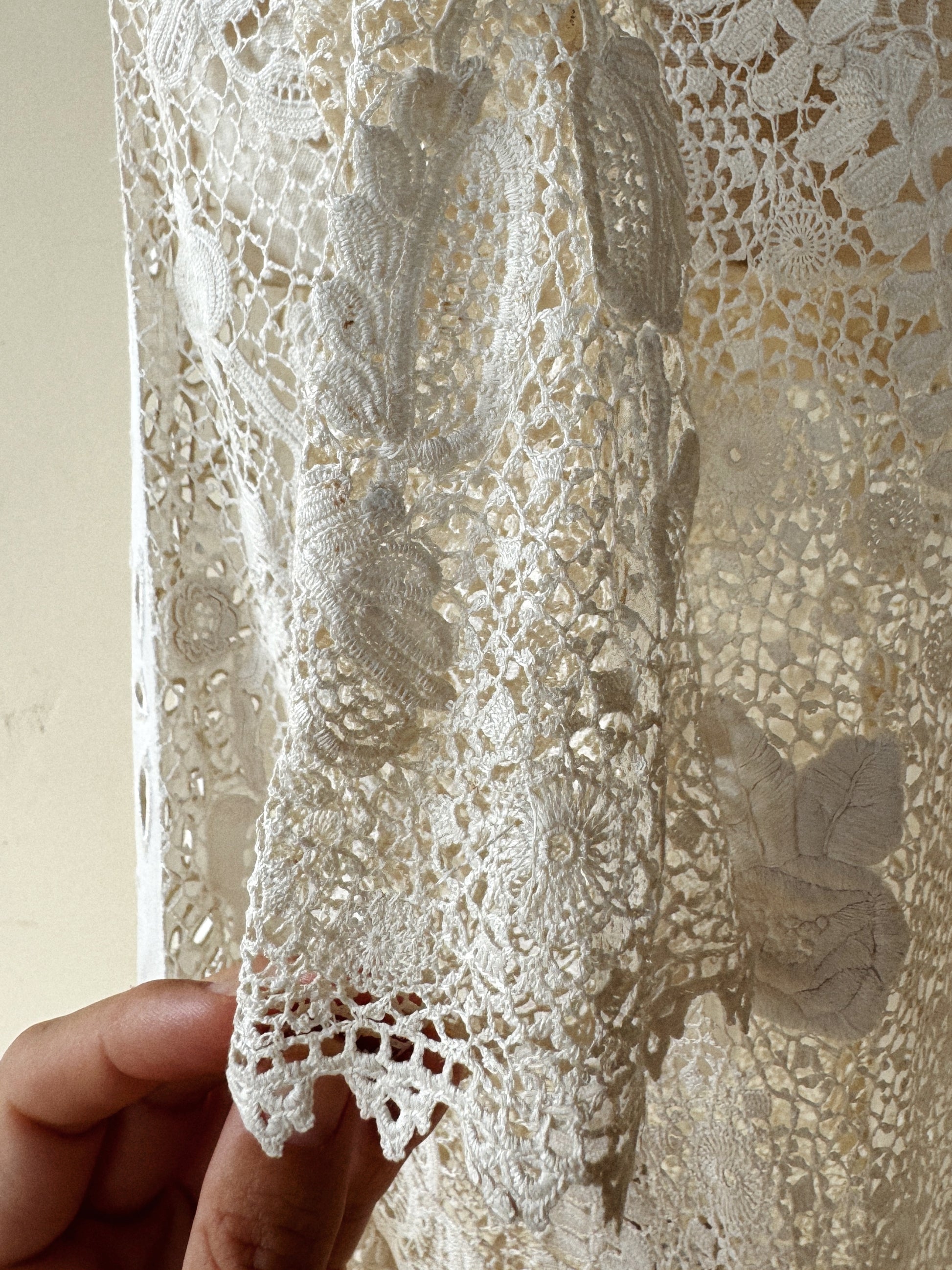 Utterly exquisite, early 1900s Edwardian Irish crochet and linen duster coat. This incredibly rare piece, features an extraordinary amount of hand done, Irish crochet. Exhibiting 3D florals and crocheted pom poms that pleasurably dangle and dance from the three starched linen panels in the front and back. There are also two internal crocheted lapels that create a beautiful texture at the bust, or could even be attached via a snap, as shown in modeled photos. According to the woman I acquired this from, she said this piece was found in a chest in its original tissue. Appears almost completely unworn and bears just a few tiny marks from storage. In truly incredible condition. Best for a size medium, though could definitely fit a bit smaller. The sleeves are quite long and could either be worn long or perhaps very delicately cuffed. Can be worn and styled so many ways. This is a once in a lifetime, heirloom piece, that can be loved and enjoyed for years to come.