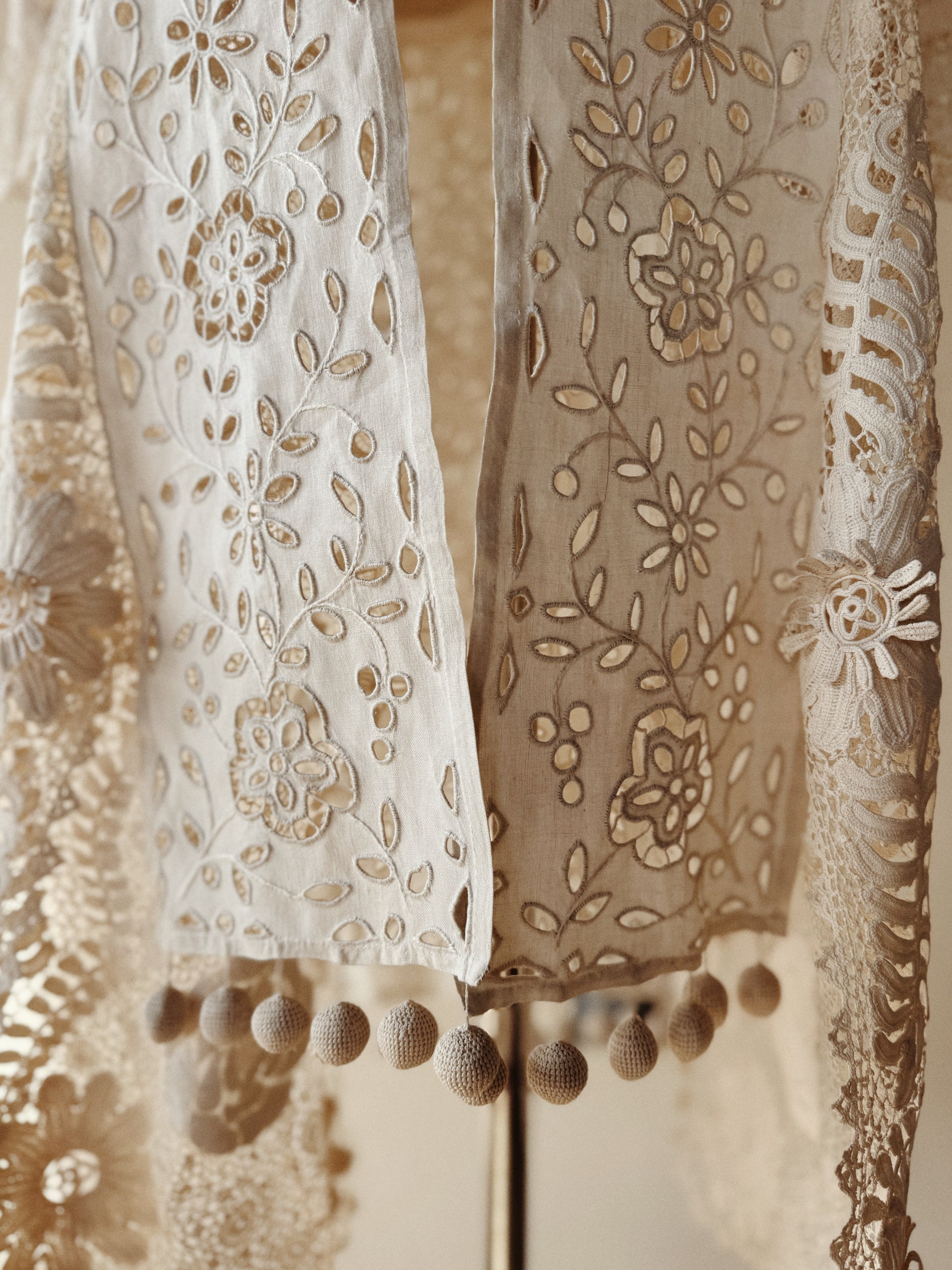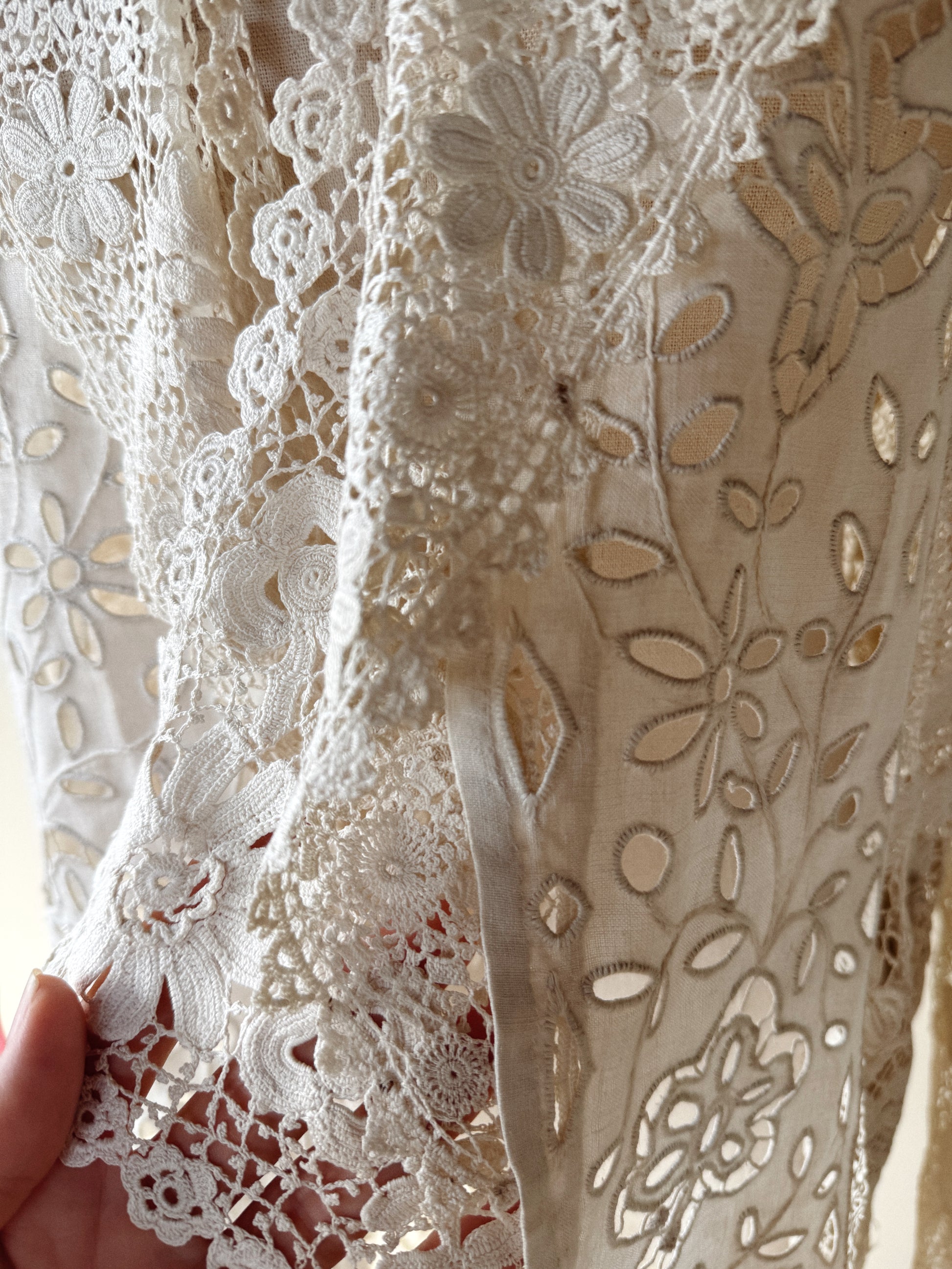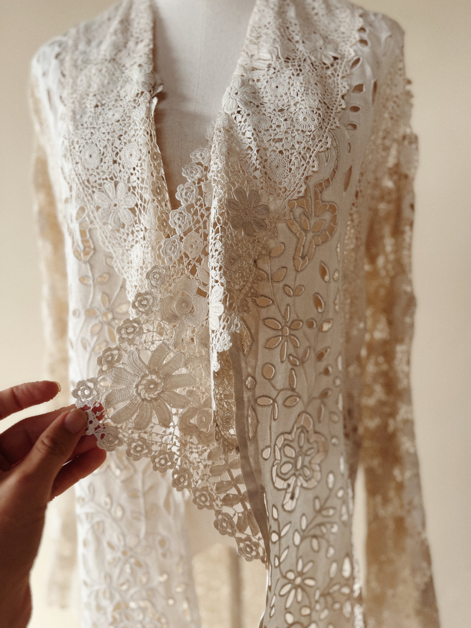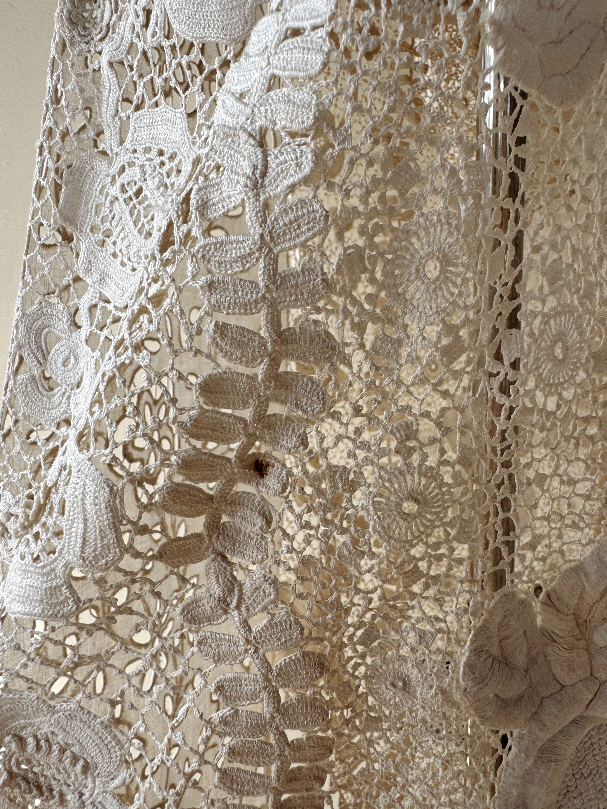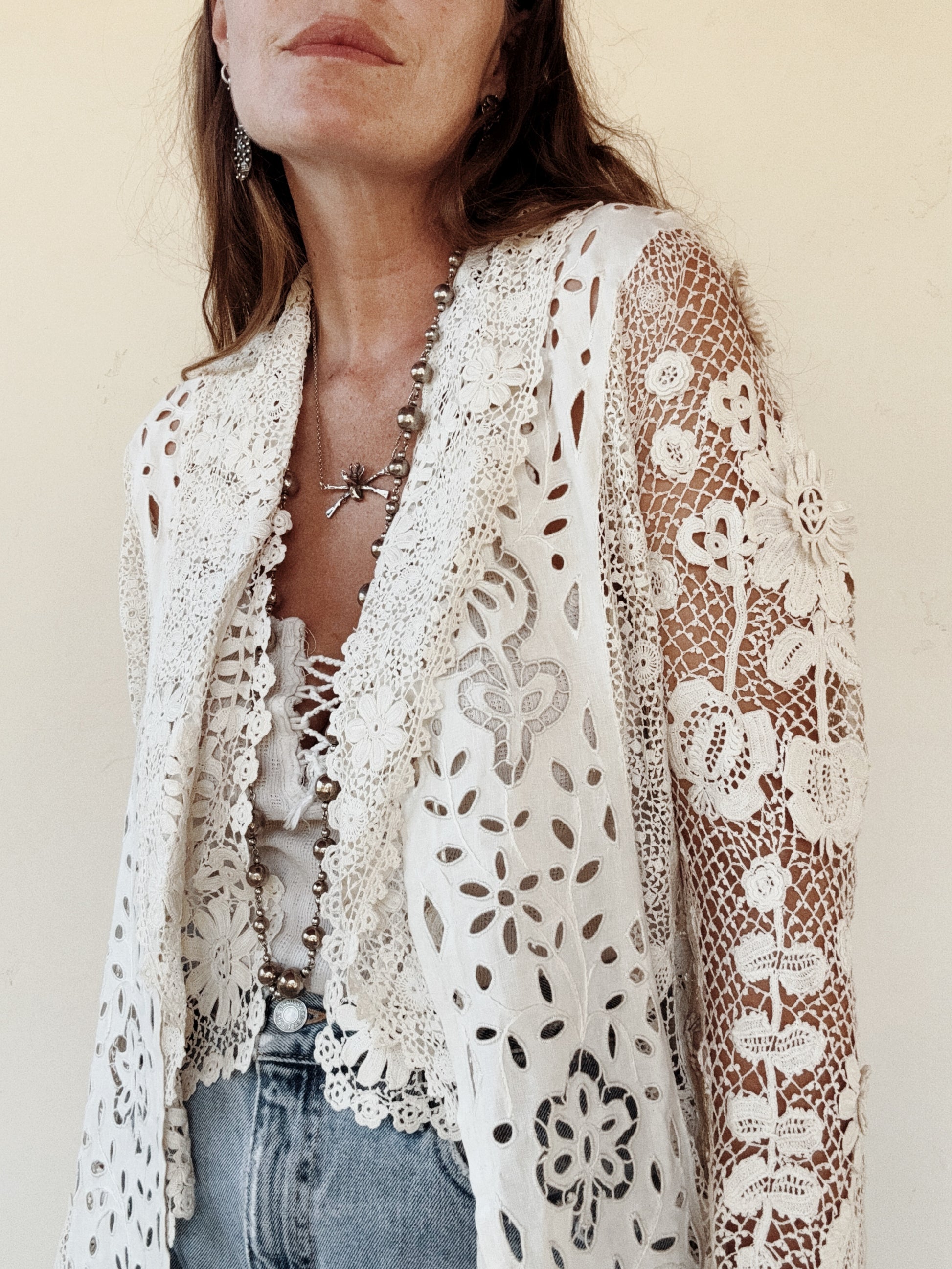 Utterly exquisite, early 1900s Edwardian Irish crochet and linen duster coat. This incredibly rare piece, features an extraordinary amount of hand done, Irish crochet. Exhibiting 3D florals and crocheted pom poms that pleasurably dangle and dance from the three starched linen panels in the front and back. There are also two internal crocheted lapels that create a beautiful texture at the bust, or could even be attached via a snap, as shown in modeled photos. According to the woman I acquired this from, she said this piece was found in a chest in its original tissue. Appears almost completely unworn and bears just a few tiny marks from storage. In truly incredible condition. Best for a size medium, though could definitely fit a bit smaller. The sleeves are quite long and could either be worn long or perhaps very delicately cuffed. Can be worn and styled so many ways. This is a once in a lifetime, heirloom piece, that can be loved and enjoyed for years to come.