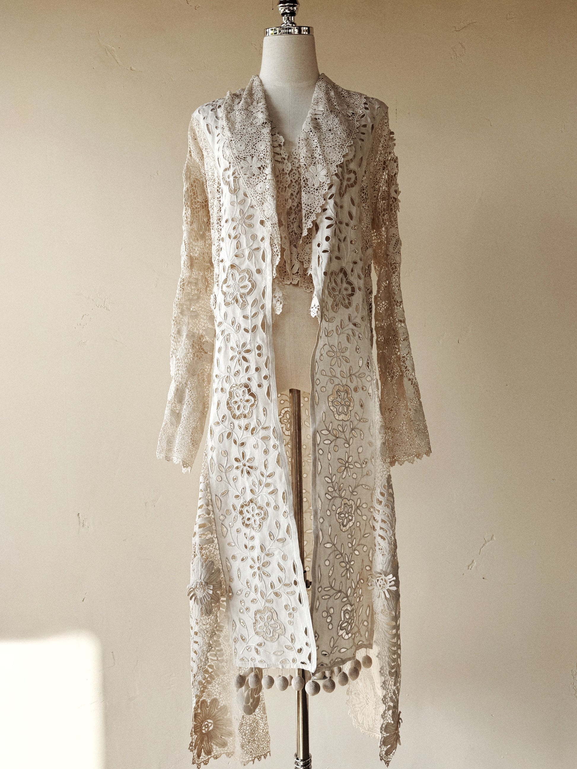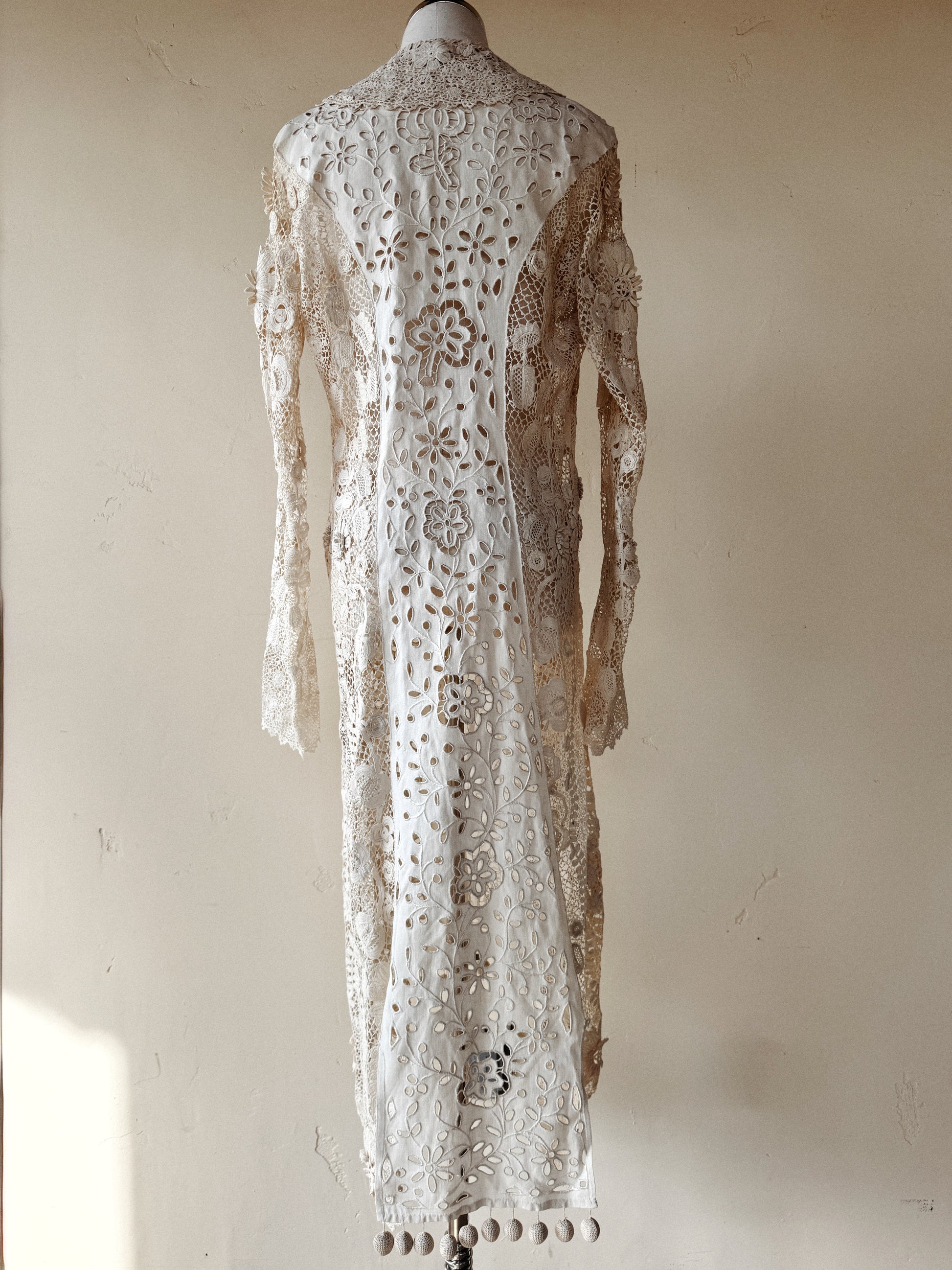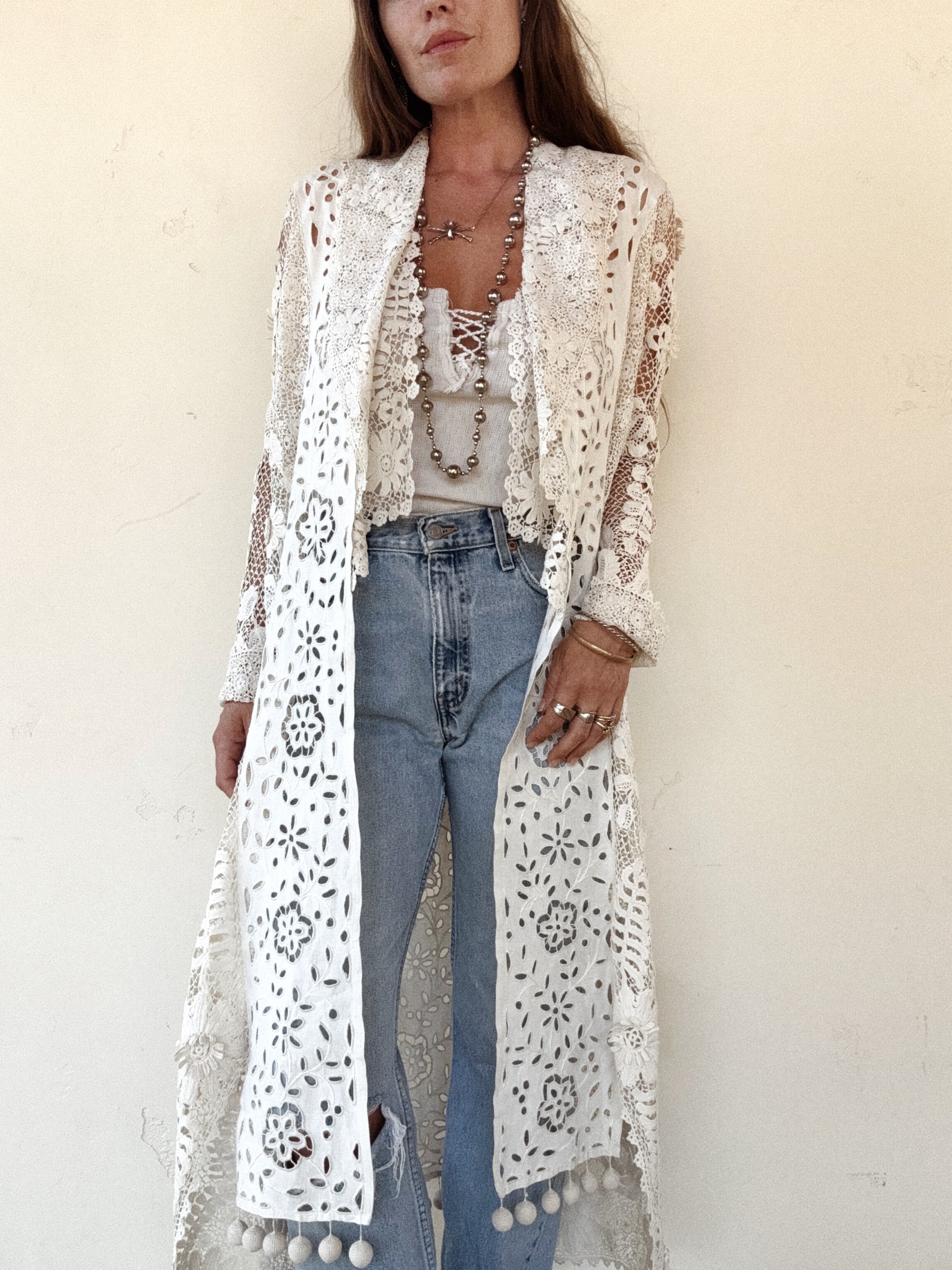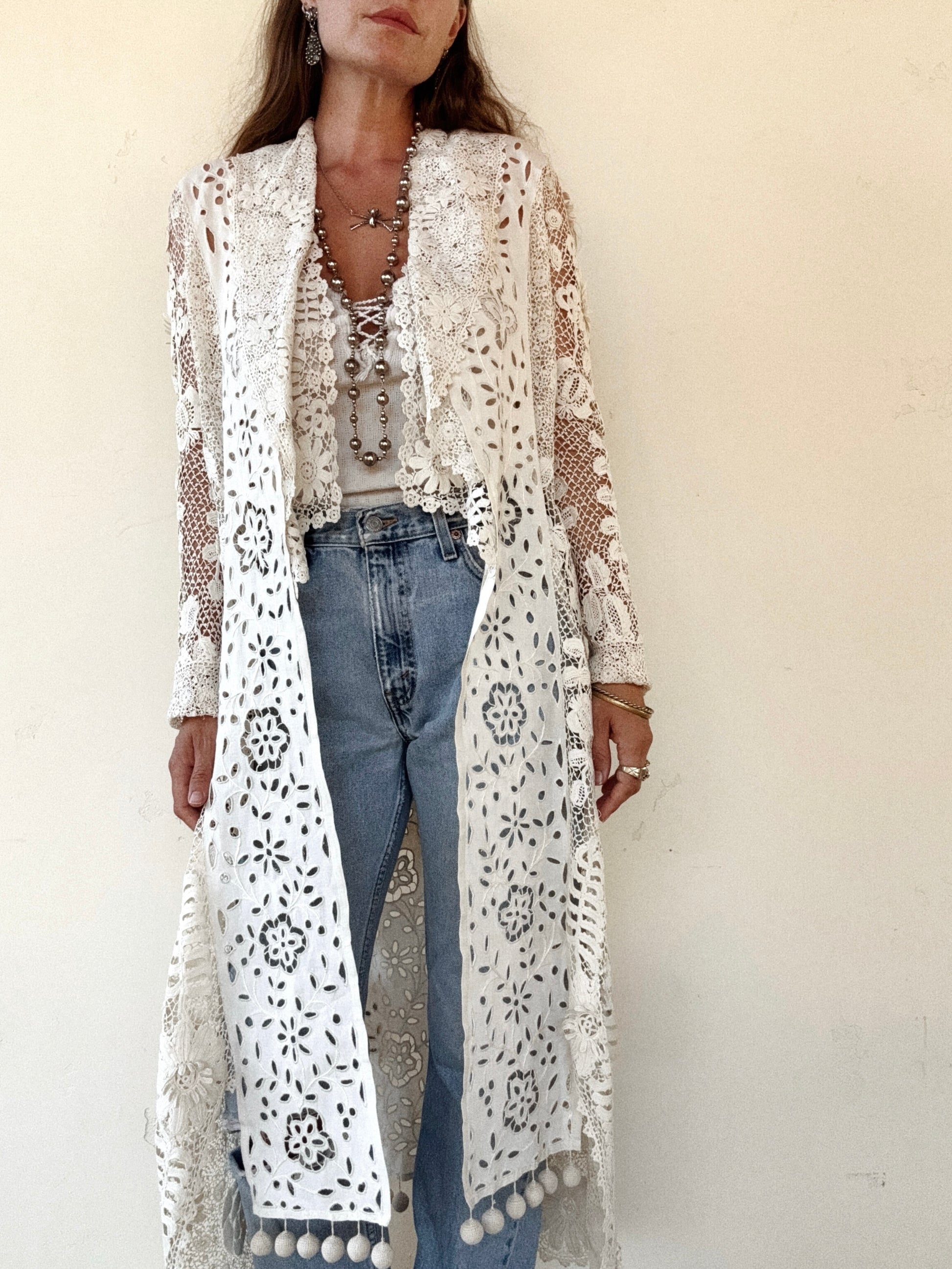 Rare Edwardian Irish Crochet Duster Coat w/ Pom Poms- M